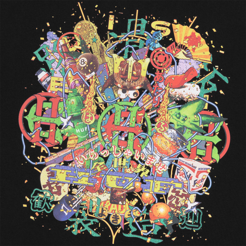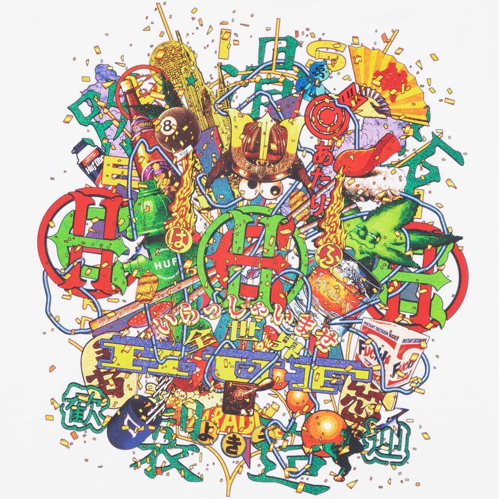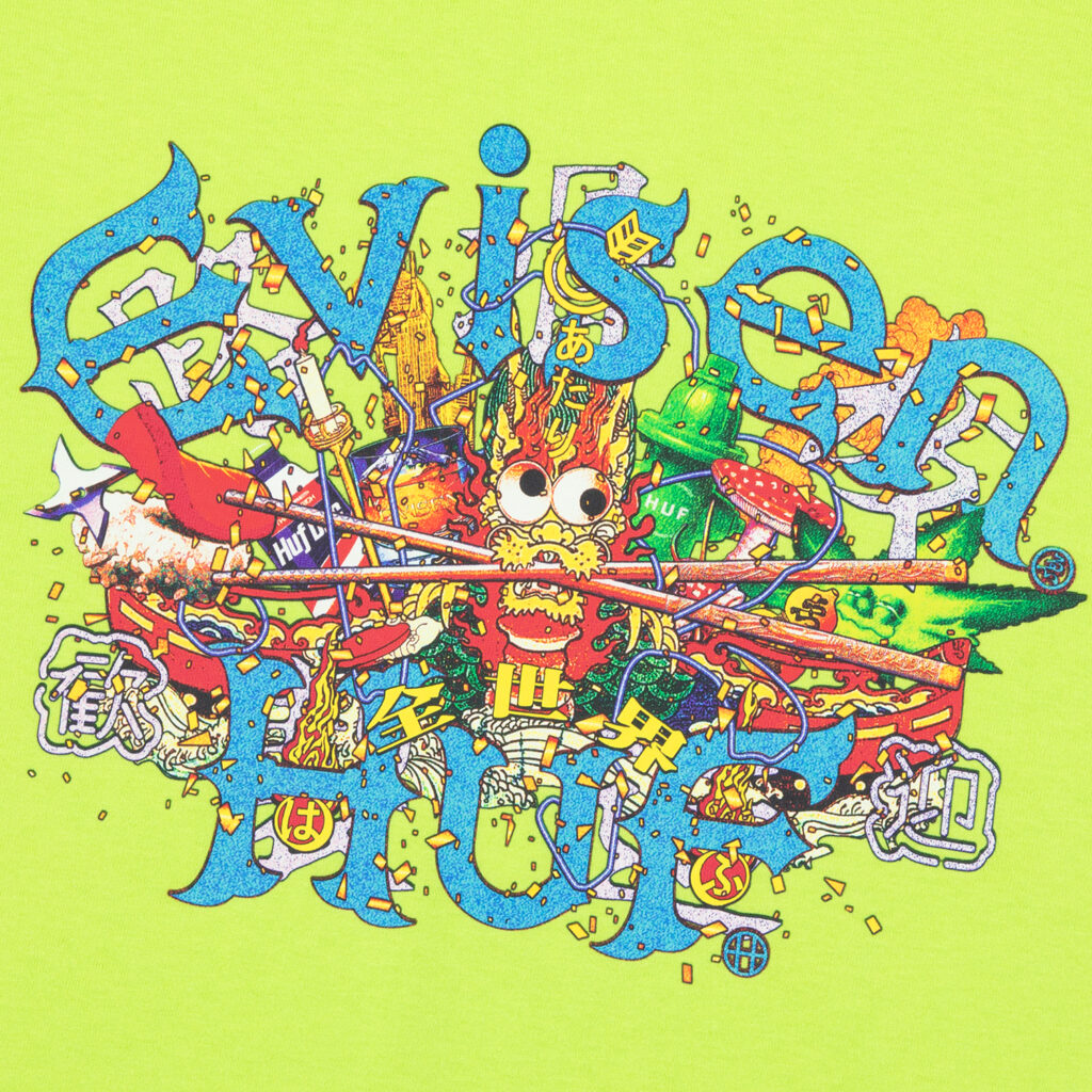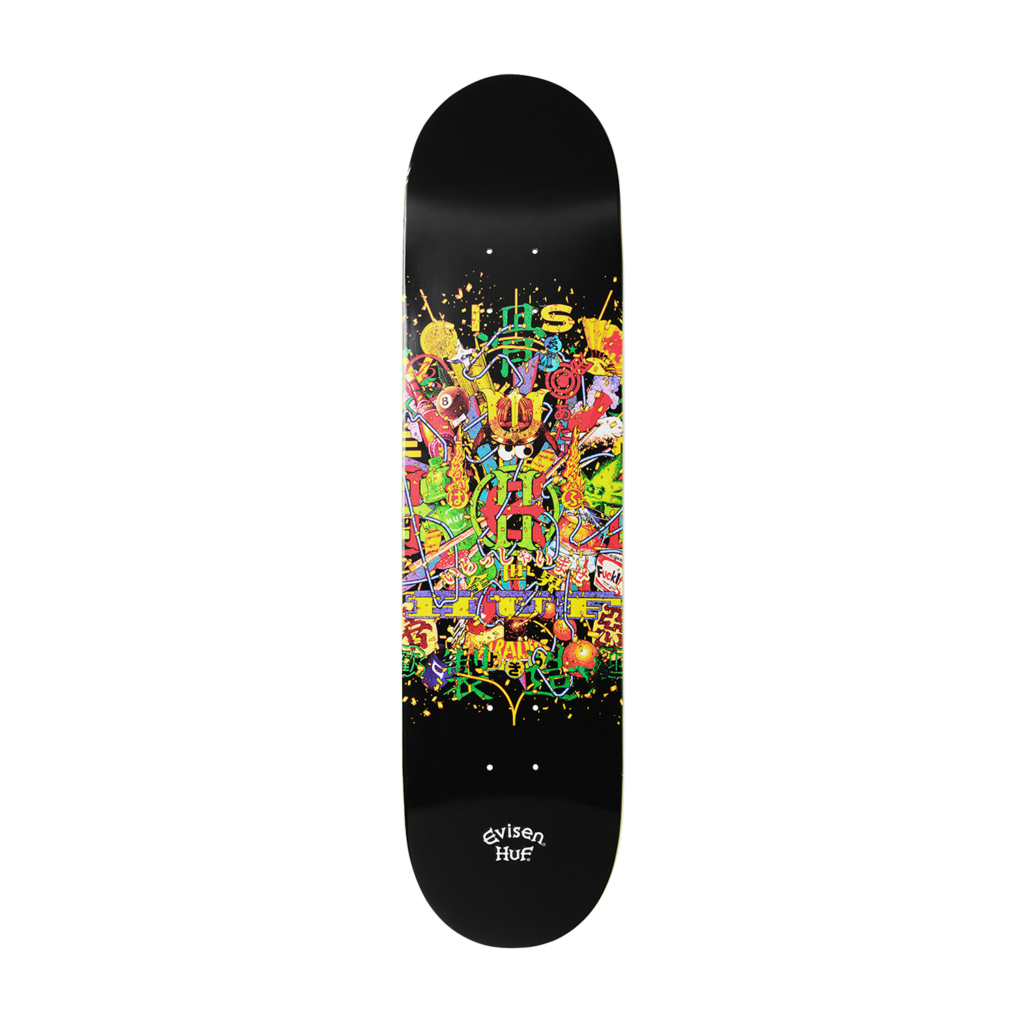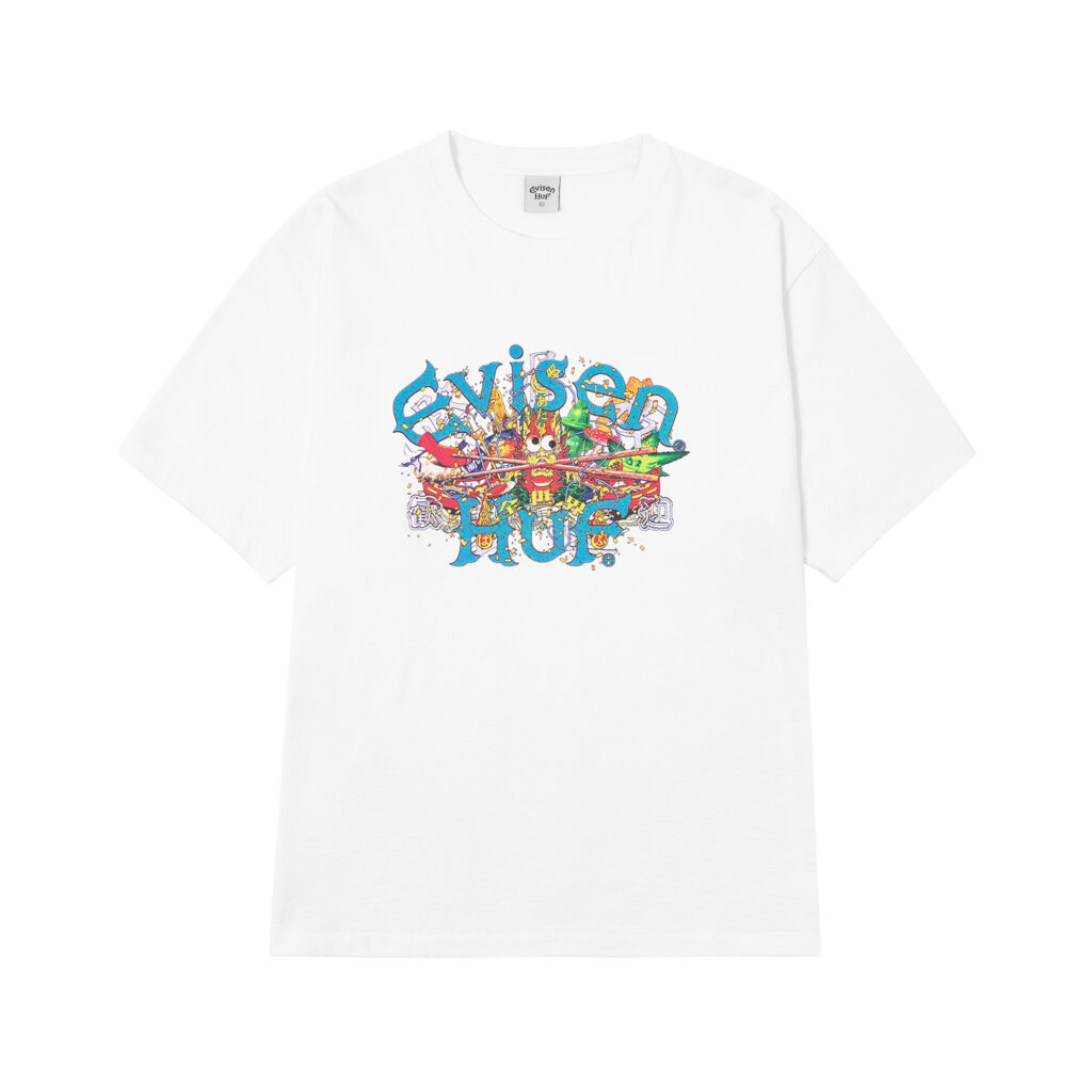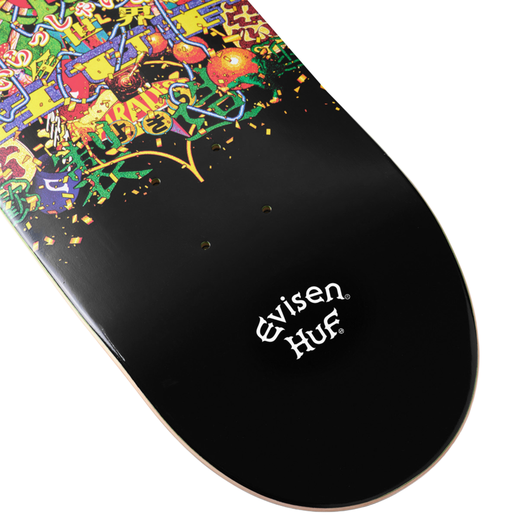 Evisen Skateboardsが得意とする日本文化への独自の視点と、HUFが追求する革新的なストリートデザインを融合し、両者のクルーが時空や国境を越えて交わる架空の都市・EVICITYをコンセプトに据えた。