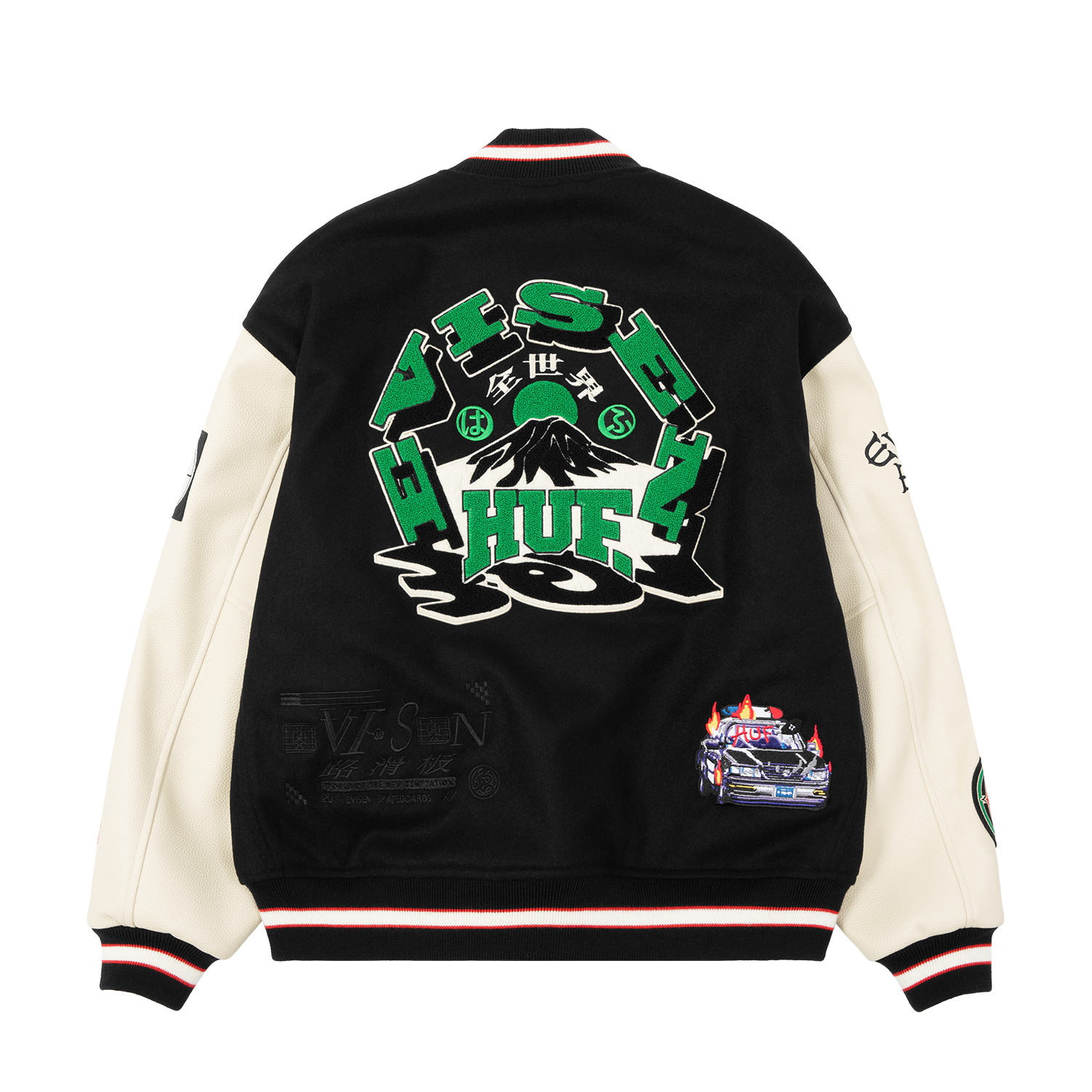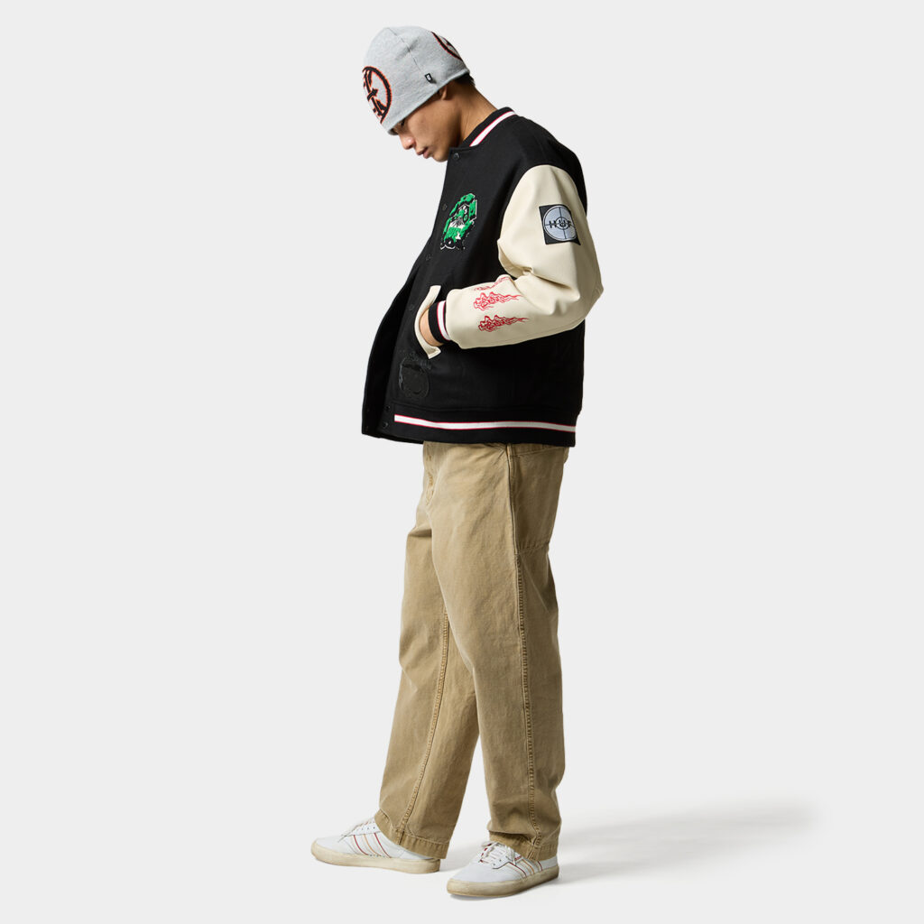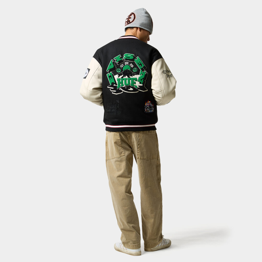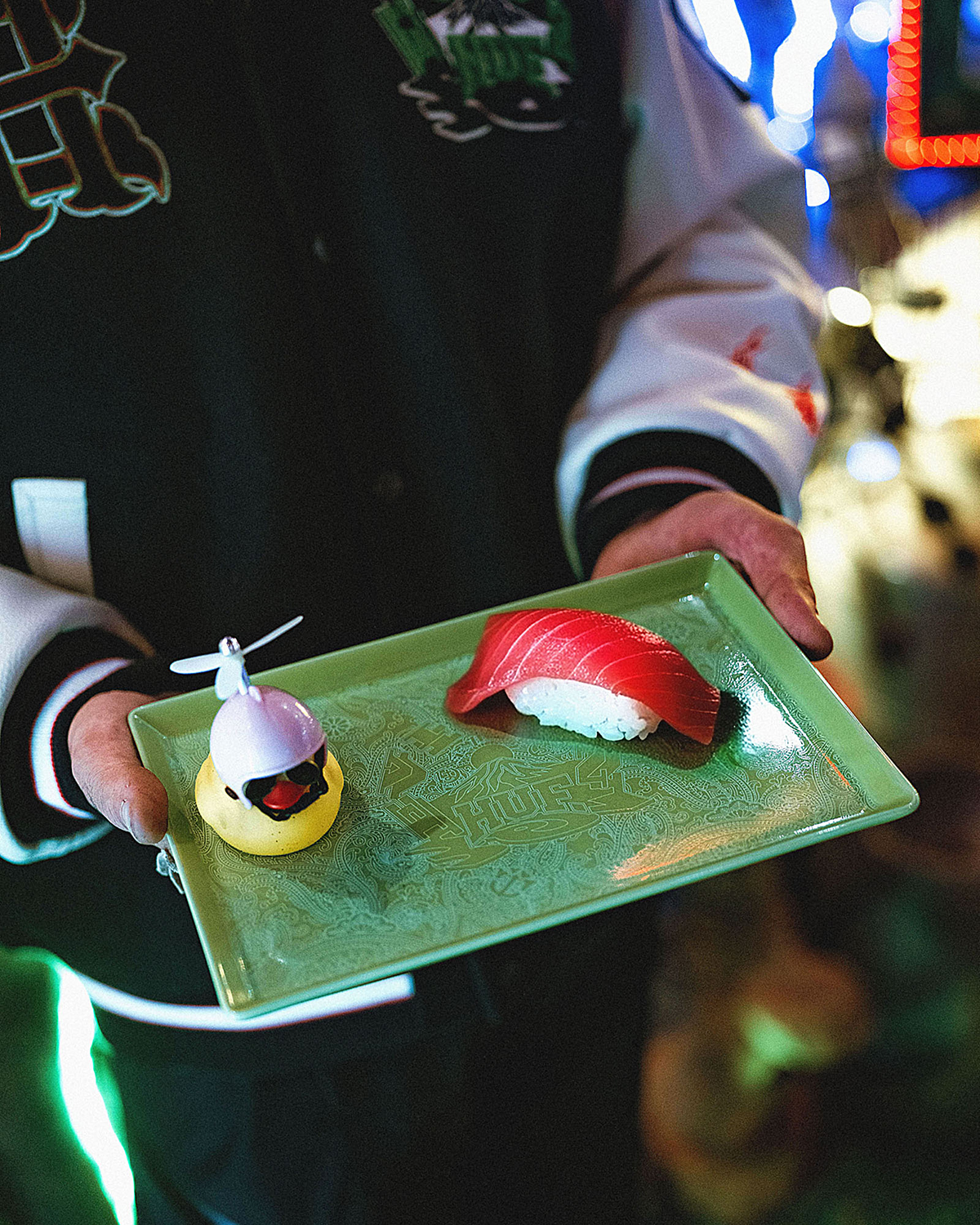 富士山や寿司といった日本を象徴するモチーフを、刺繍やプリントなどの多彩なテクニックで、スタジアムジャケット、ダブルジップフーディー、クルーネックフリース、ビーニー、酒瓶&そばちょこセット、プレート、バックルベルト、マーブルスタッシュボックス等、幅広いアイテムに落とし込んだ。