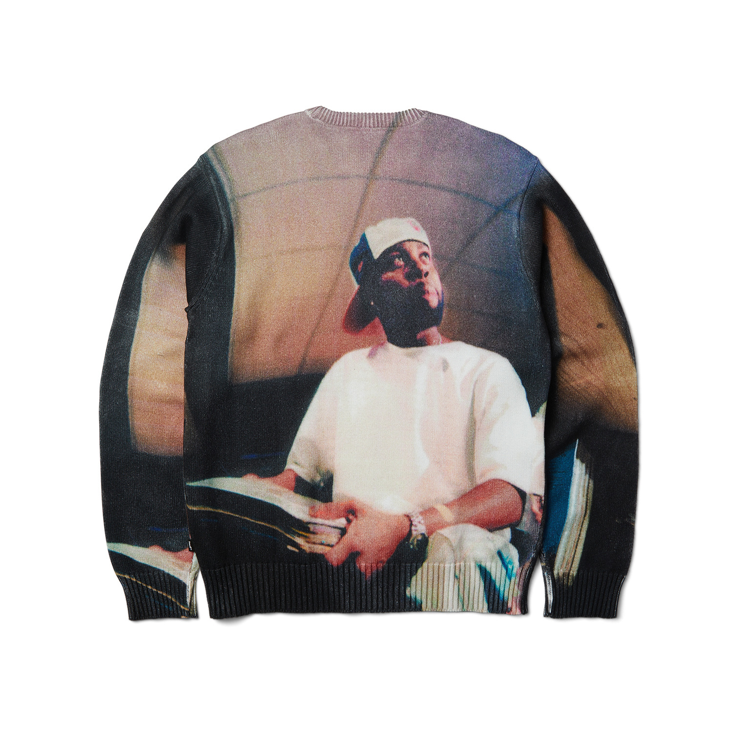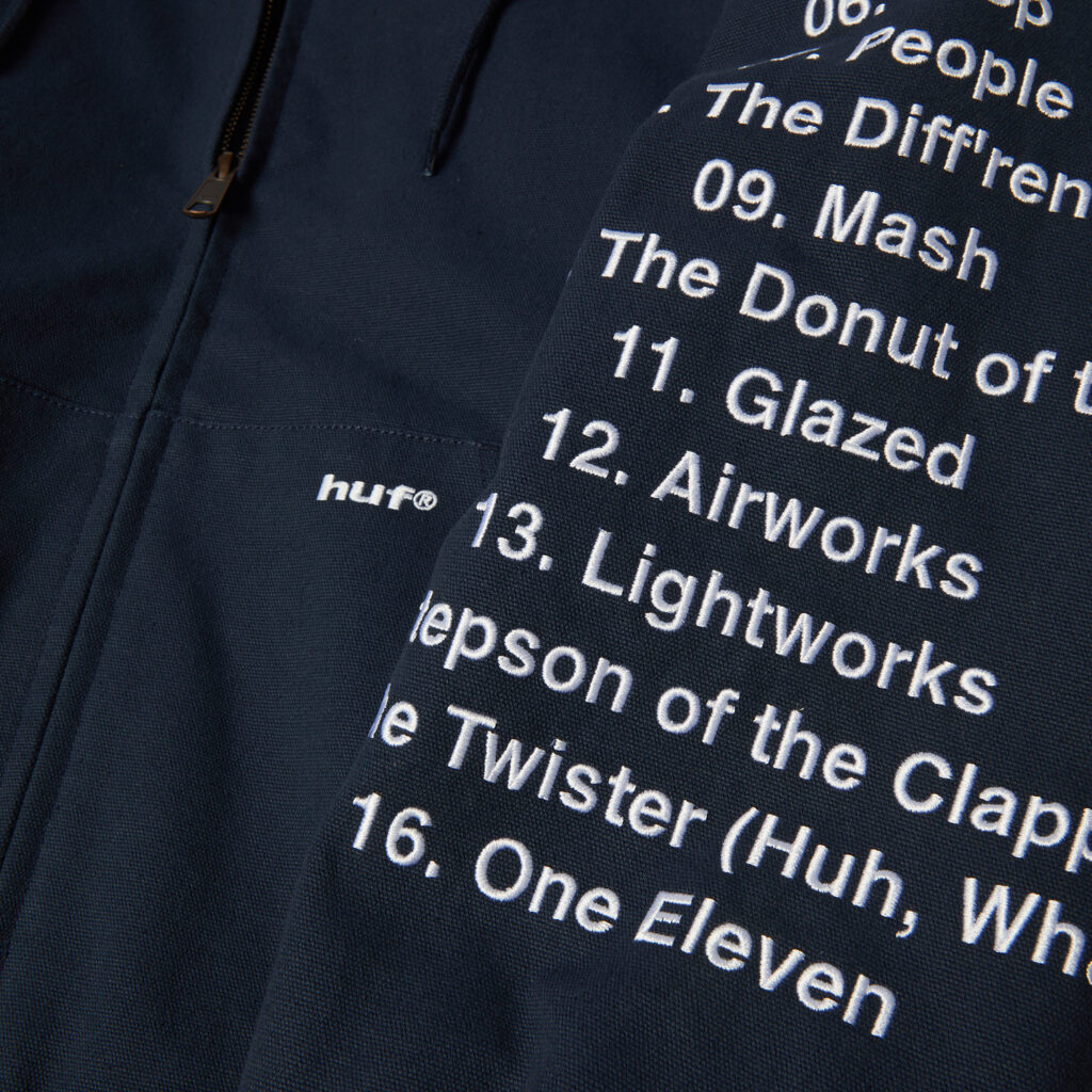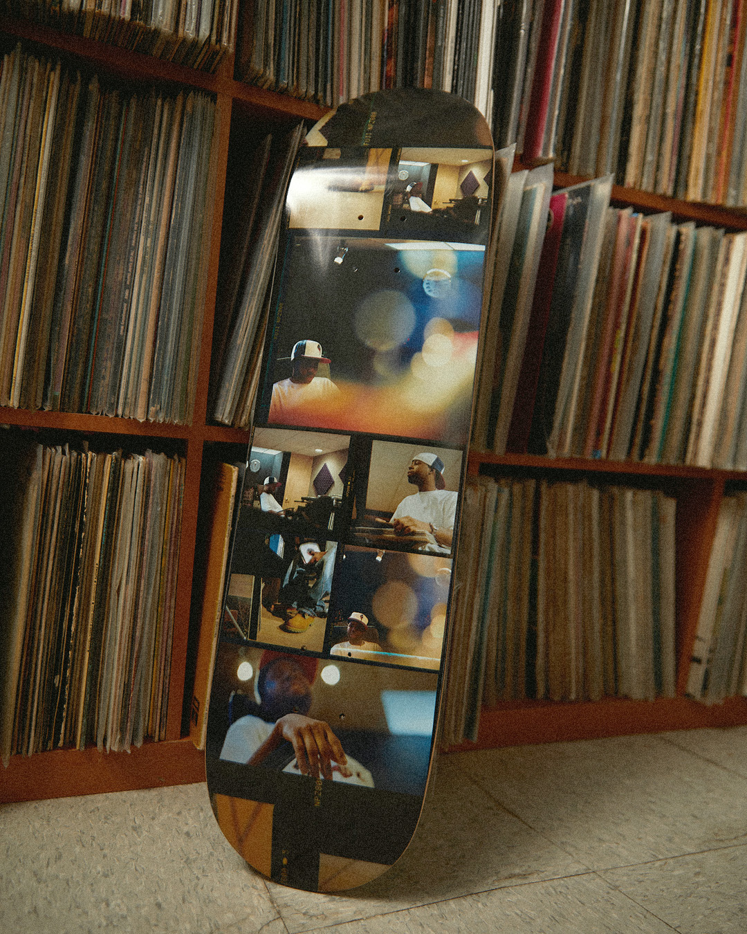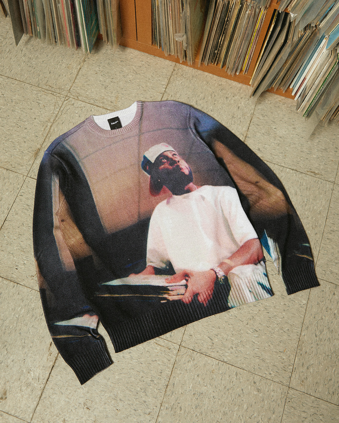 全体に刺繍アートワークと大胆なタイポグラフィを施したワークジャケット、ジャカード編みで全面アートワークを表現したセーター、プルオーバーフーディー、カスタムTシャツ2型、折りたたみ式レコードクレート、フォトスケートデッキなどが登場している。