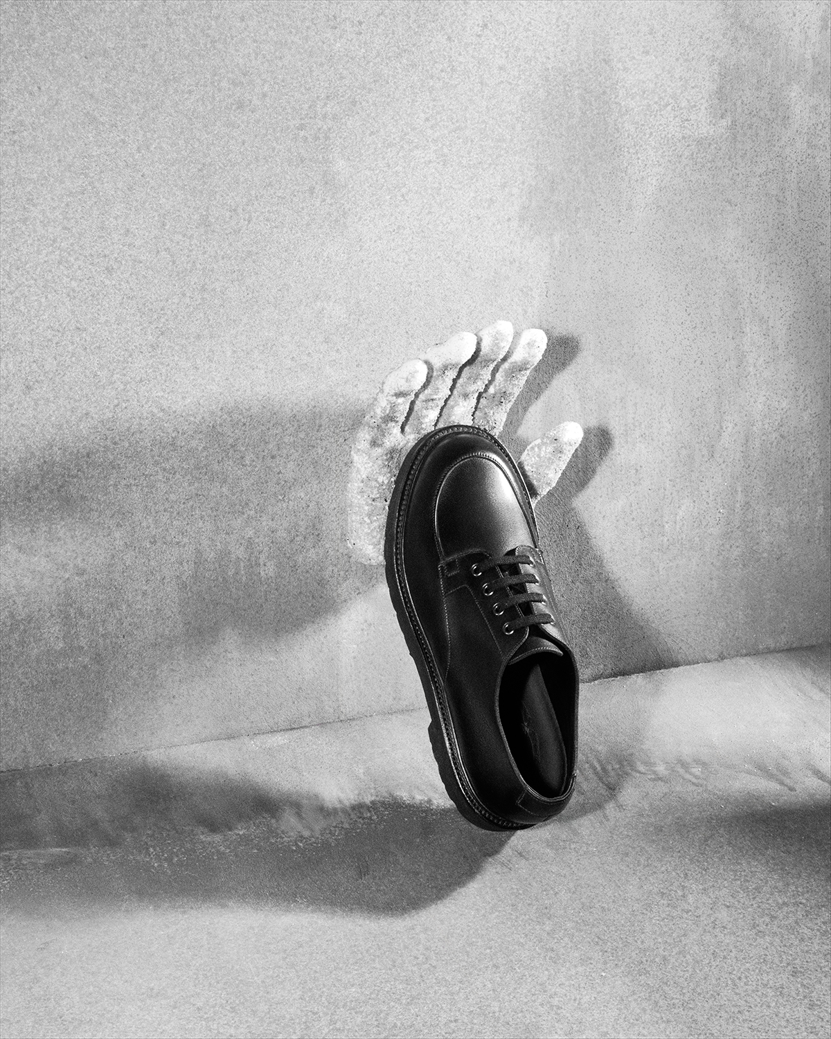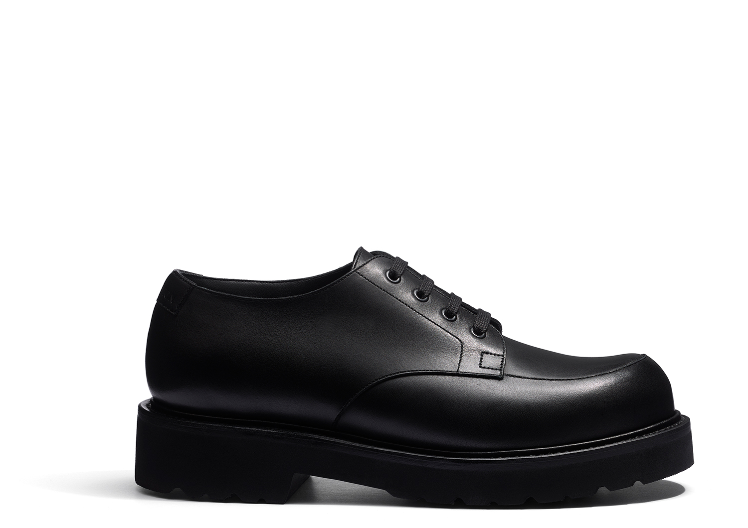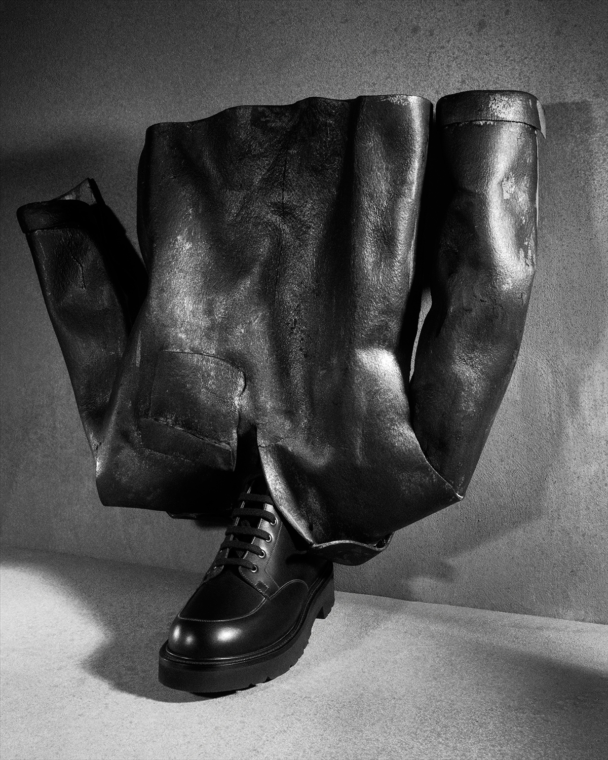 ワークウェアをインスピレーション源に頑強さと都会的な要素を融合し、厚く滑らかなブラックのソフトレザーのアッパーは堅牢さとしなやかさを兼ね揃えている。