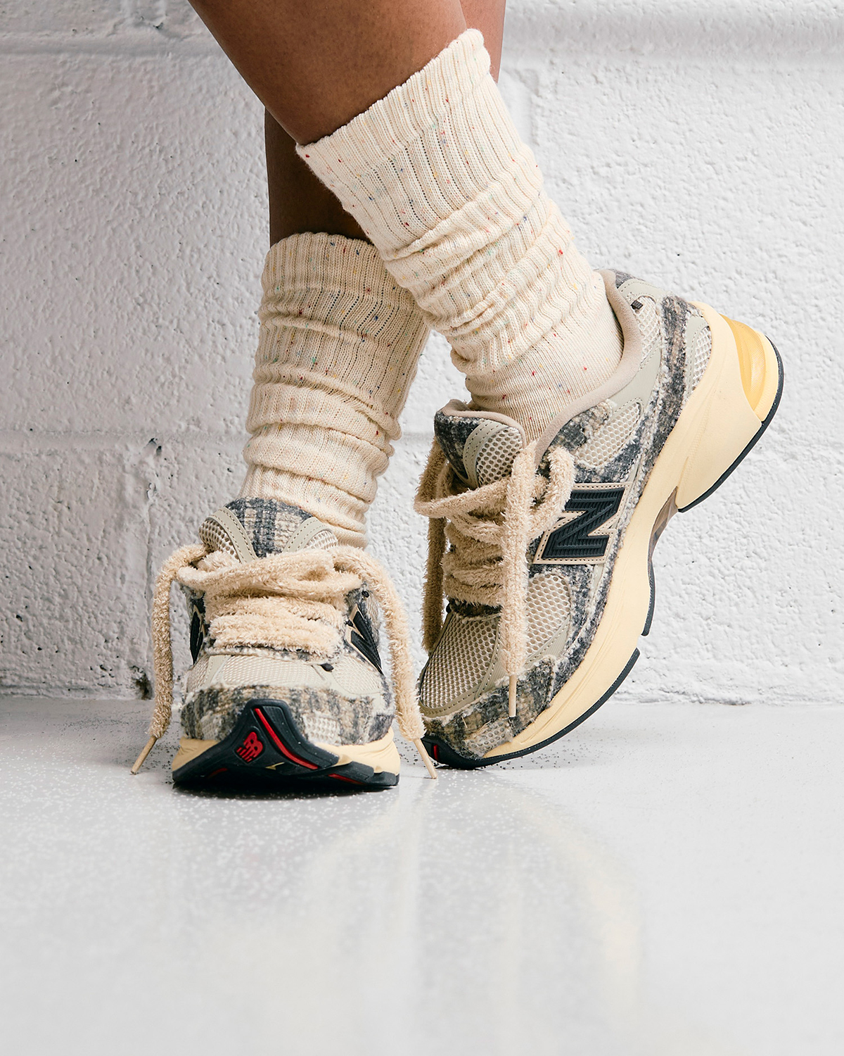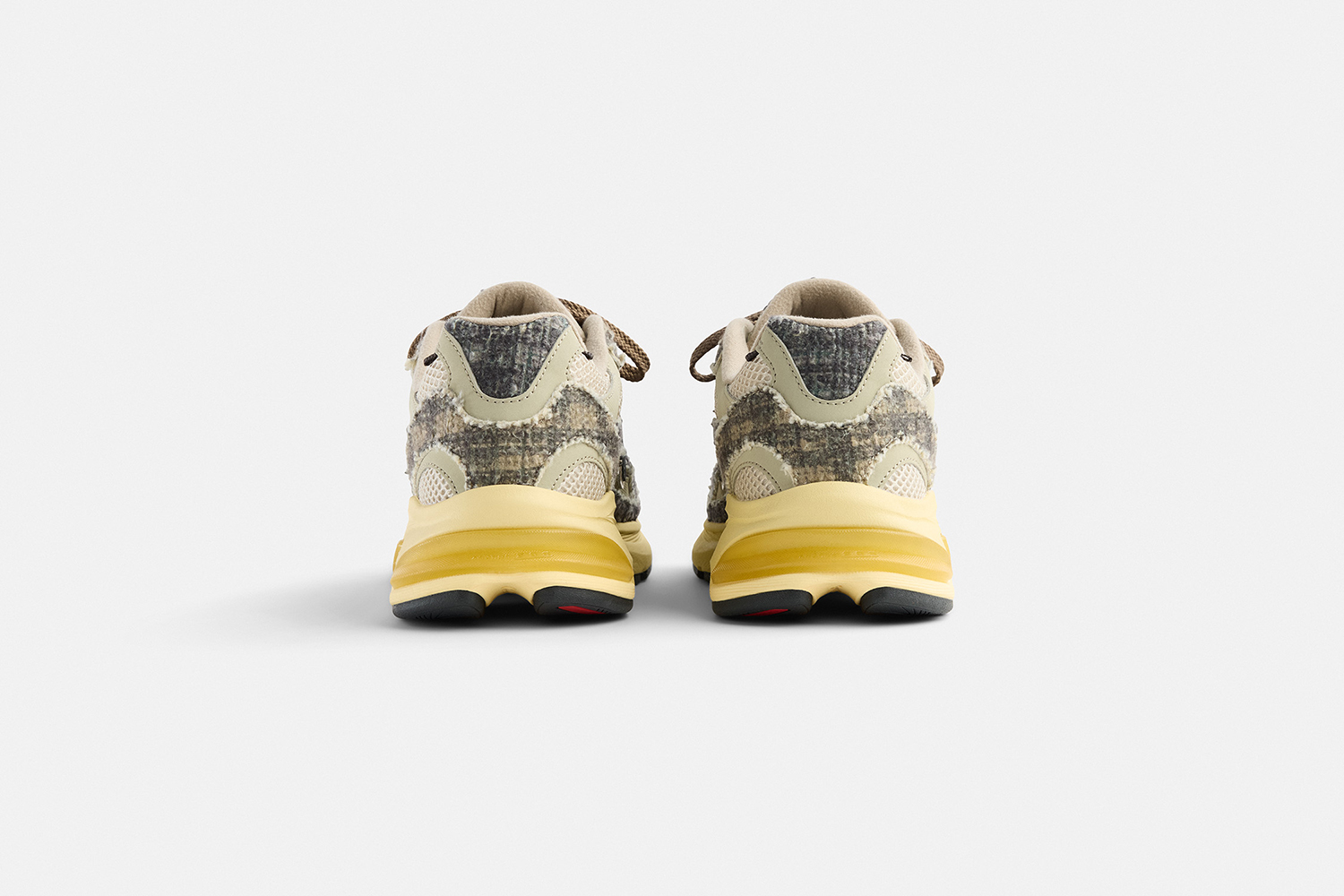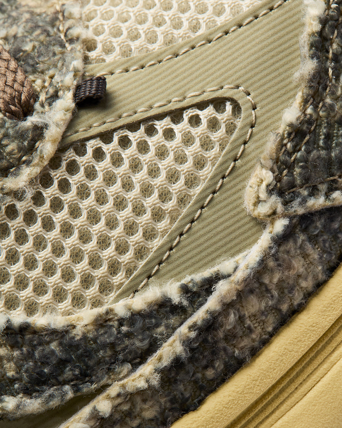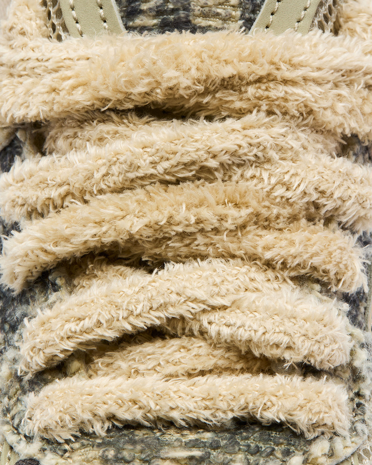 アッパーにはプリントを施したブークレ素材を配し、柔らかく使い込まれたような質感を演出した。