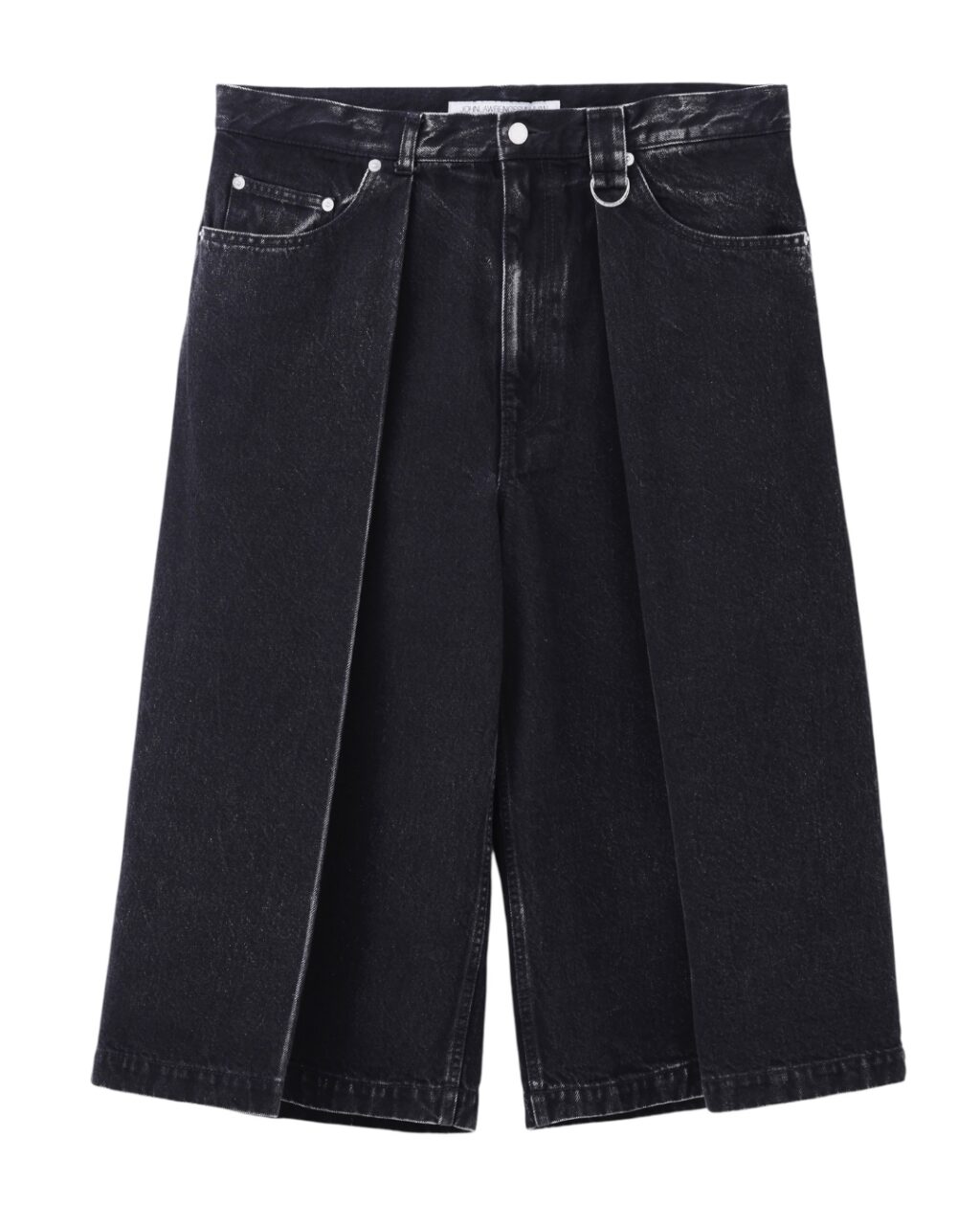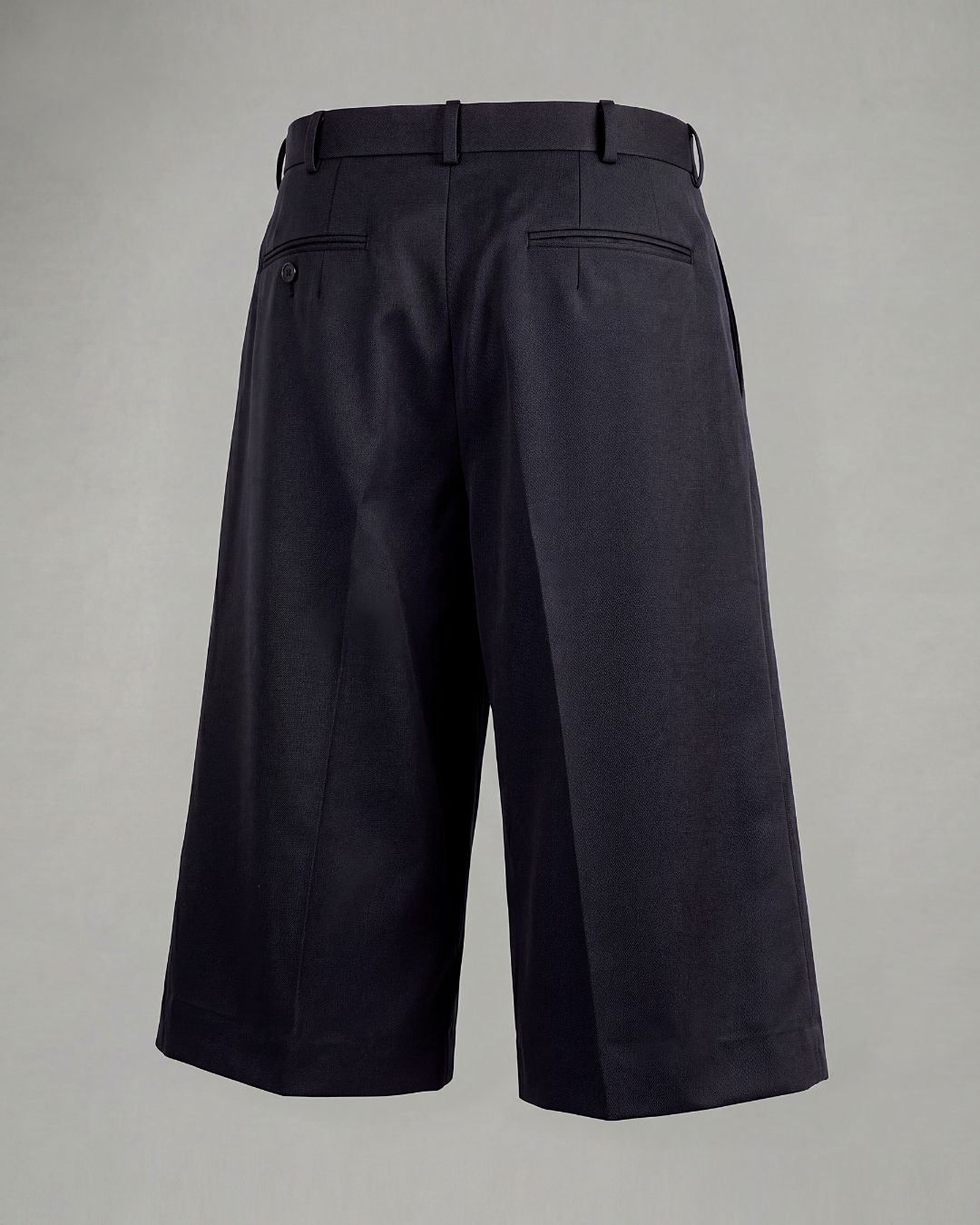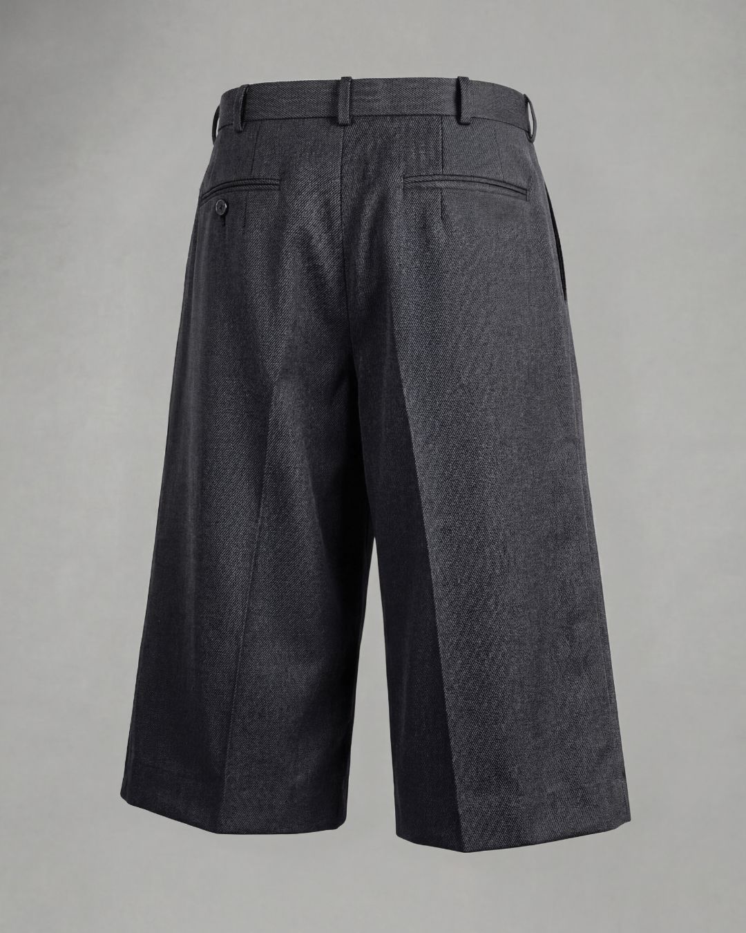 2026年春夏コレクションで展開されているユーズド加工を施したデニム素材のワイドショーツを、細番手の糸を2本撚り合わせた2/72糸によるウールギャバジンを用いてアレンジした本作。