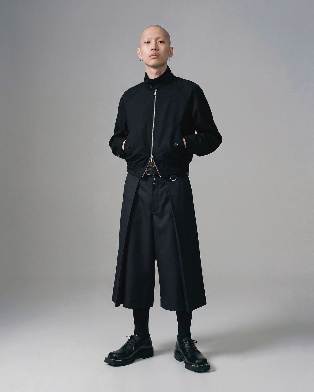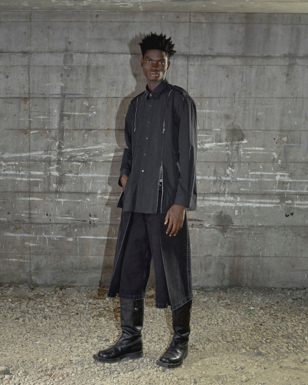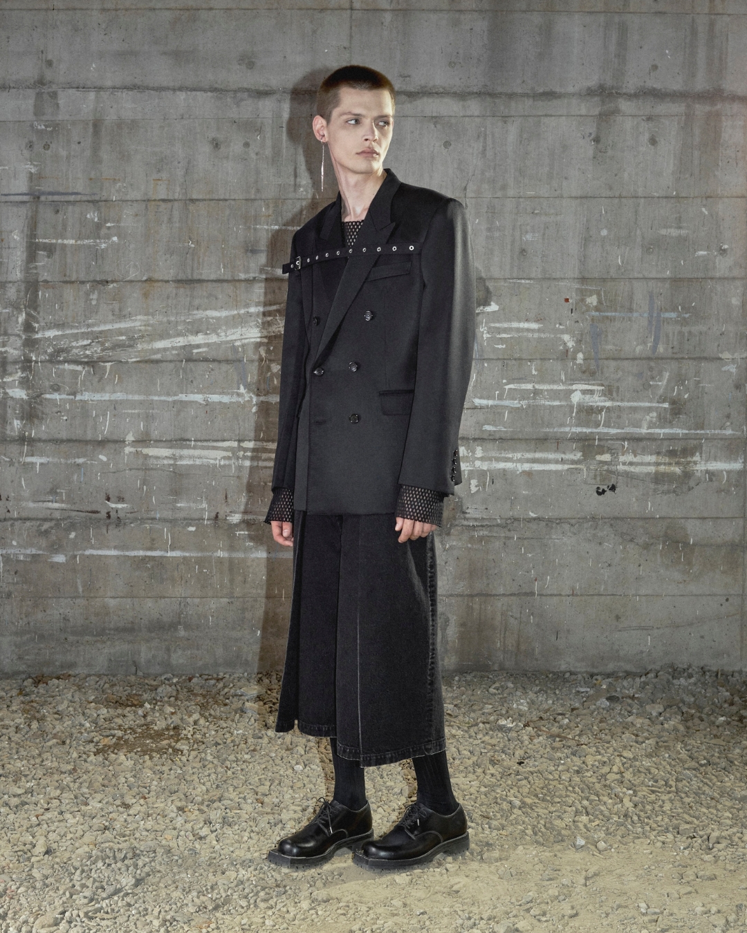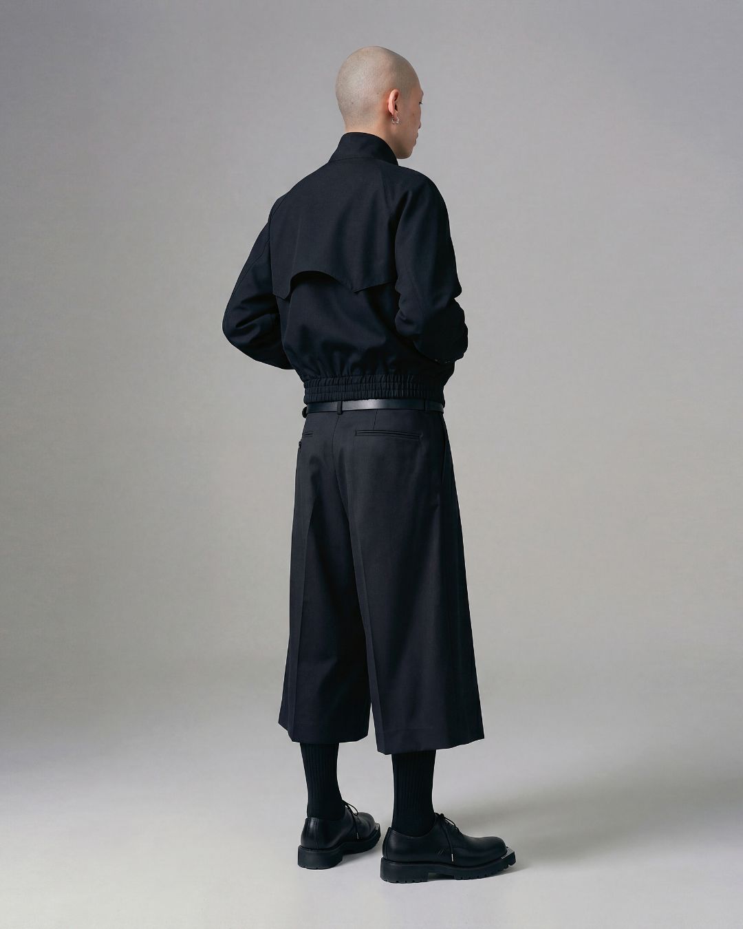 裾にかけて広がるワイドシルエットが静かな迫力を持って存在感を引き立て、動きに合わせて生まれる揺らぎと陰影がシルエットに奥行きを与え、静と動のコントラストを際立たせる。