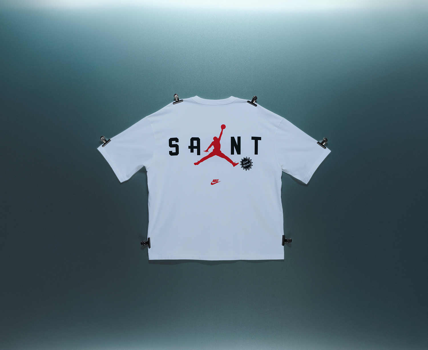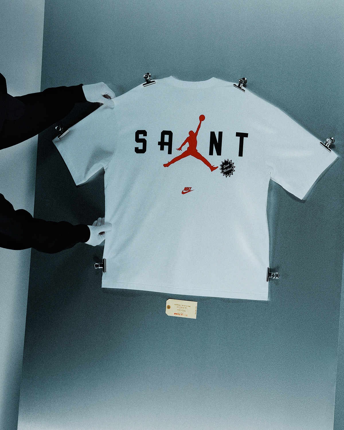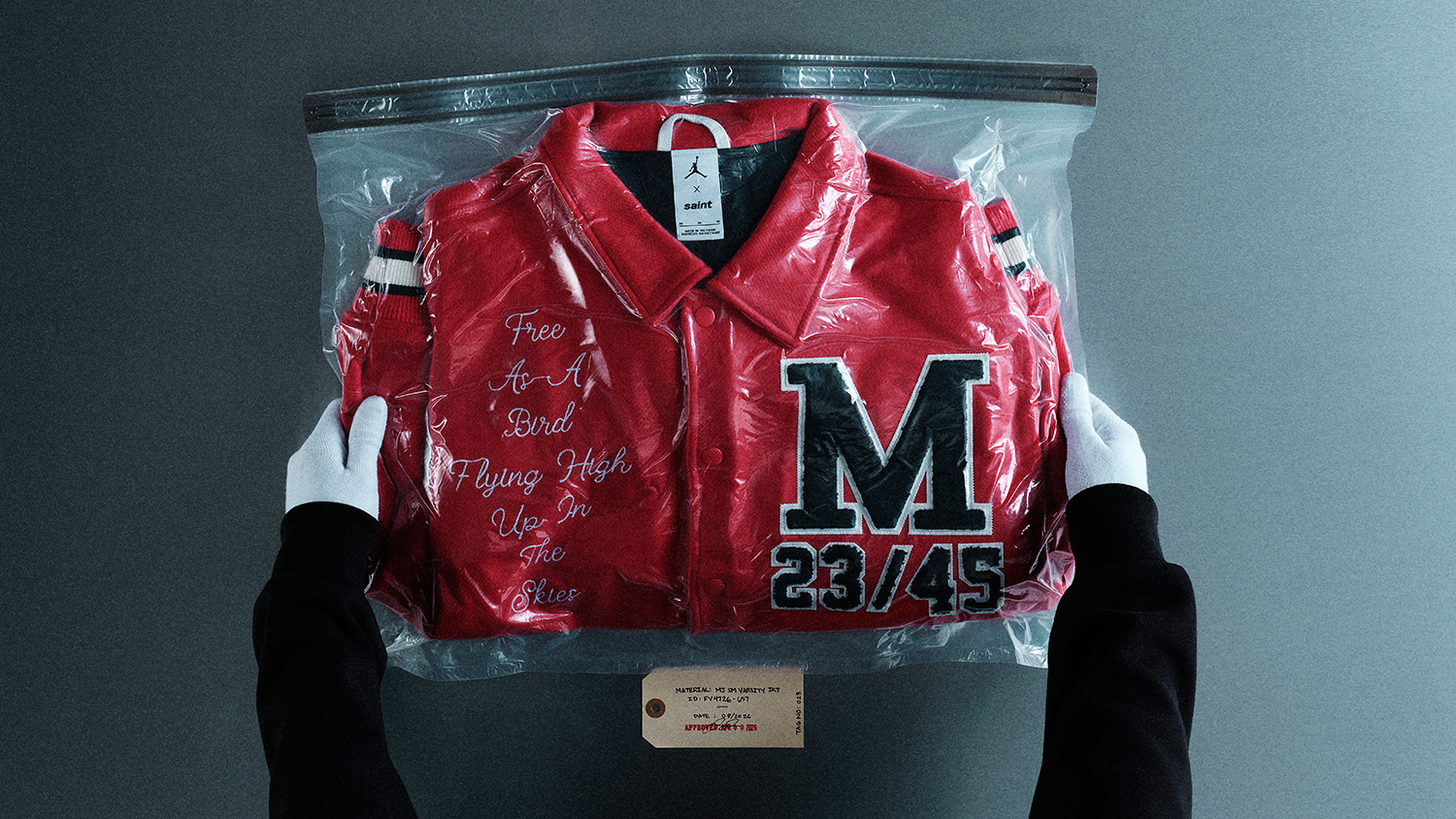 バーシティジャケット、キャップ、Tシャツ、フーディ、パンツがラインナップされており、バーシティジャケットは、©SAINT M××××××のイニシャルを反転させ、Michael Jordanを象徴する”23”の数字を想起させるフォルムとして表現。キャップには、両者のアイデンティティをひとつに融合させた”SAINT JORDAN”の文字を配した。