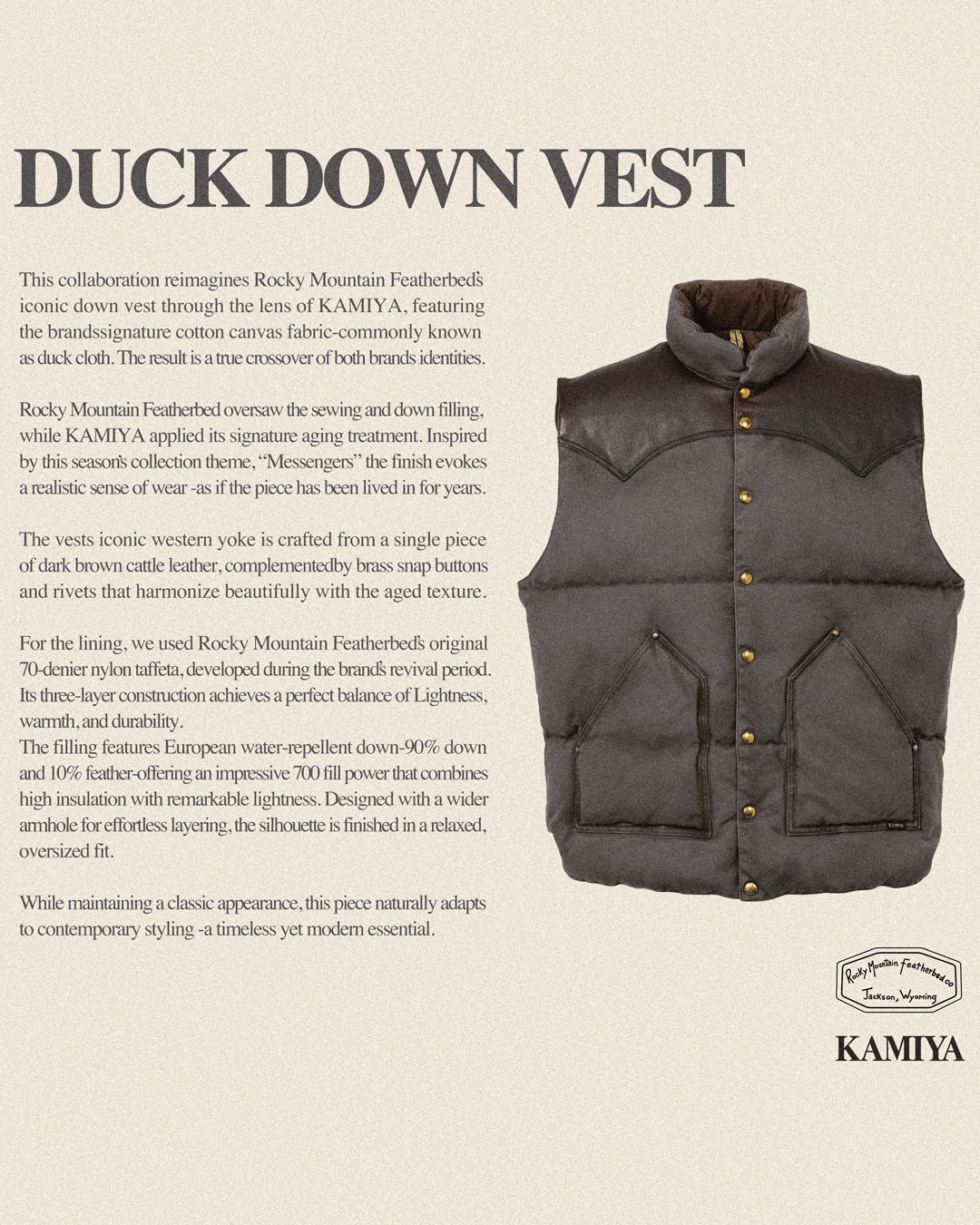 今回のコラボレーションでは、Rocky Mountain Featherbedの定番ダウンベストを、KAMIYAが使用しているコットンキャンバス生地でアレンジ。
