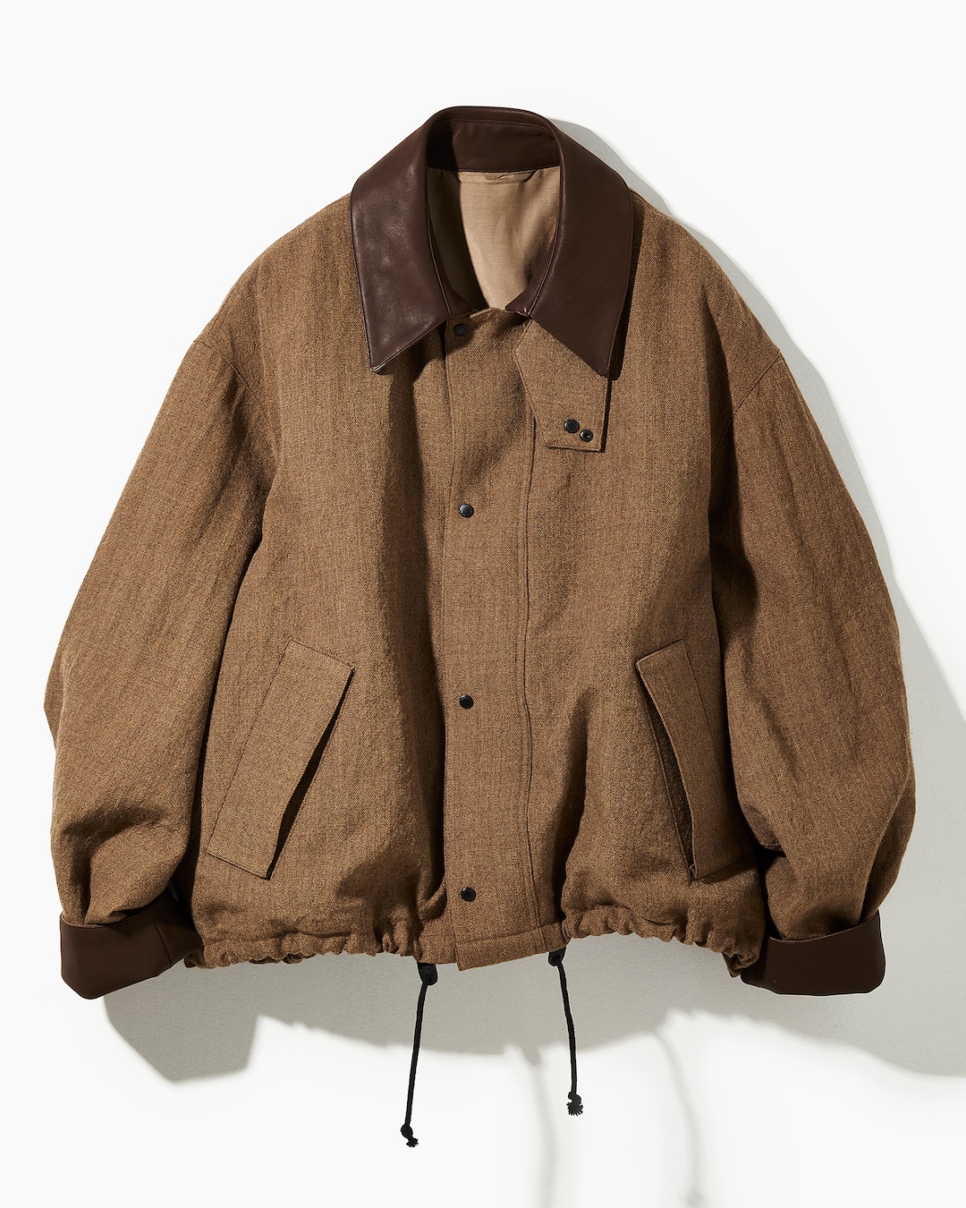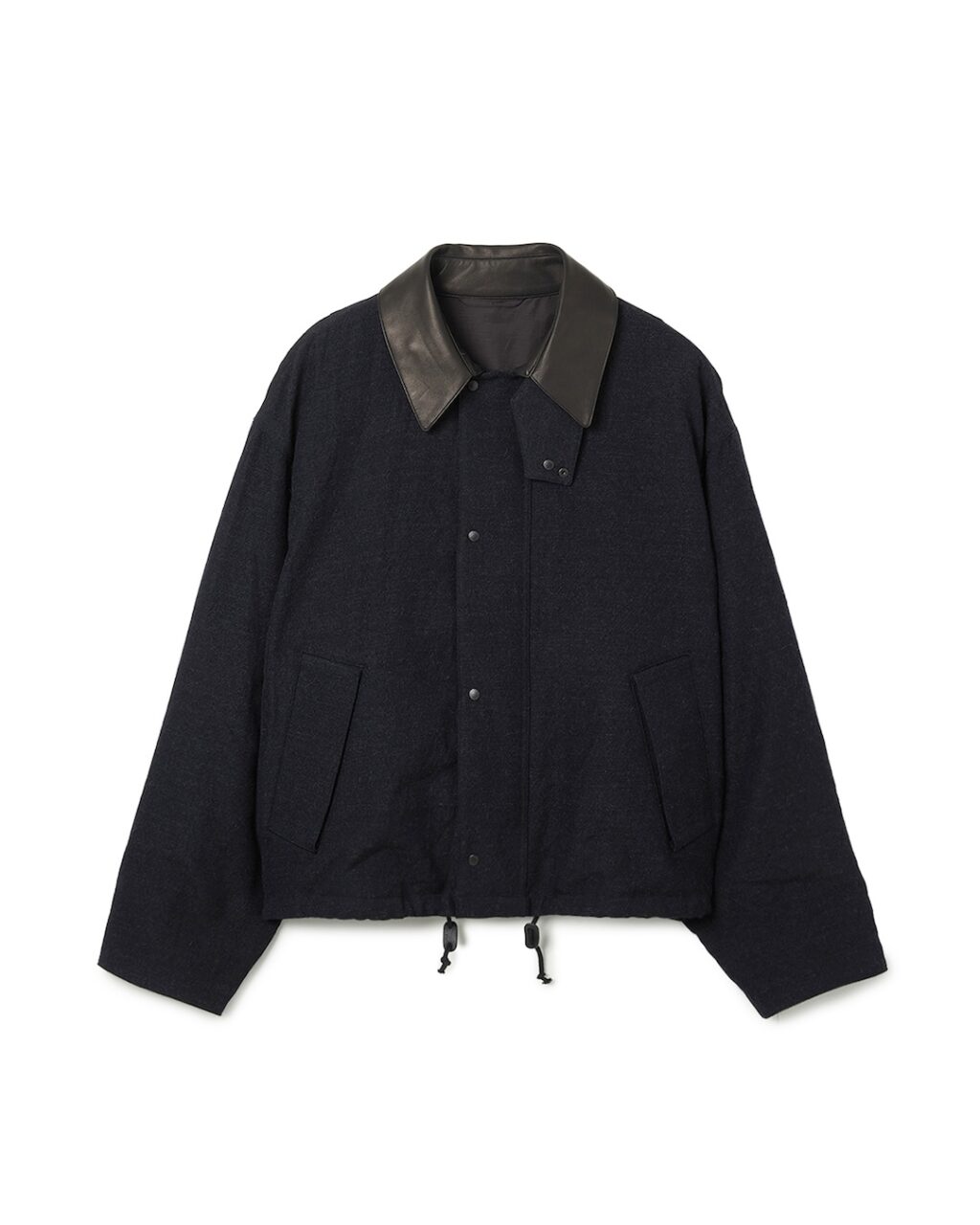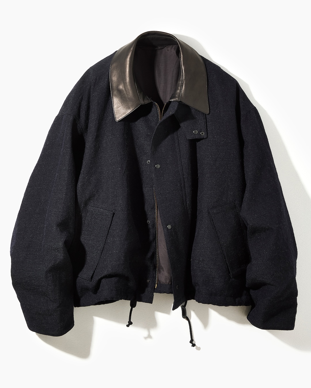 新たにデザインしたブルゾンは、素材に上質なウールサージ生地を使用し、襟と袖裏にはレザーを配することで、カジュアルすぎず上品な印象に。トレンドであるショート丈に、極端に広い身幅とゆとりのあるアームホールを組み合わせた独自のシルエットで、レイヤードにも最適だ。