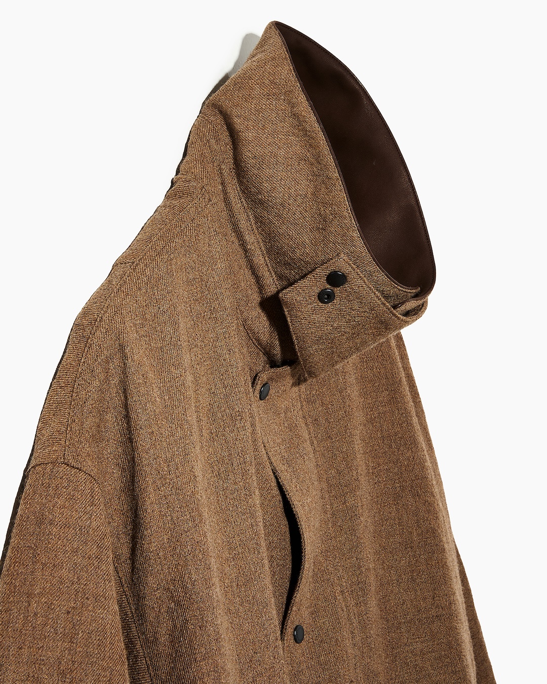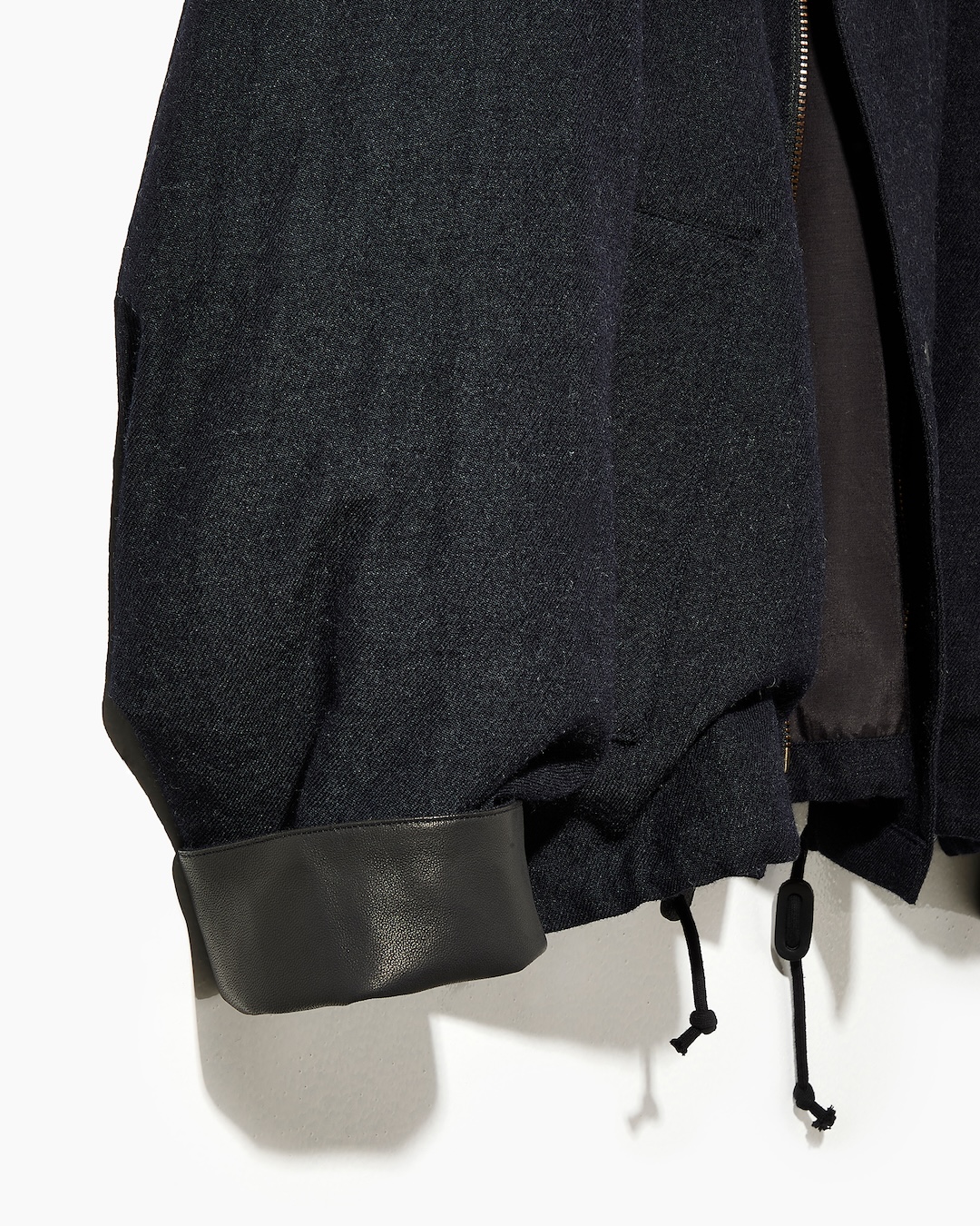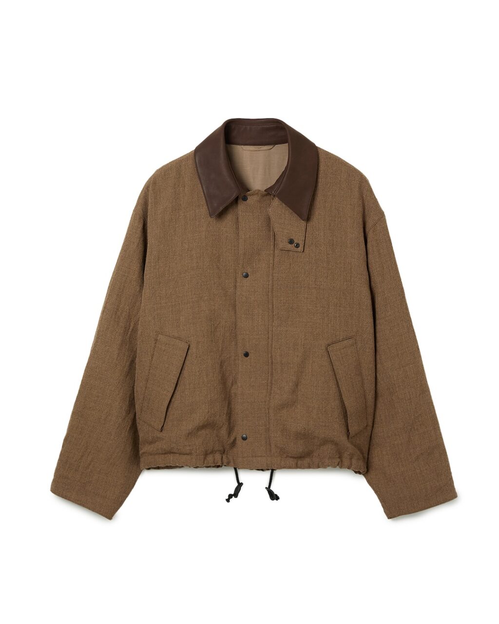 新たにデザインしたブルゾンは、素材に上質なウールサージ生地を使用し、襟と袖裏にはレザーを配することで、カジュアルすぎず上品な印象に。トレンドであるショート丈に、極端に広い身幅とゆとりのあるアームホールを組み合わせた独自のシルエットで、レイヤードにも最適だ。