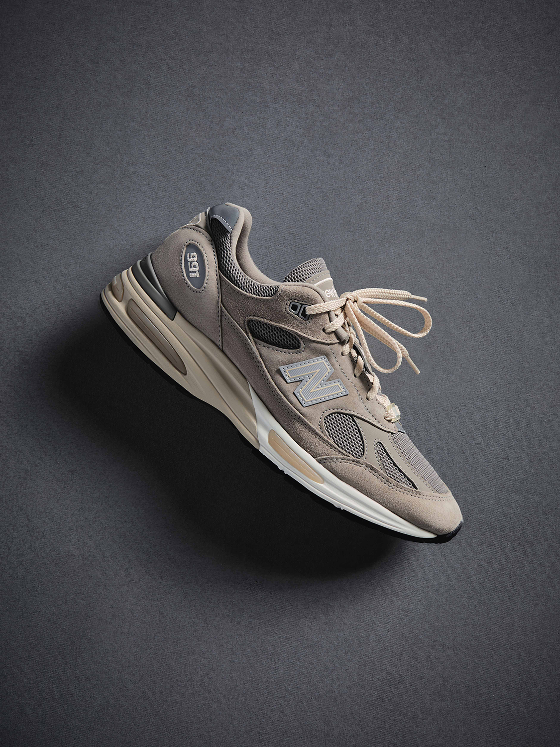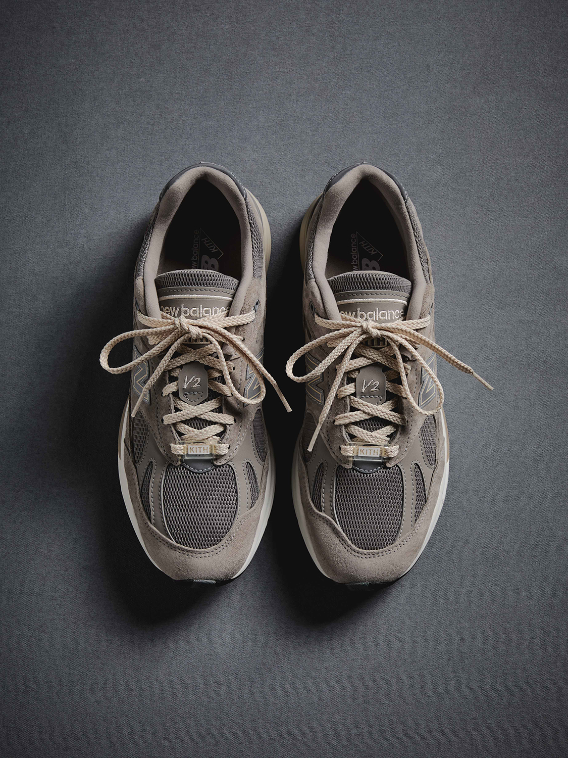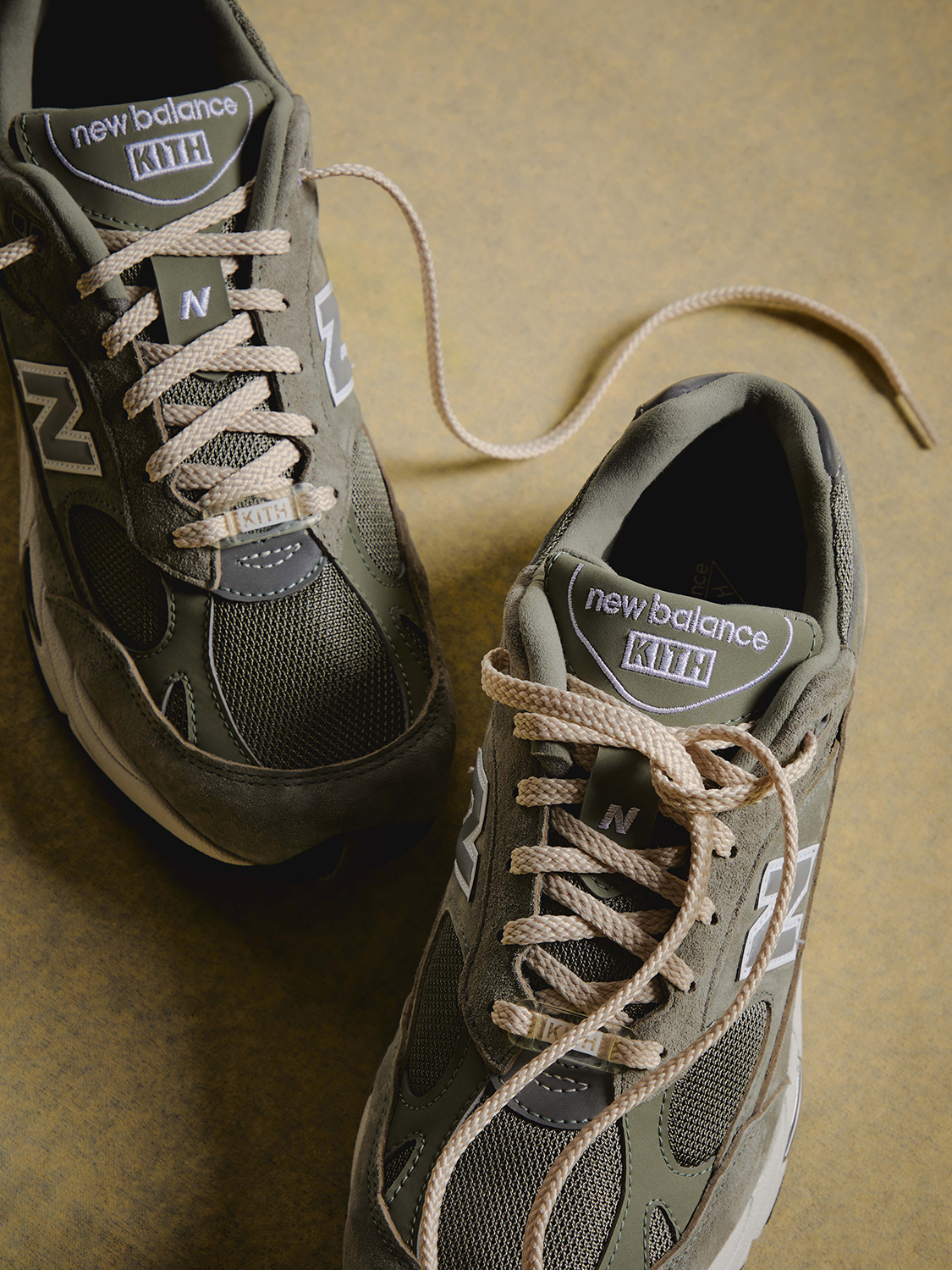 『991v1』はメンズ・ウィメンズ両サイズで展開され、ヒール、タン、フットベッドにKithのブランディングを配し、カスタムのKithダブレも搭載。一方の『991v2』には、アンクルの外側、タン、フットベッドにKithのブランディングが施されている。