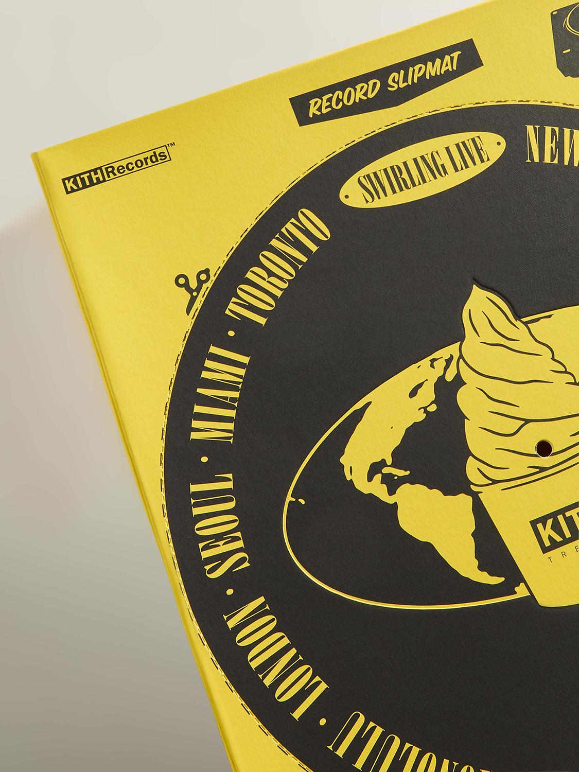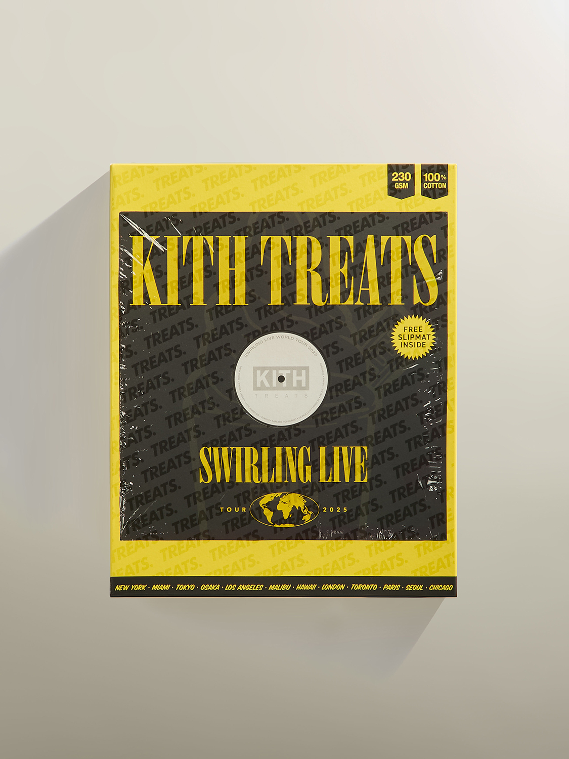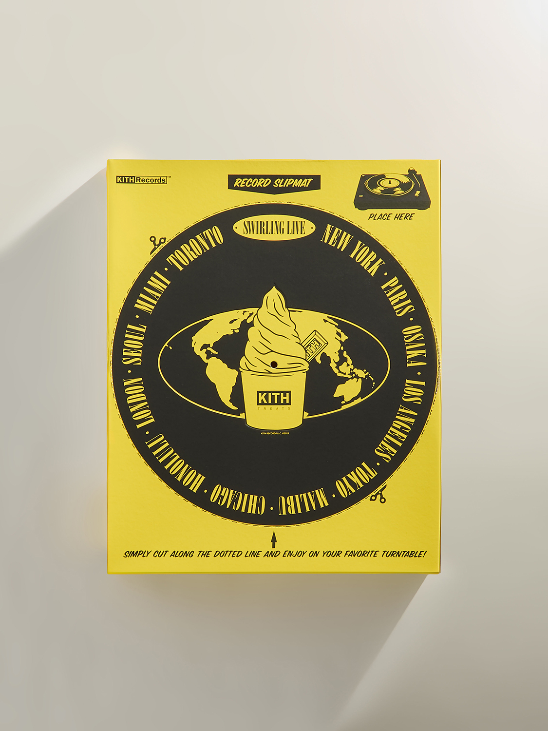 各Tシャツは、カプセルコレクションのメインデザインをあしらったシリアルボックス型のパッケージで提供。ボックスの背面にはミシン目が入っており、ターンテーブル用のスリップマットとしても楽しめる。