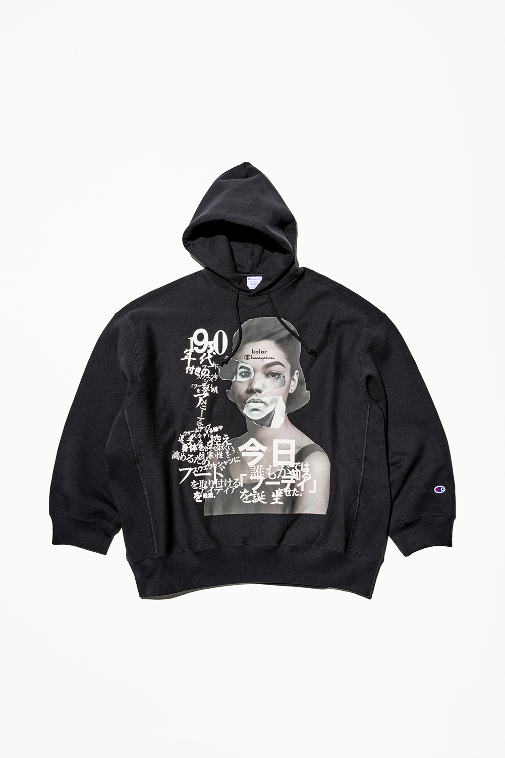 この両者にとって初のタッグとなる今回は、kolorならではの大胆なプリントメッセージデザインや、高度なパターン技術によるサイジングを、ChampionのREVERSE WEAVE®製法によるスウェットウェアにミックス。