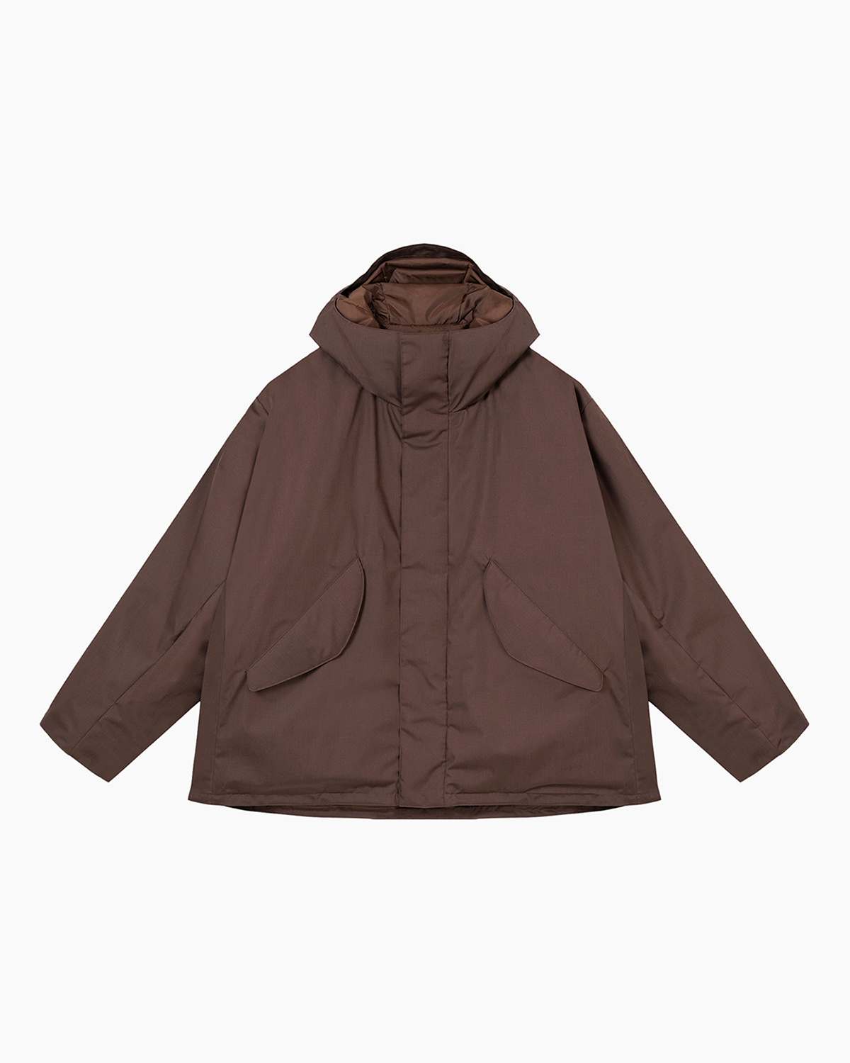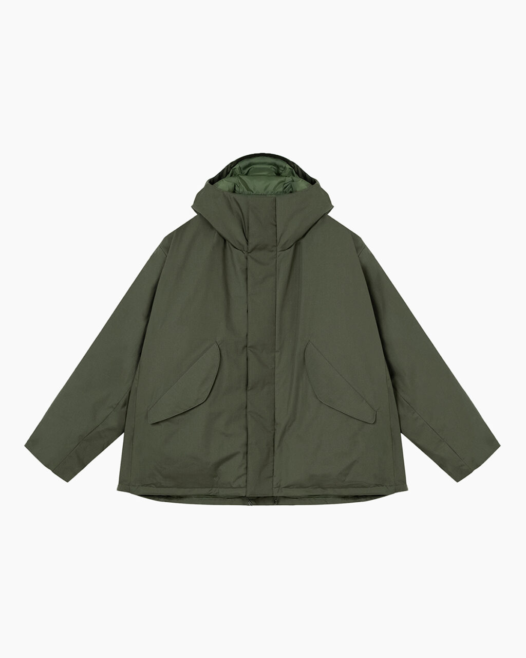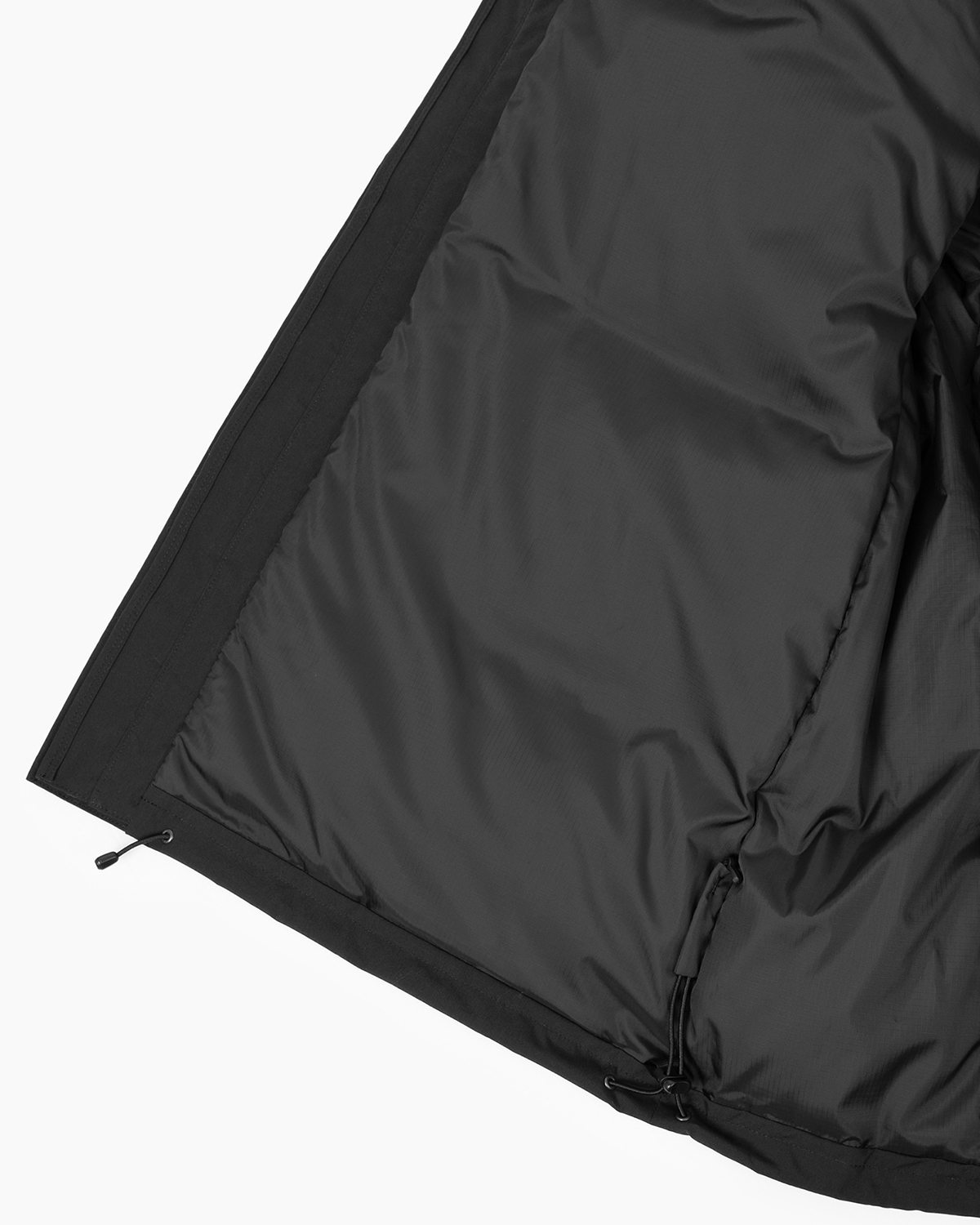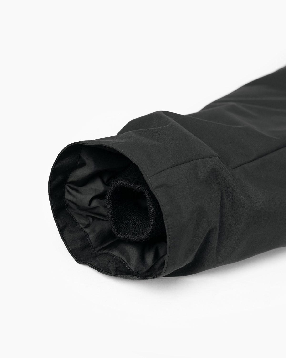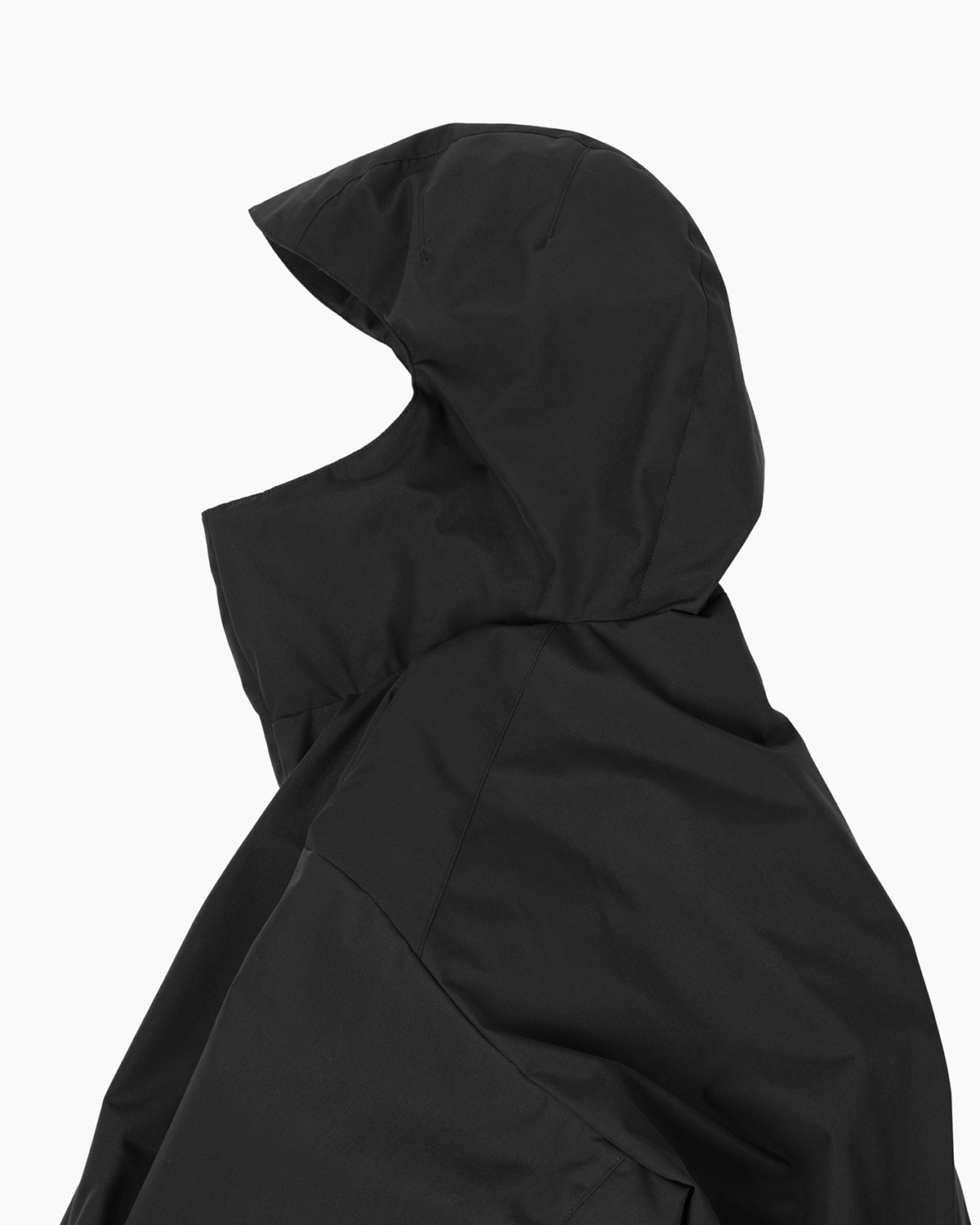 ステッチを無くしたミニマルなデザイン、程よい身幅のボックスシルエットが特徴的で、袖下から脇にかけてマチを施したフリーダムスリーブにより腕周りの可動率を確保。袖口内部のリブとフードや裾に設けたドローコードにより風の侵入を防ぎ、アジャスターを絞ることでシルエットに変化をつけられる。