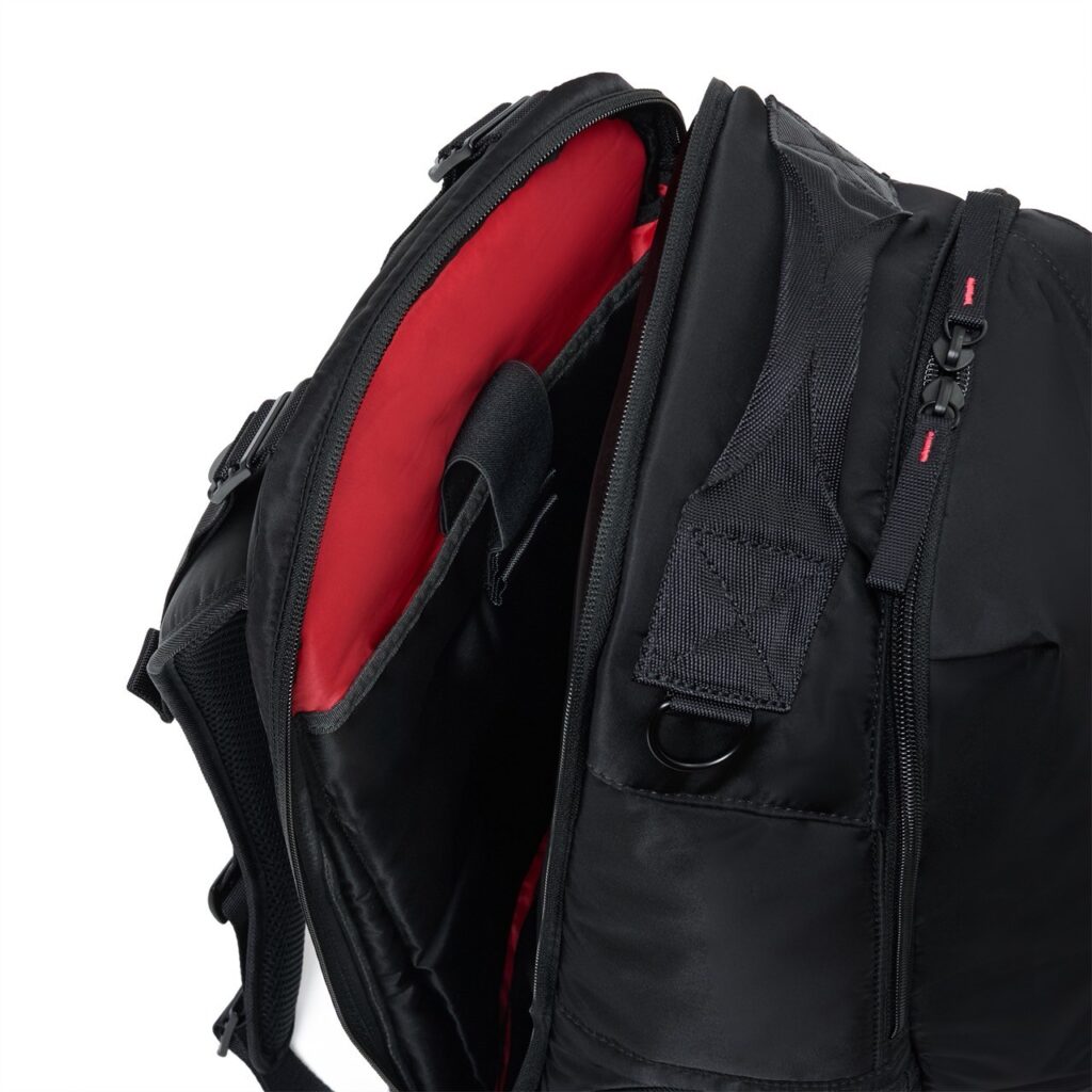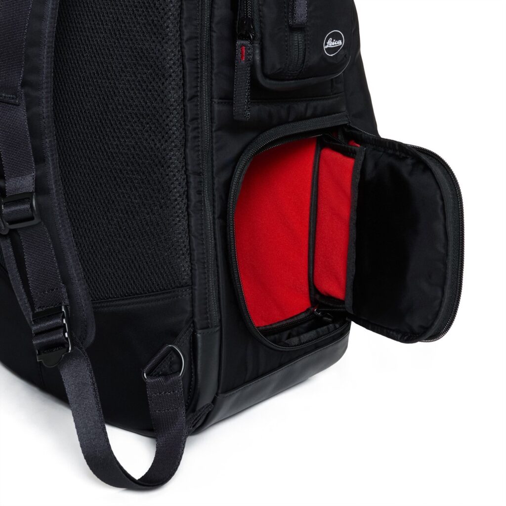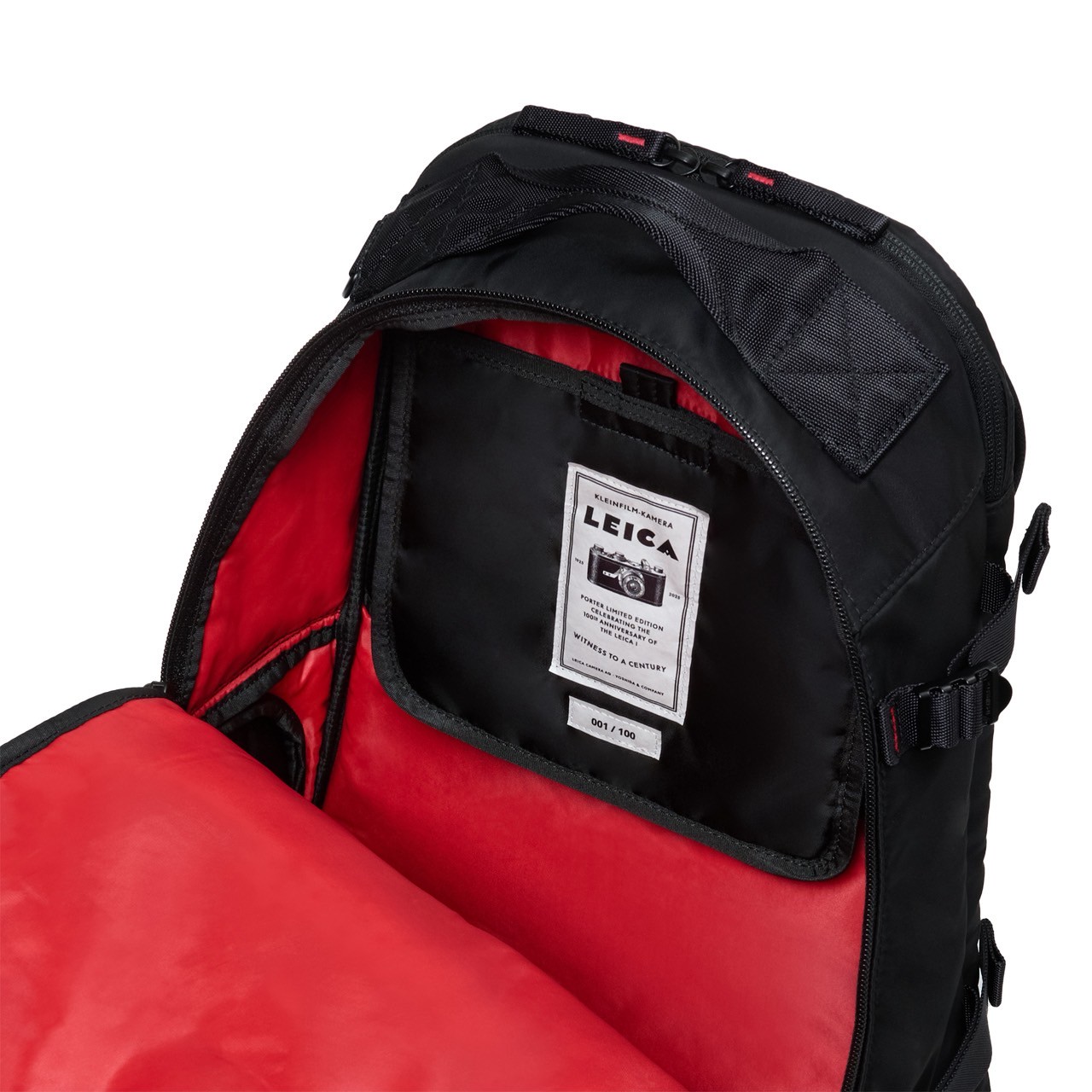 外装のブラックワントーンにLeicaらしいレッドカラーの内装を組み合わせ、シリアルナンバー入りの『Leica I』100周年記念タグと吉田カバン90周年タグも配置。