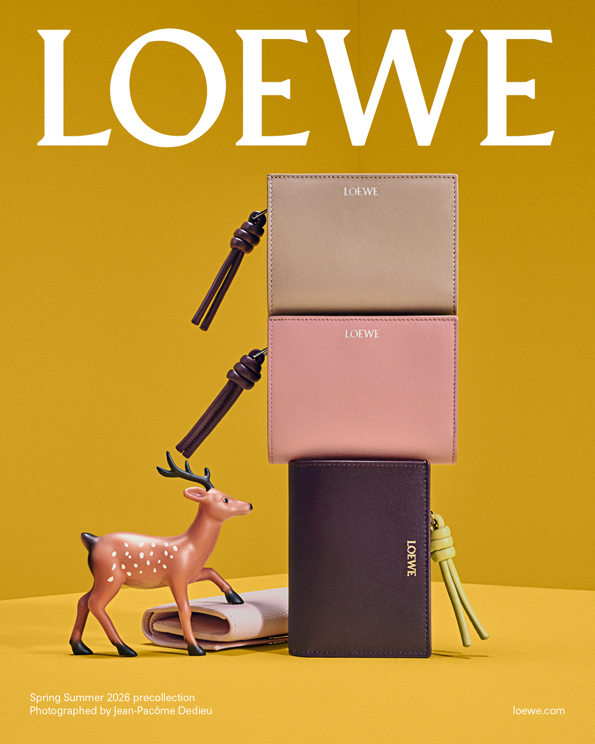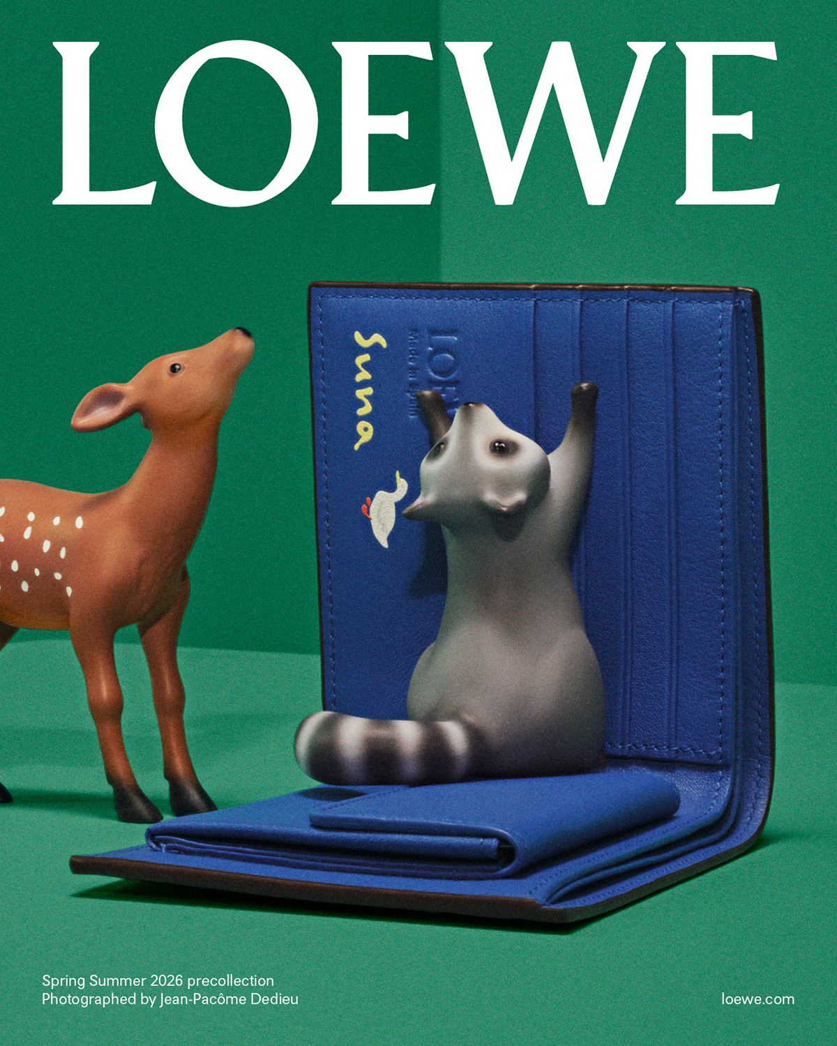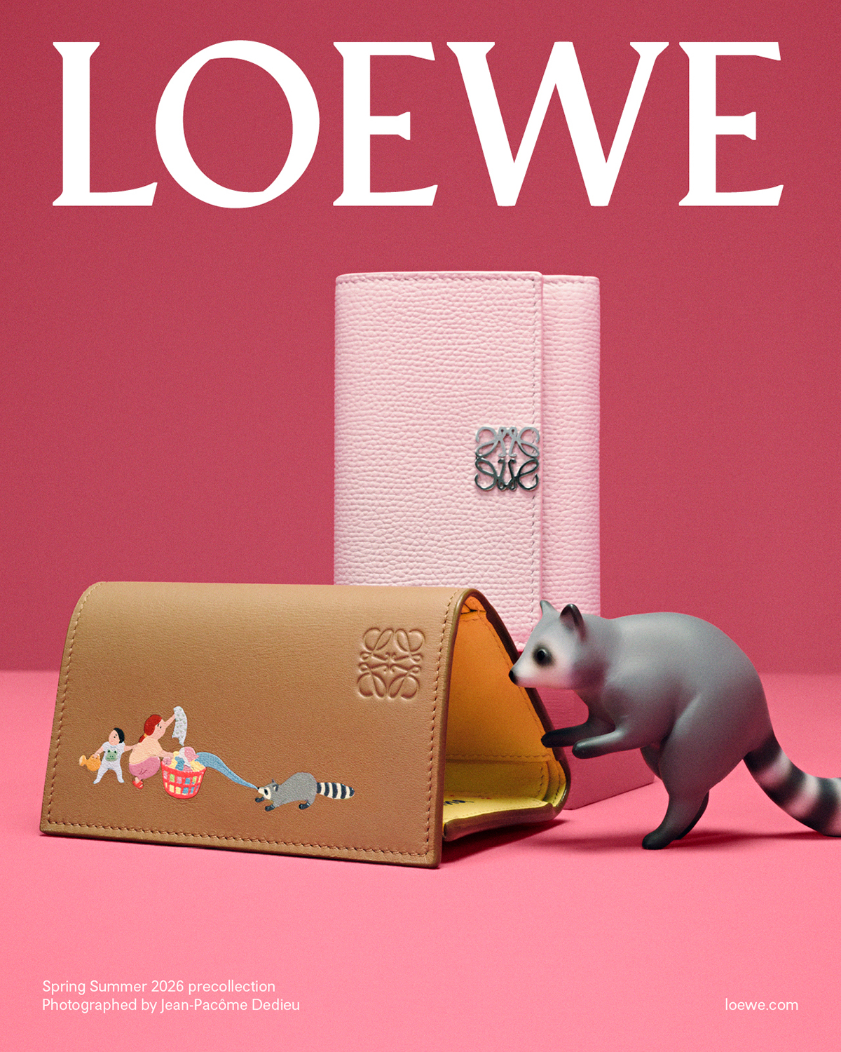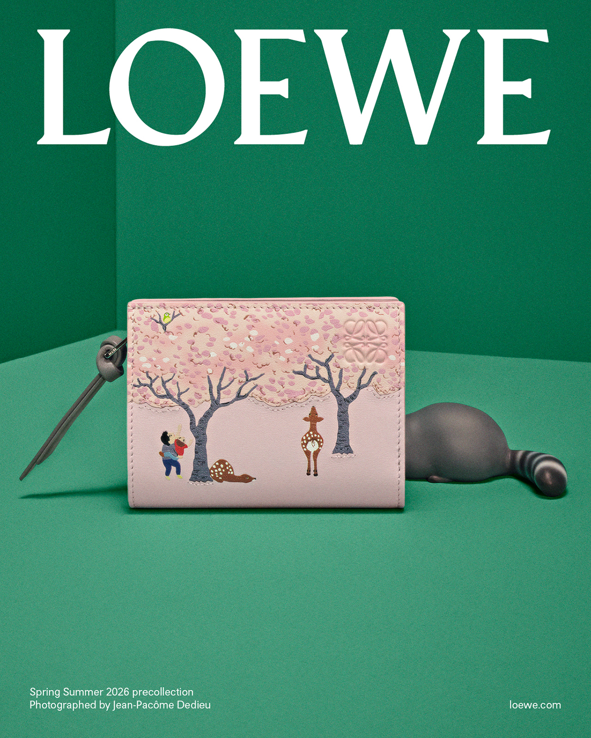 手描きにより小さな情景を紡ぎ出すスナ・フジタの独創的な世界がLOEWEのバッグや革小物、アクセサリーに宿り、アイコニックなデザインと物語的なディテール、そして精緻なクラフトが融合。さらには、スナ・フジタの世界にインスパイアされたシアリングのコートも登場している。