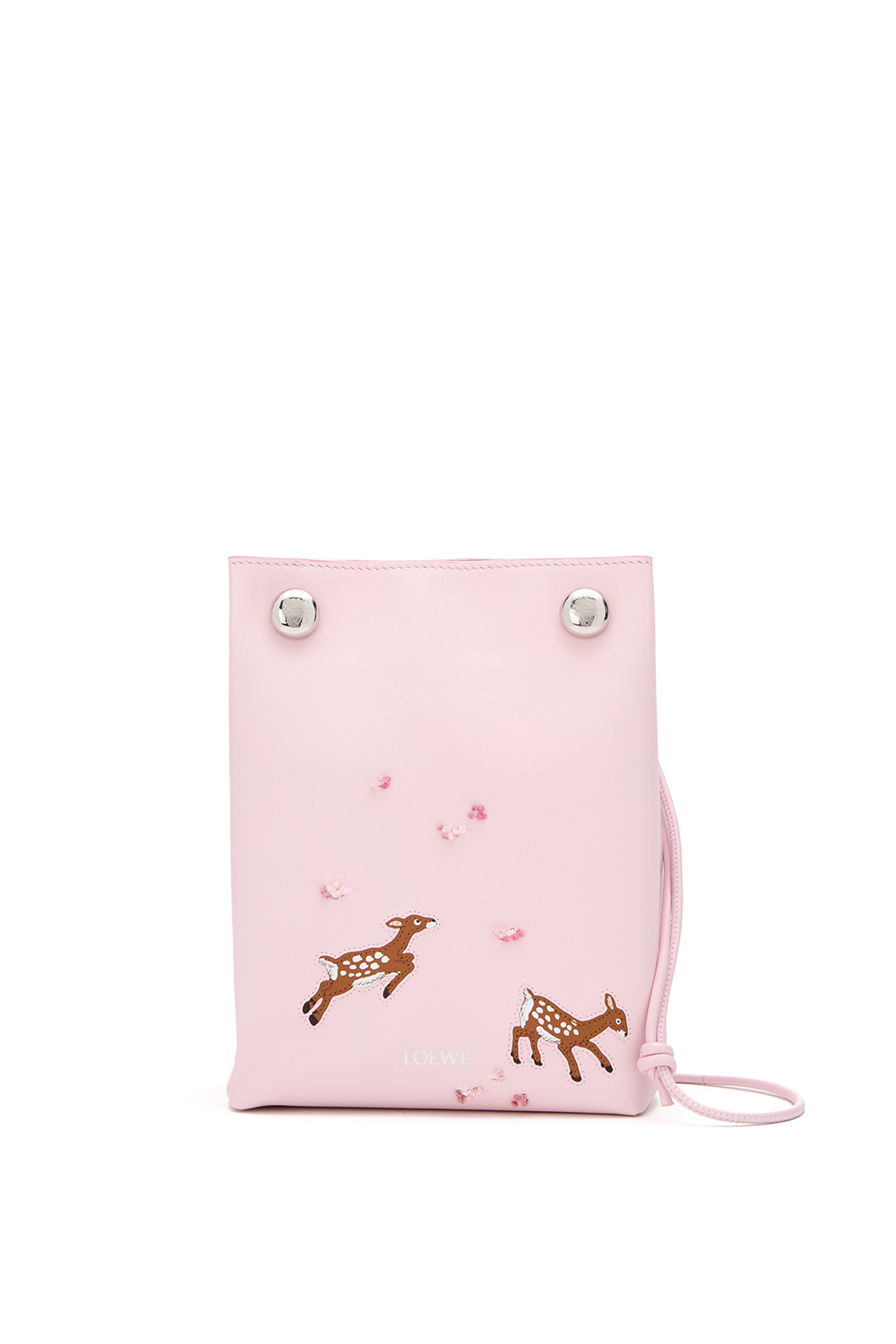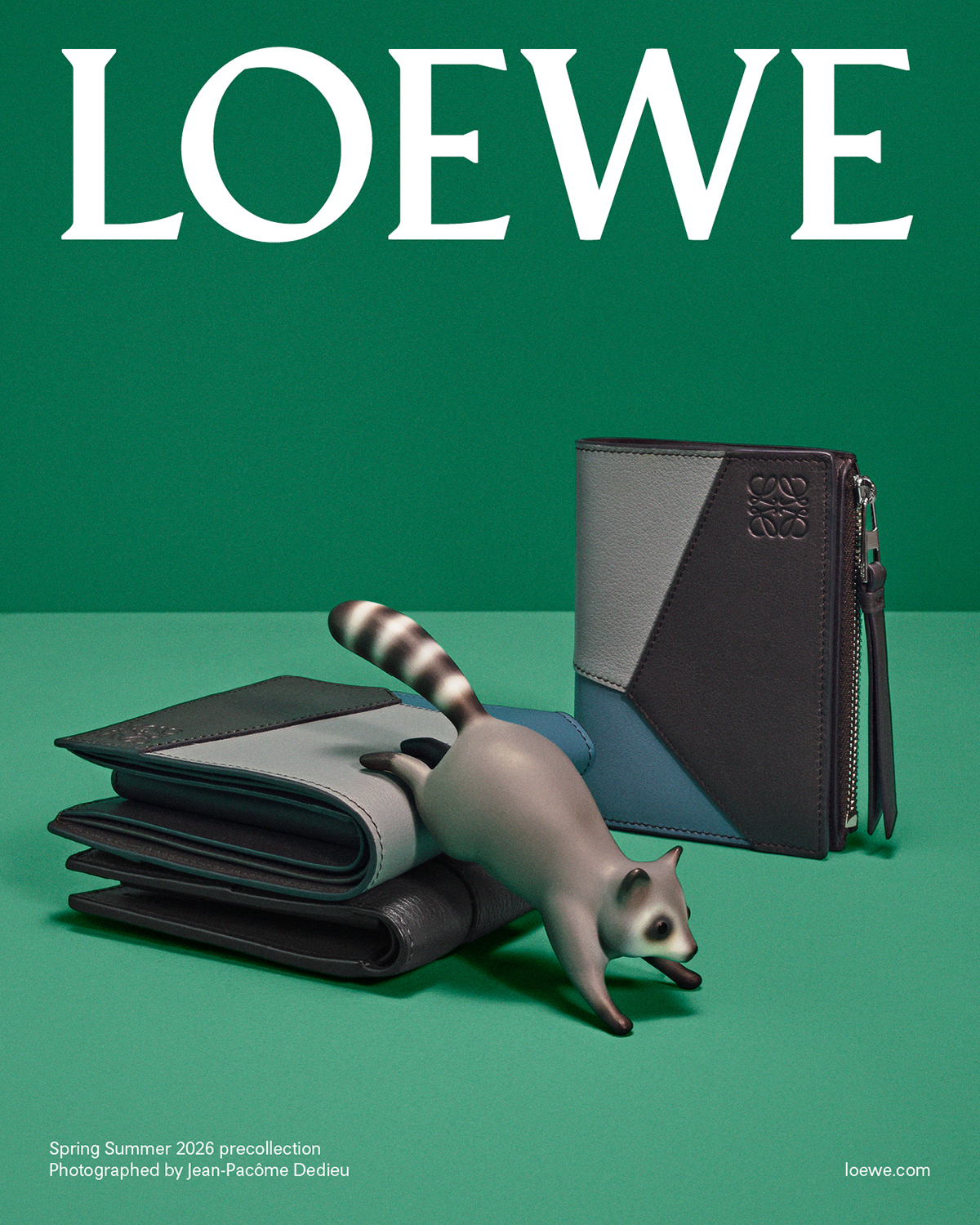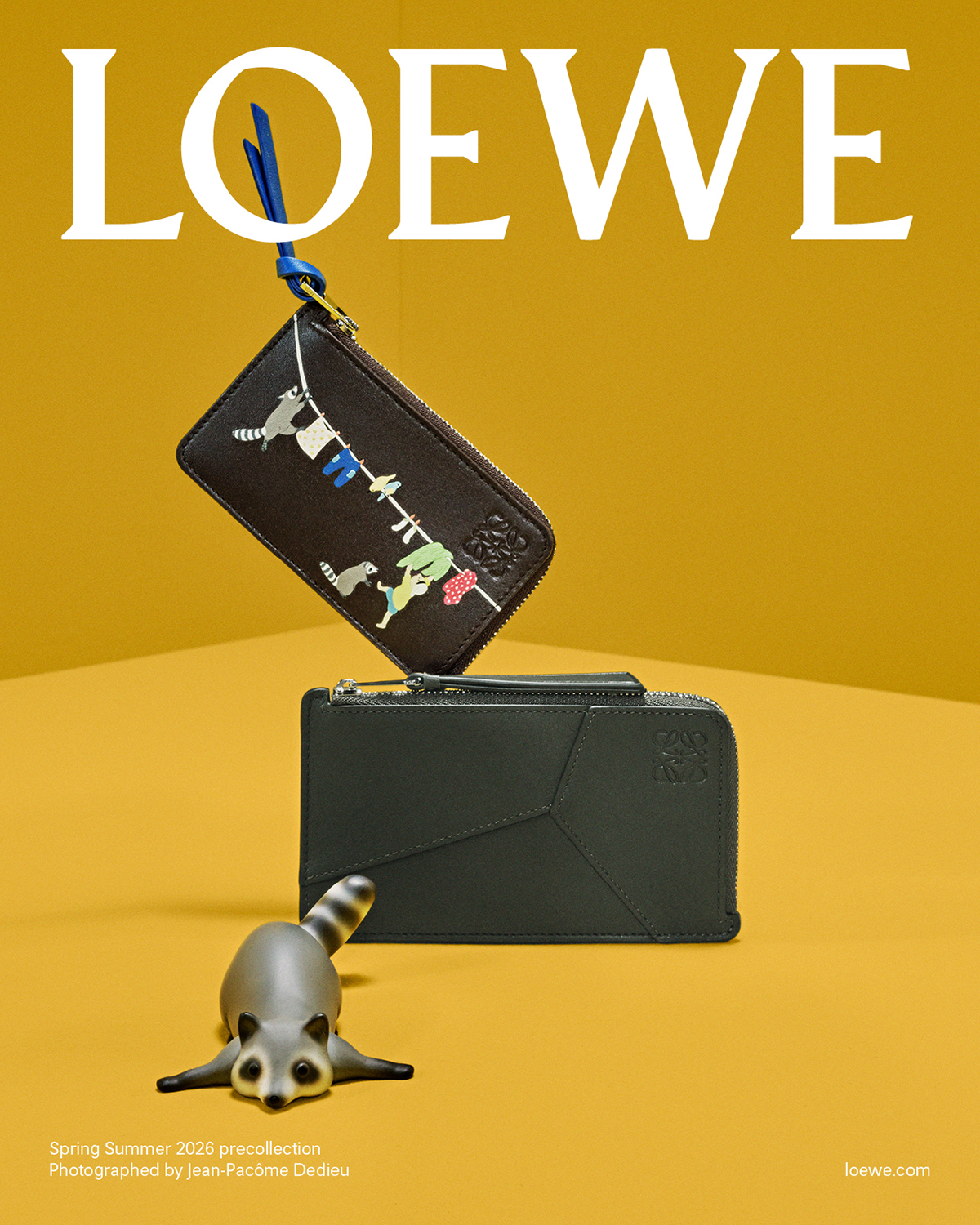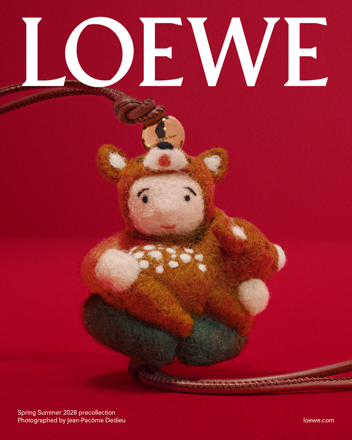 手描きにより小さな情景を紡ぎ出すスナ・フジタの独創的な世界がLOEWEのバッグや革小物、アクセサリーに宿り、アイコニックなデザインと物語的なディテール、そして精緻なクラフトが融合。さらには、スナ・フジタの世界にインスパイアされたシアリングのコートも登場している。