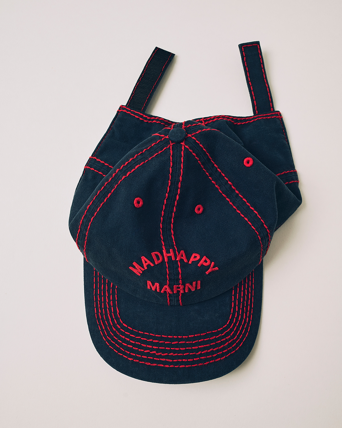 フーディはフード周りにMadhappyの特徴的なハンドステッチが施され、ベースボールキャップはコントラストの効いたシームが特徴的。