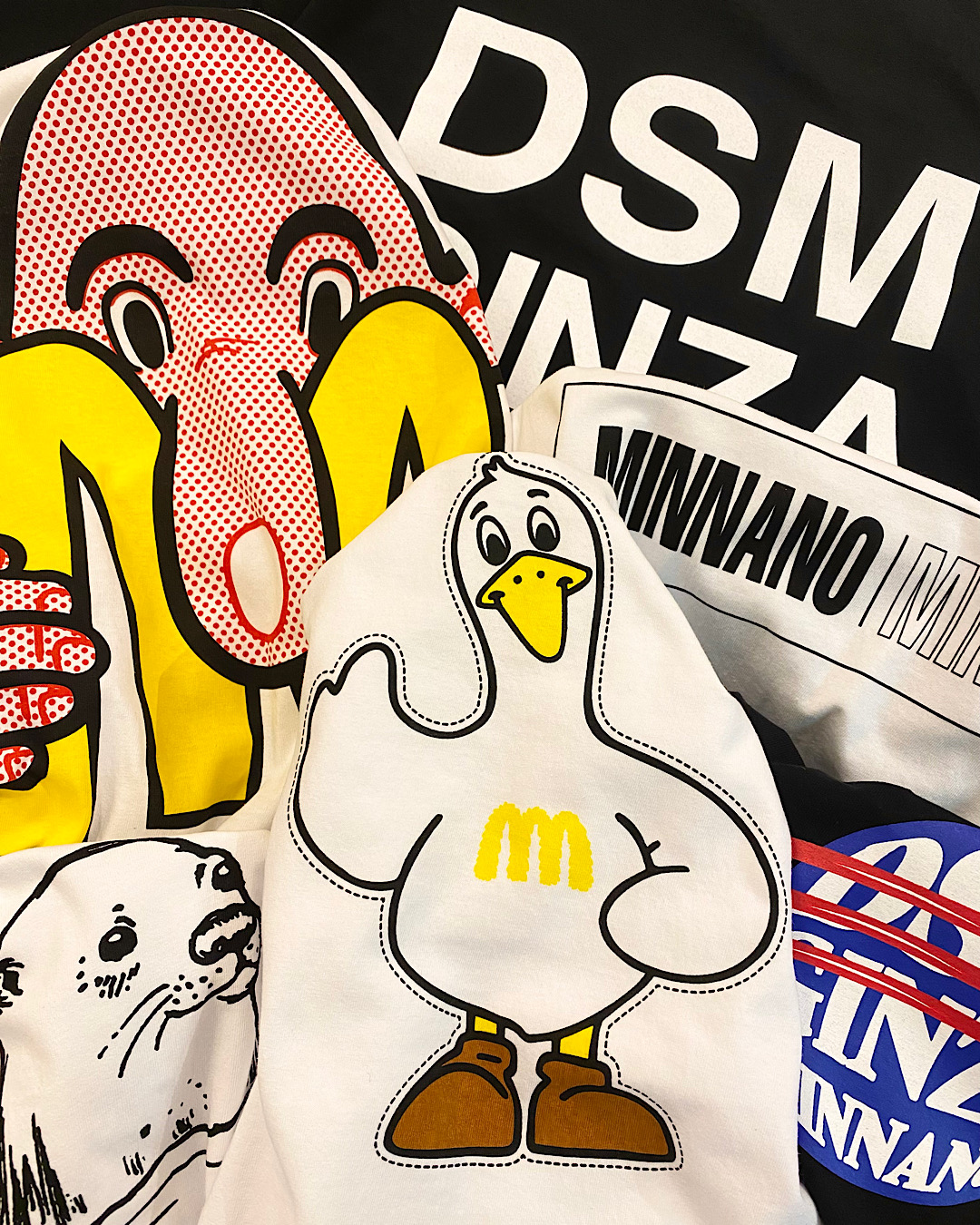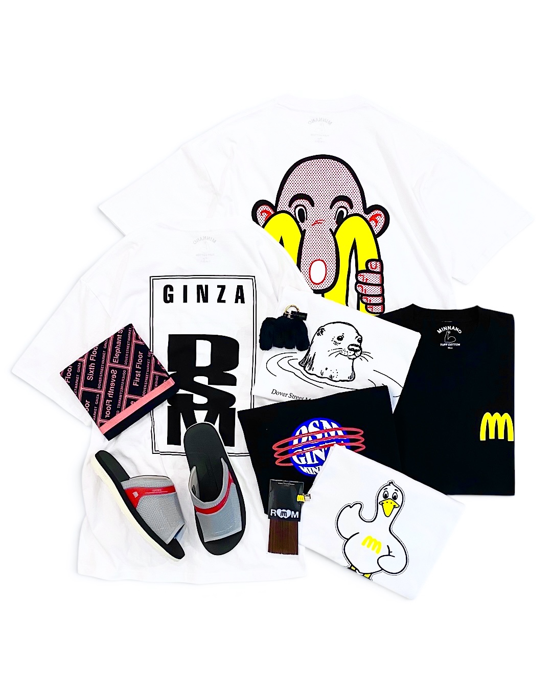 MIN-NANO単独としてはおよそ2年半ぶりとなるDOVER STREET MARKET GINZAとのタッグだが、今回はEric Elms(エリック・エルムズ)やSHINKNOWNSUKEのグラフィックを用いたTシャツに加え、バンダナ、チャーム等の小物も展開。
