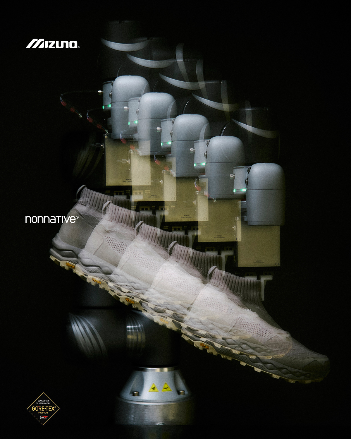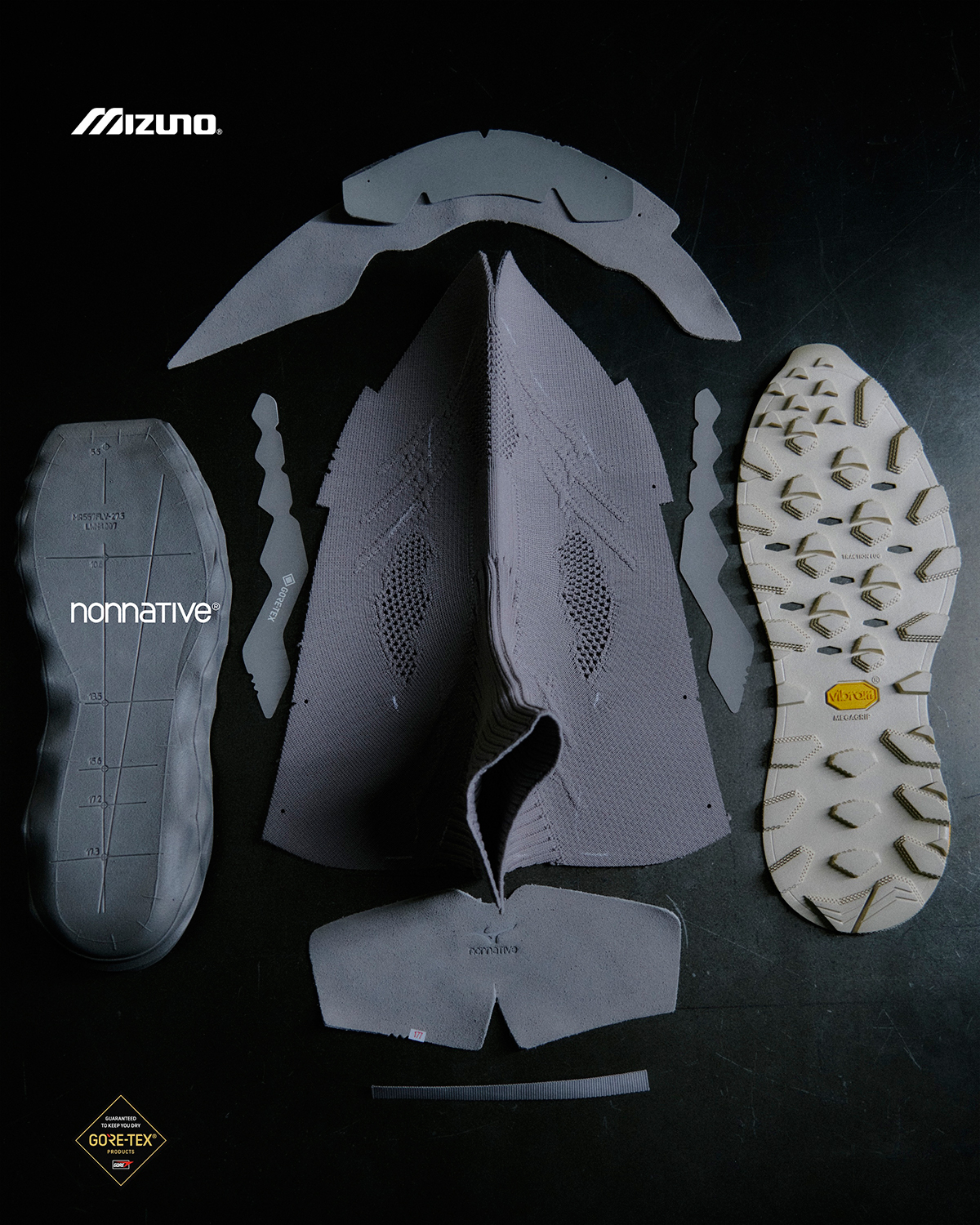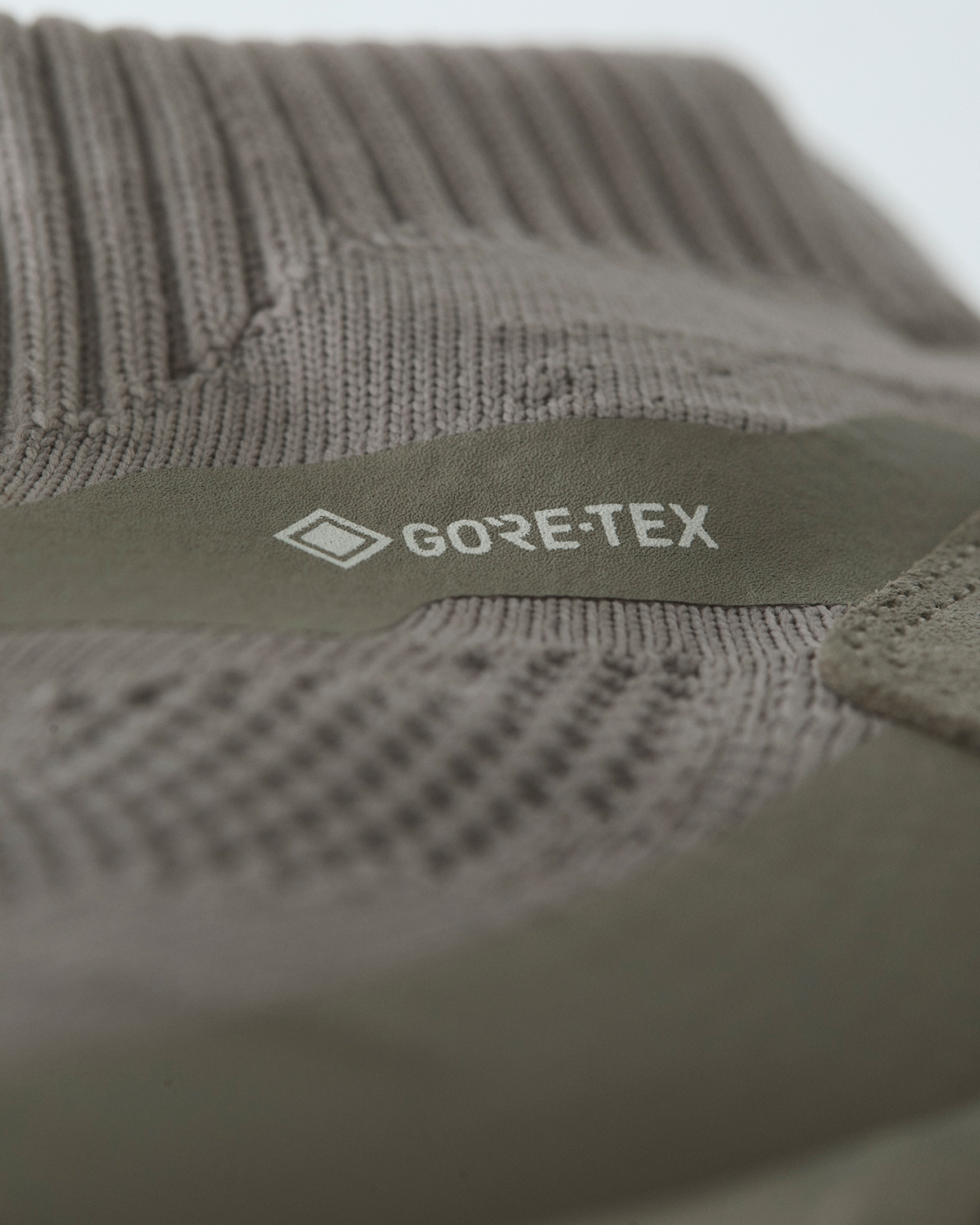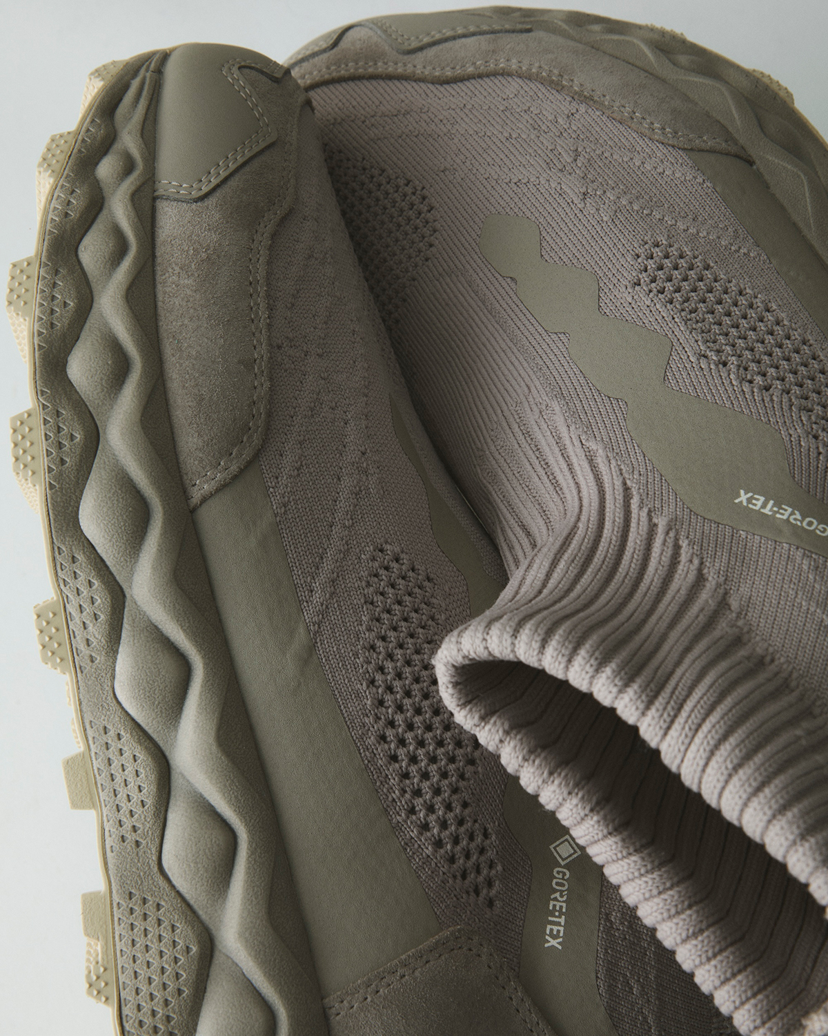 また、ソールサイドのダイヤパターンも、よりボリューム感を強調するデザインへとアップデート。ノーソーデザインがアイコニックなアッパーは、ニット、天然皮革、GORE-TEX®︎の異素材で構成している。
