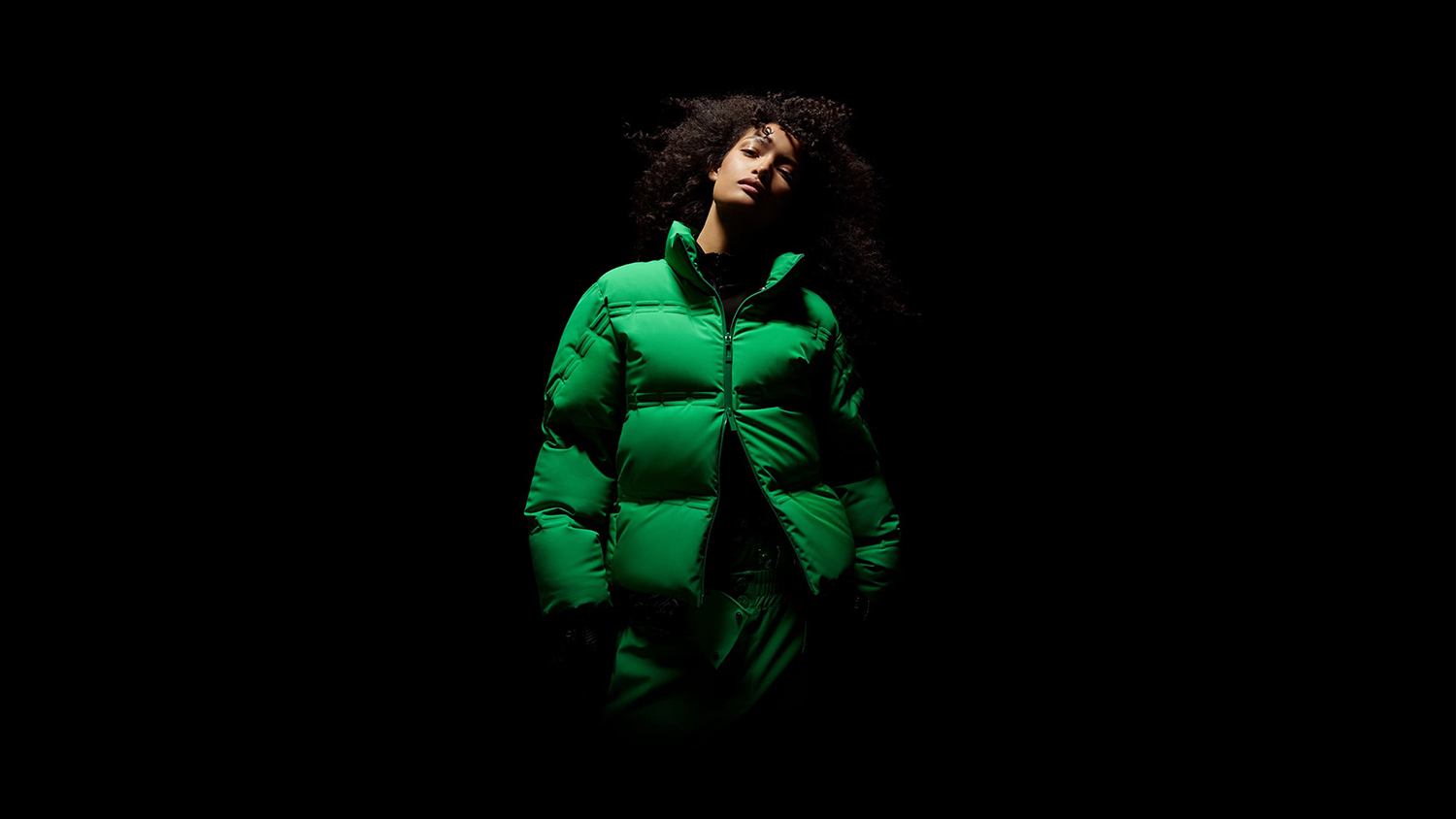 ヴィンテージのスキーウェアから着想を得たコレクションでは、ラバレッド、エレクトリックインディゴ、ブライトエメラルドといった大胆なカラーブロッキングを採用。