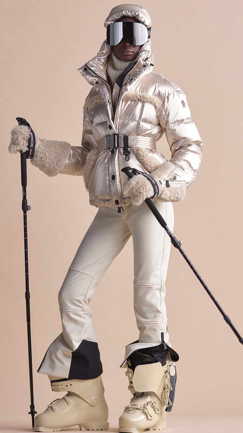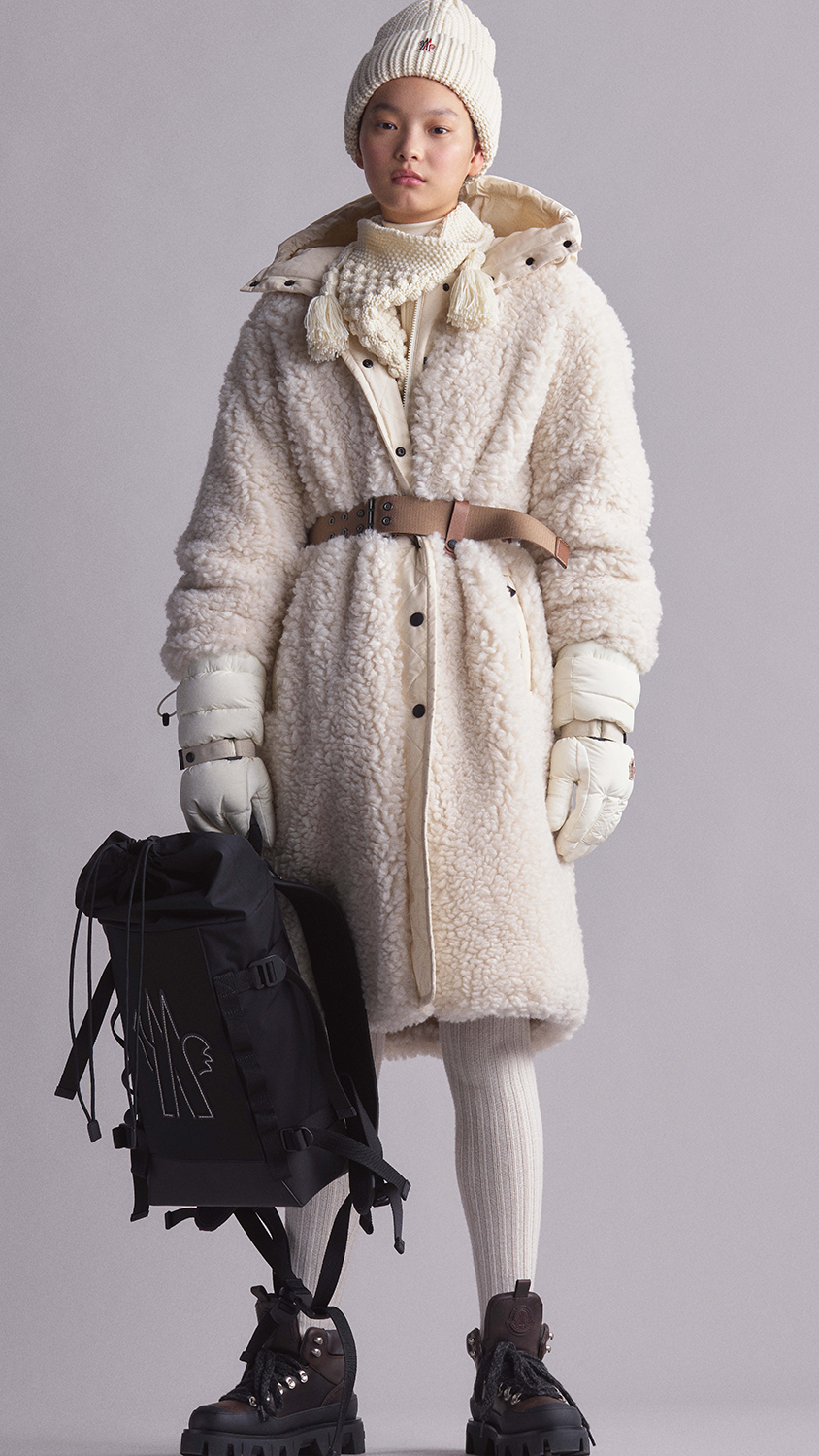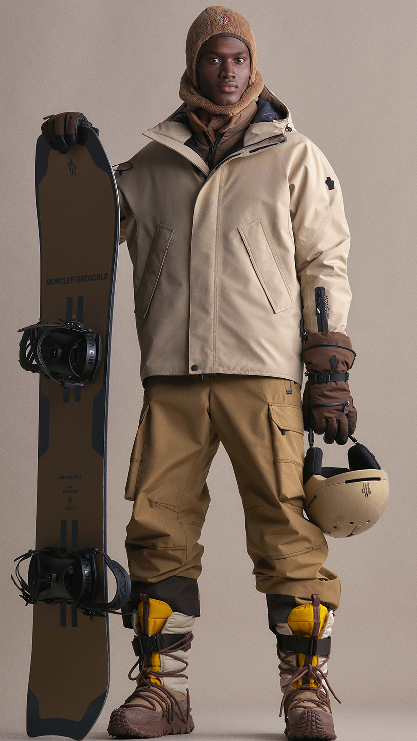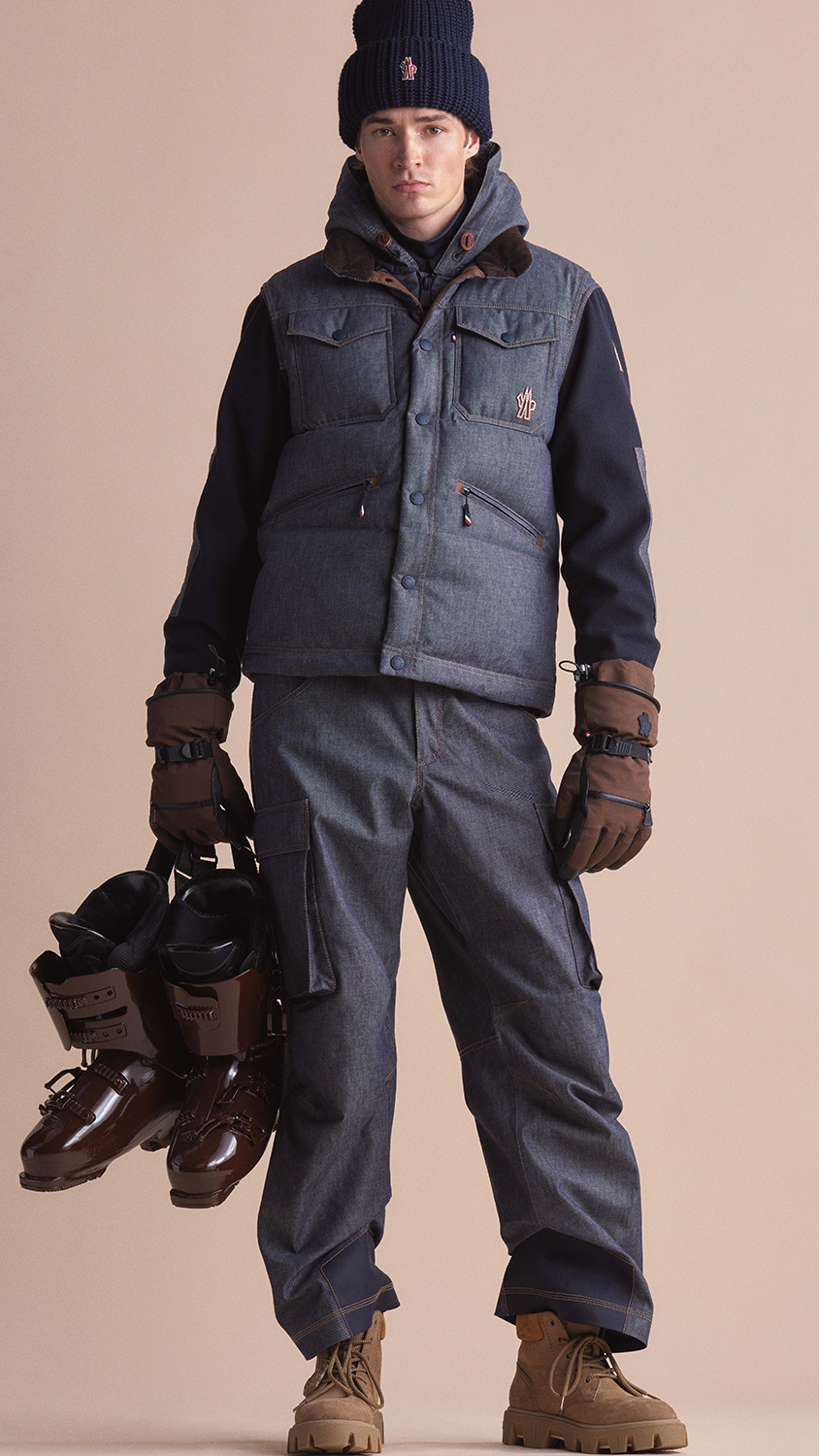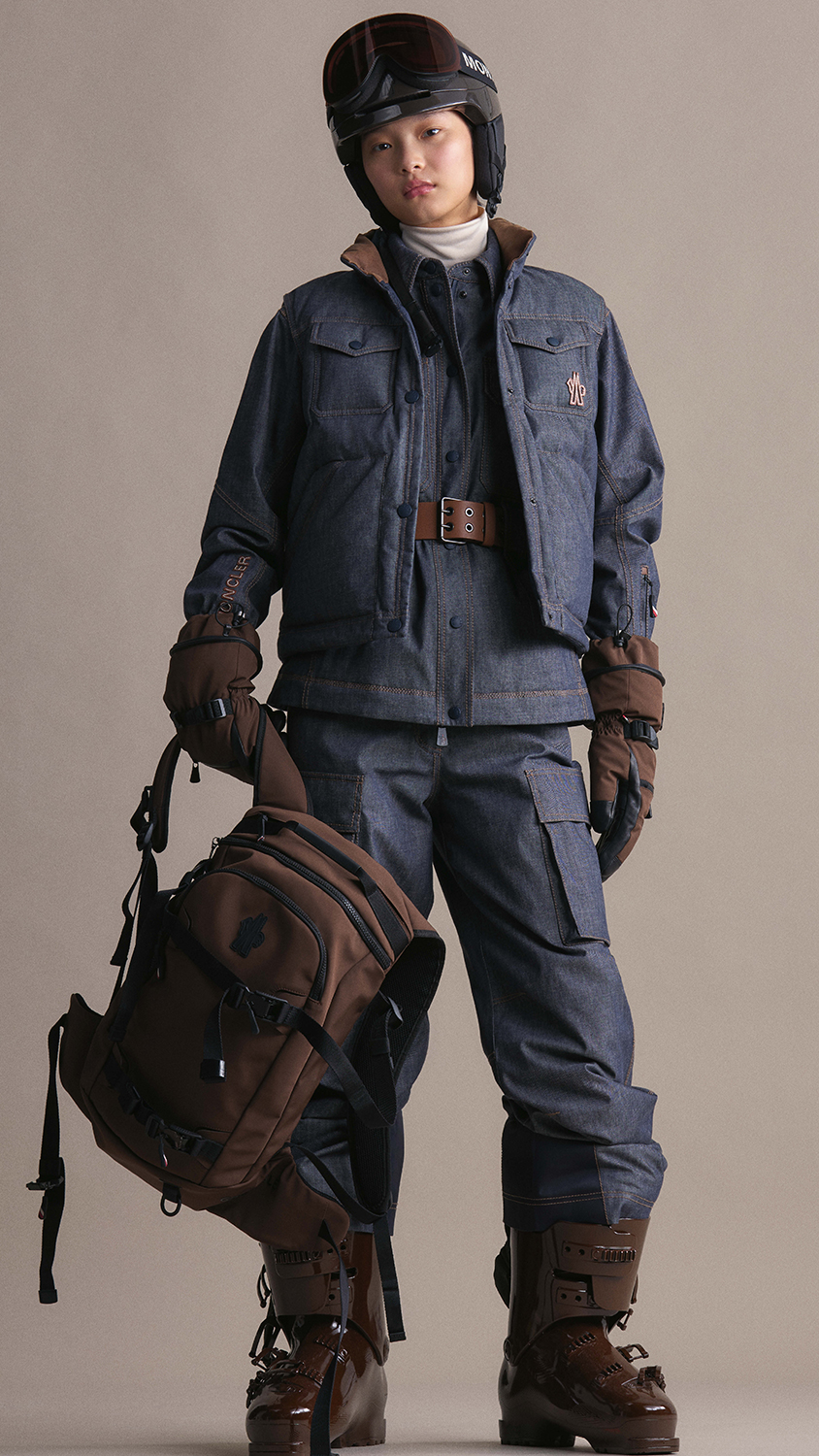 デニムスキースーツとして再構築されたり、アプレスキーのエレガンスを意識したシアリングトリム付きウールギャバジンコートに仕立てられたりと、現代のマウンテンスタイルが自然体で洗練された美意識で表現されている。