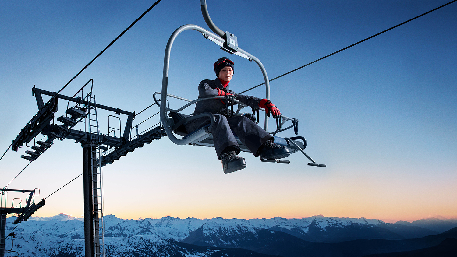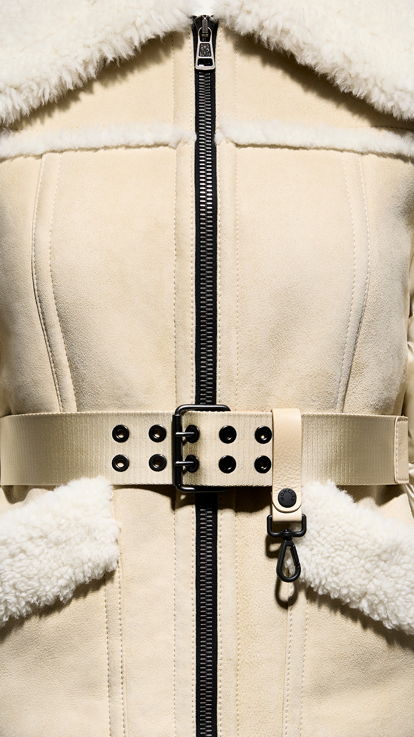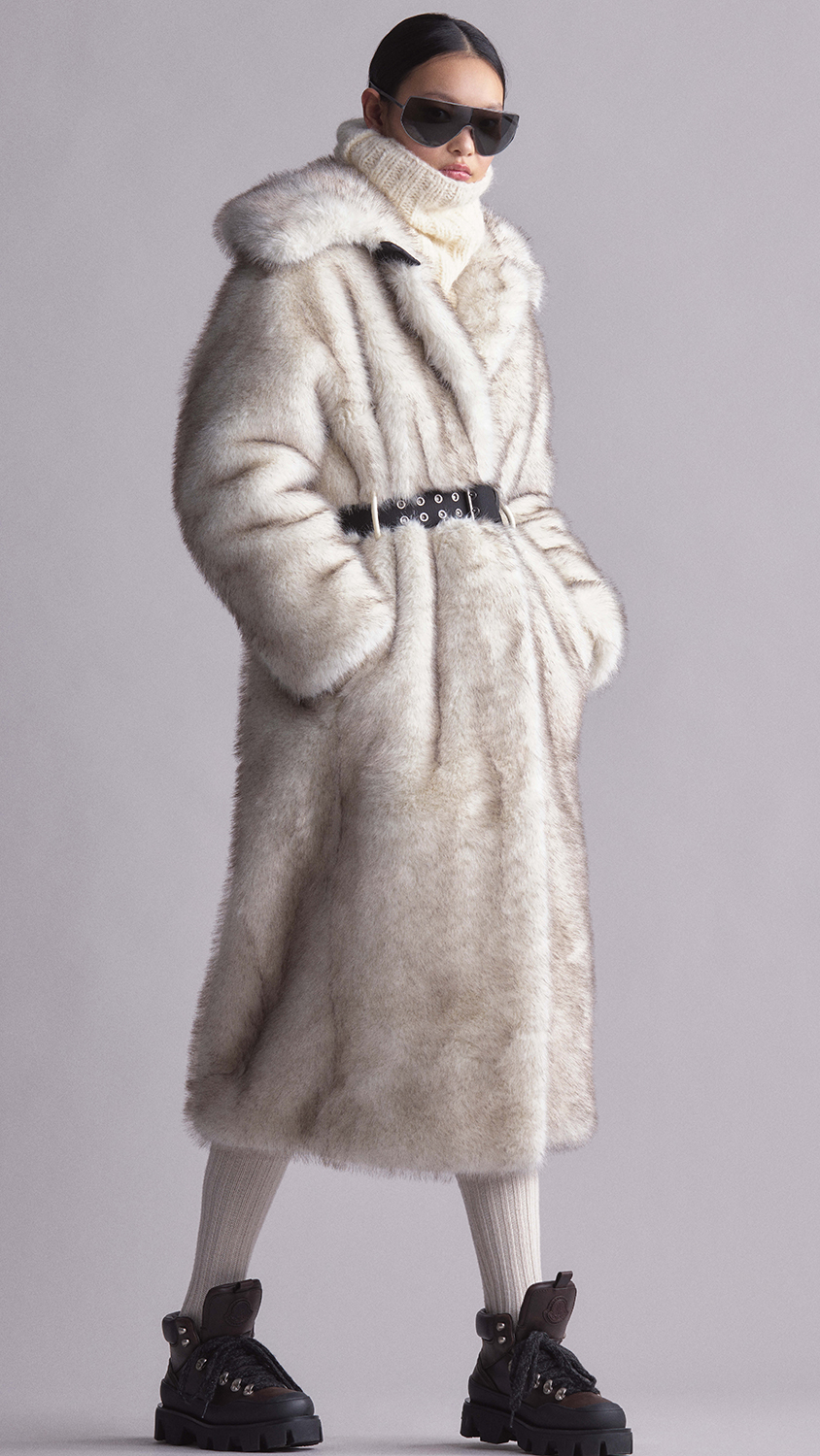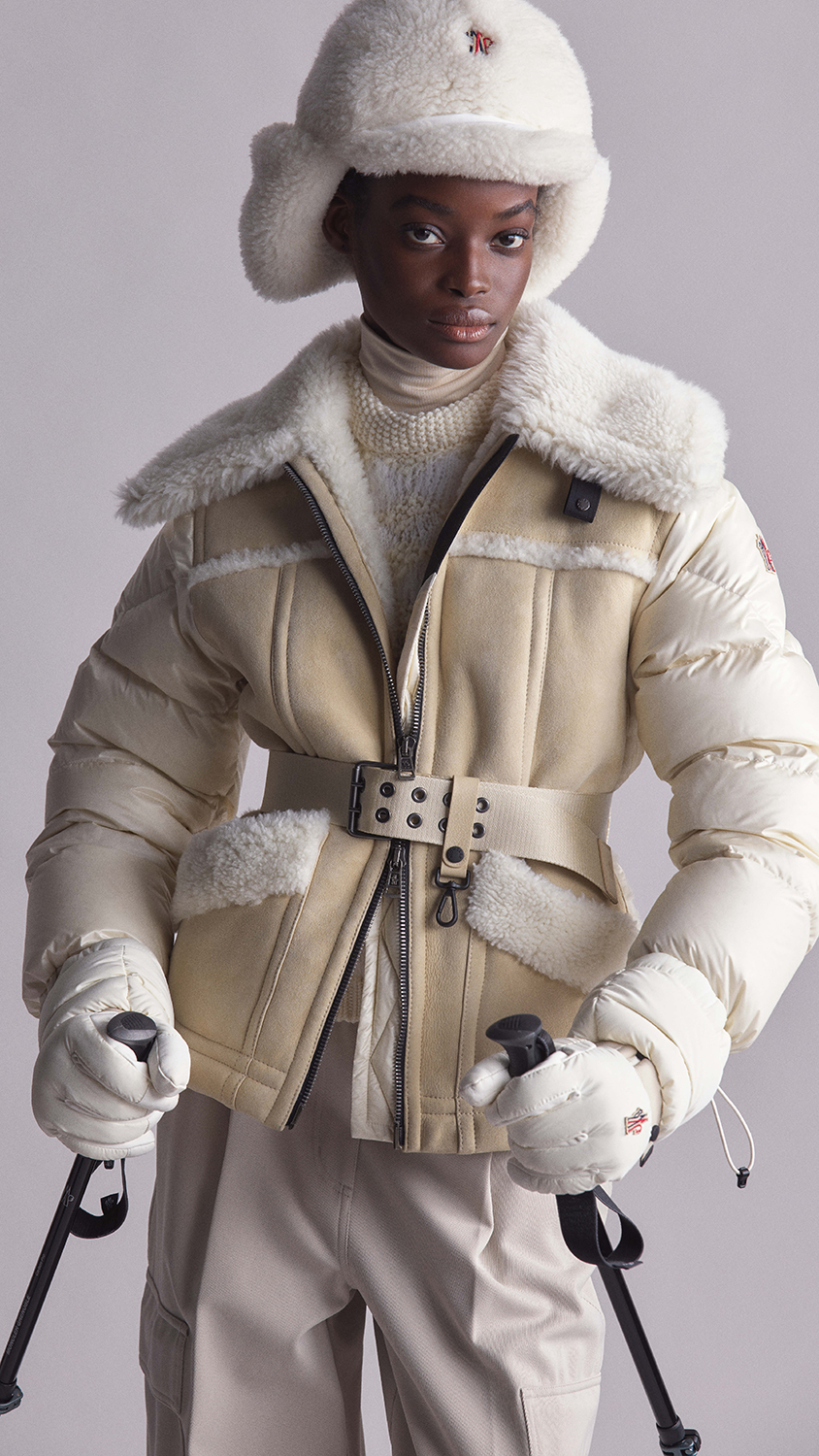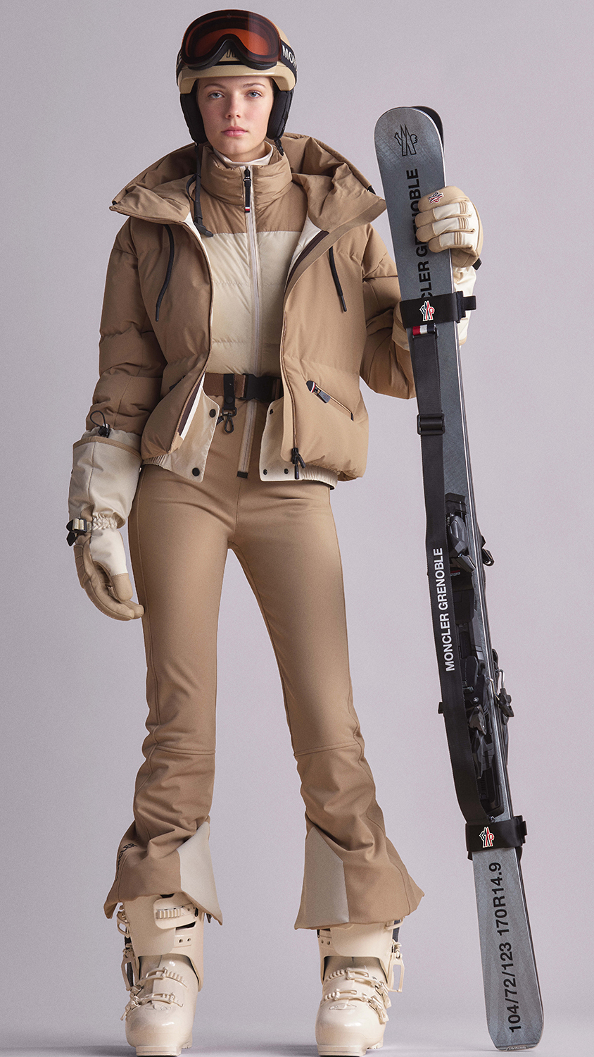 デニムスキースーツとして再構築されたり、アプレスキーのエレガンスを意識したシアリングトリム付きウールギャバジンコートに仕立てられたりと、現代のマウンテンスタイルが自然体で洗練された美意識で表現されている。
