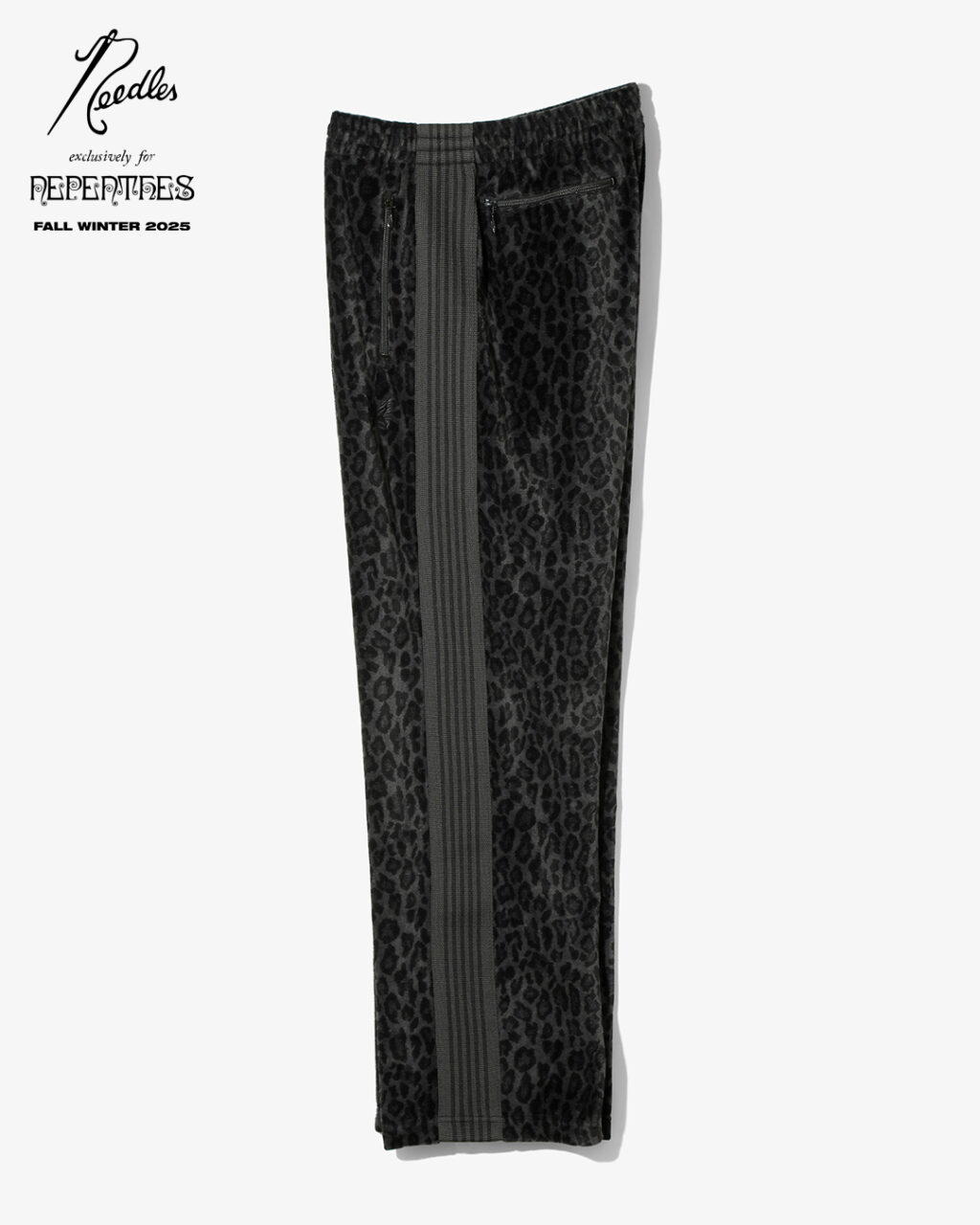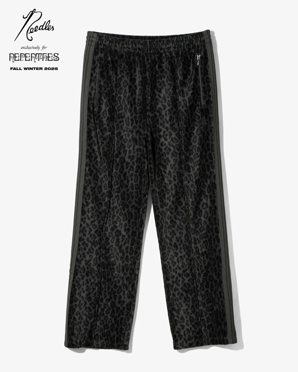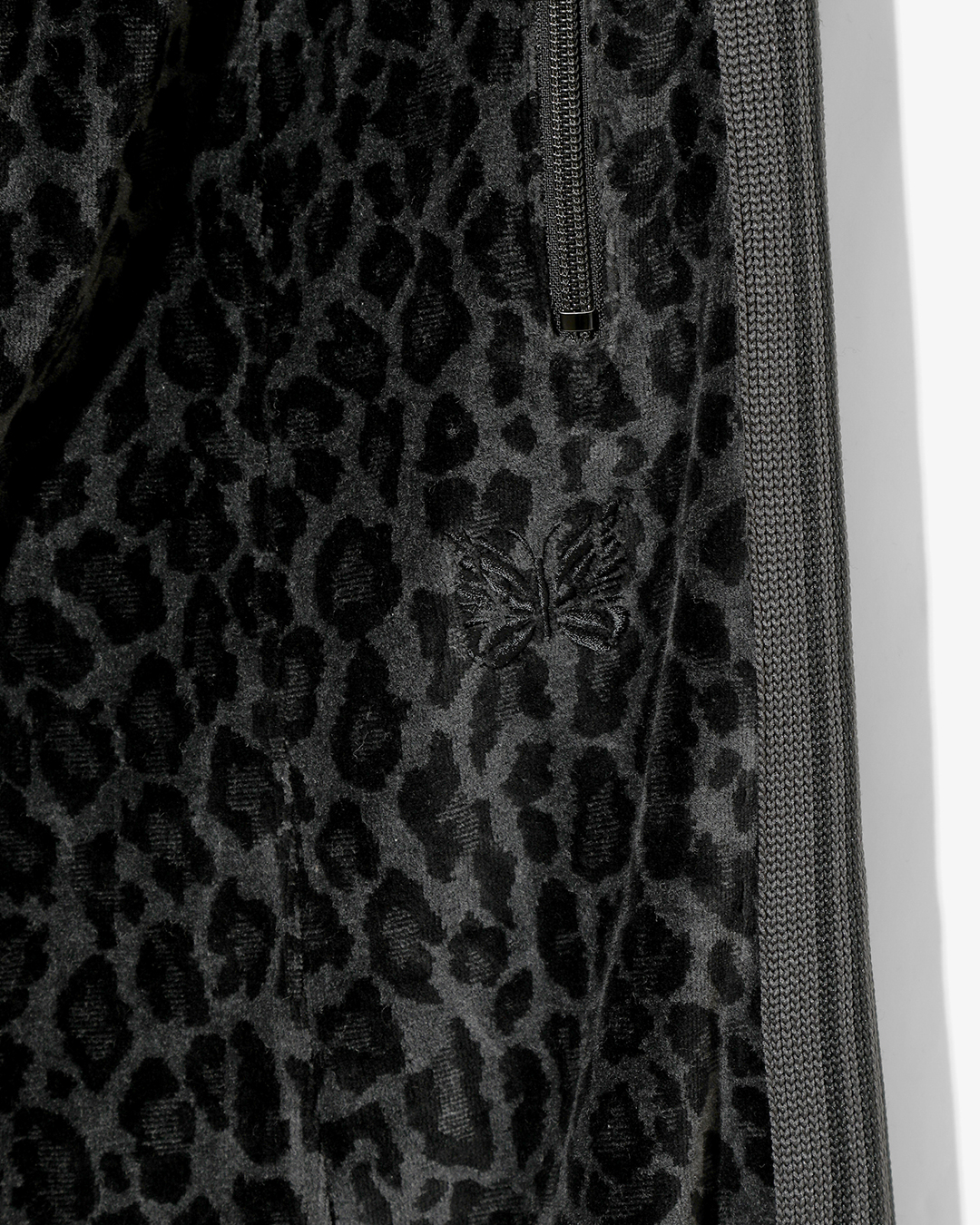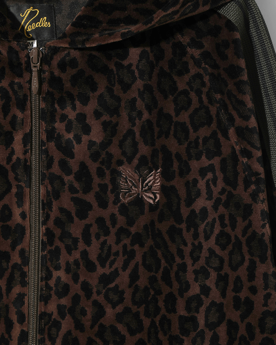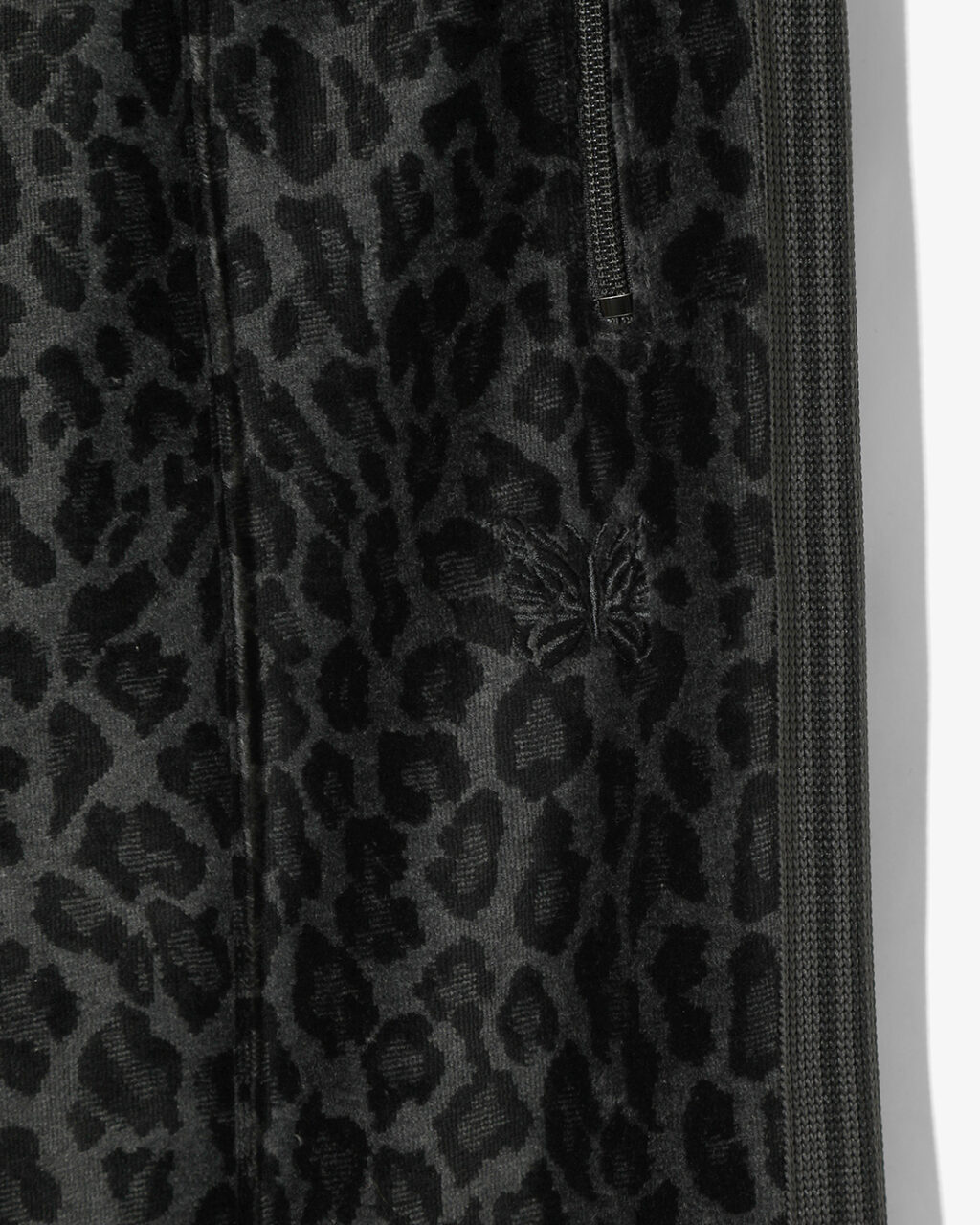今季は、NEEDLESを象徴するトラックシリーズを、艶やかな光沢と滑らかな質感をもつレオパード柄のベロア素材で製作。