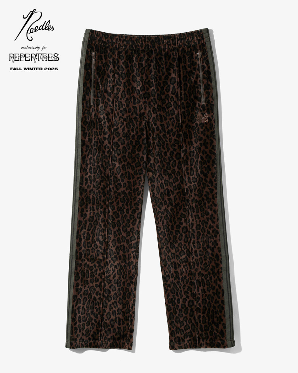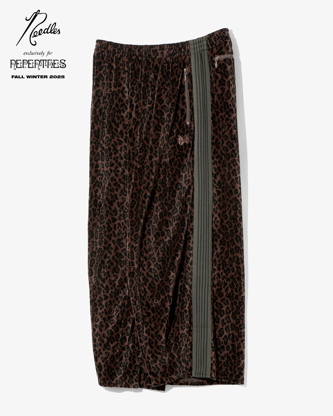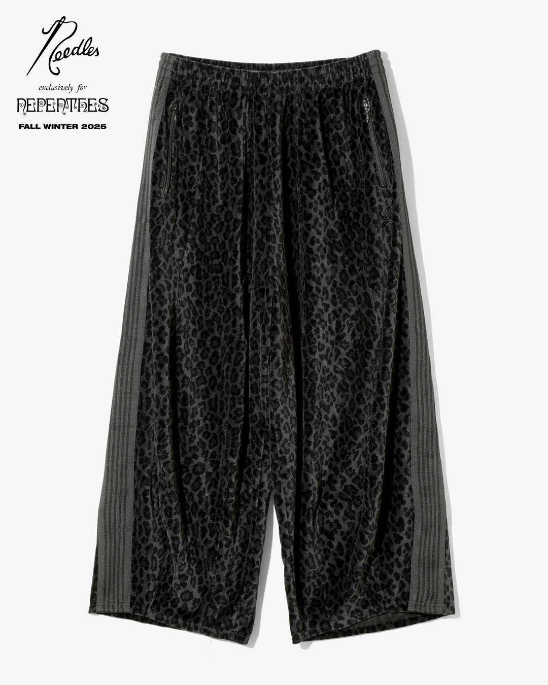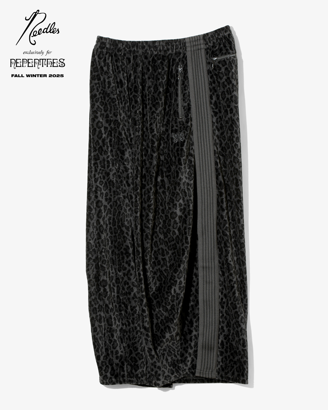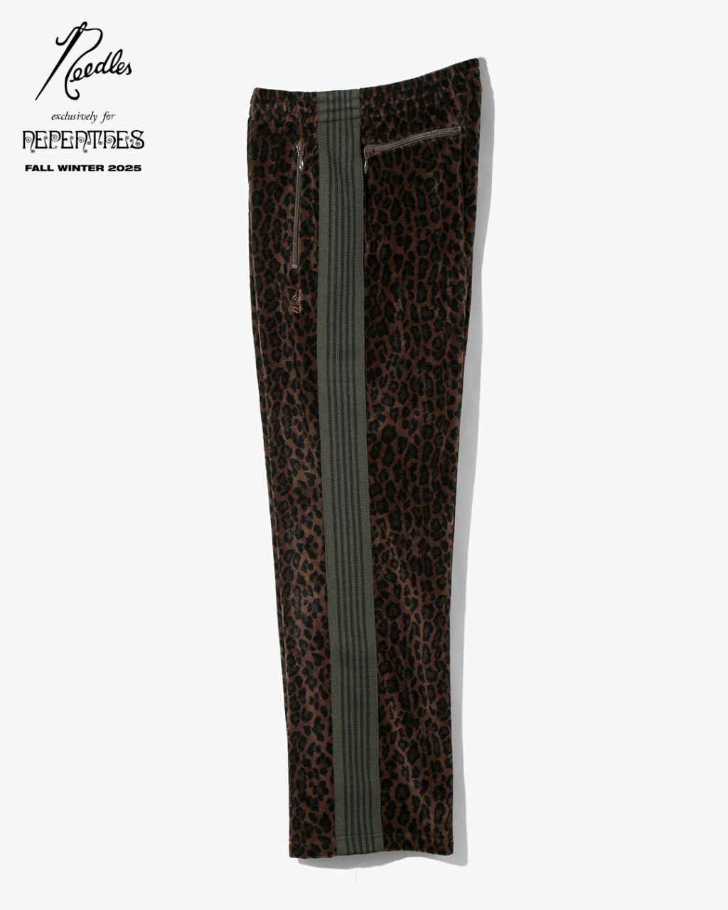今季は、NEEDLESを象徴するトラックシリーズを、艶やかな光沢と滑らかな質感をもつレオパード柄のベロア素材で製作。