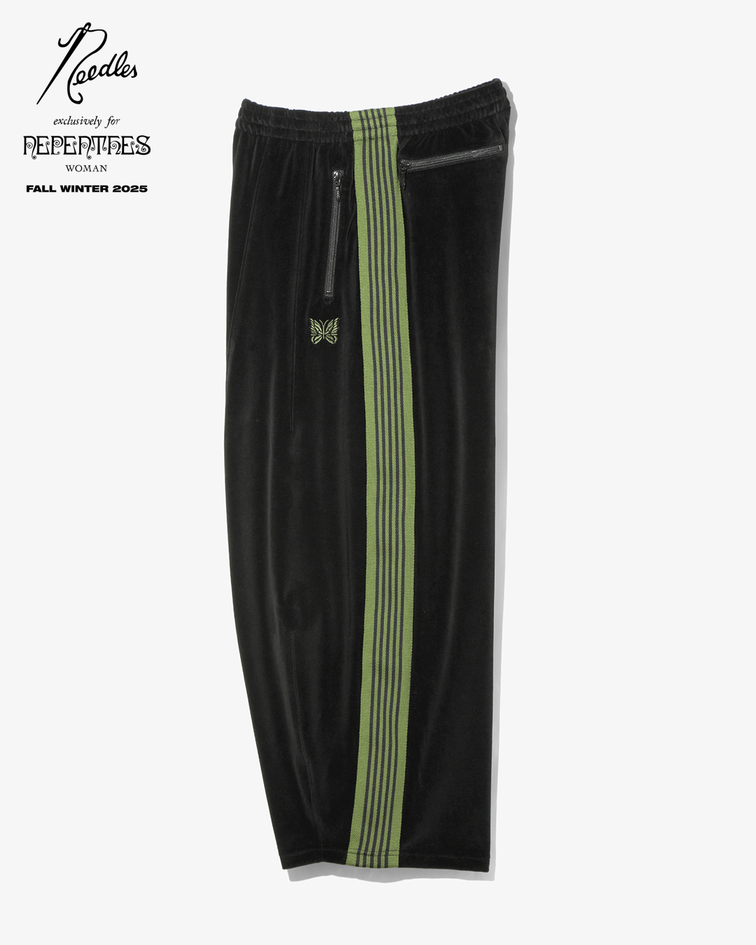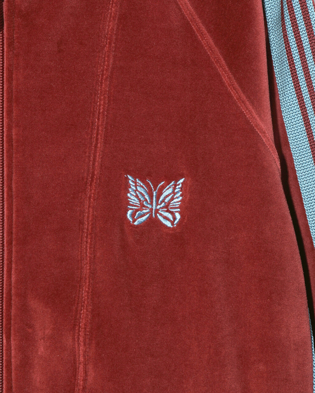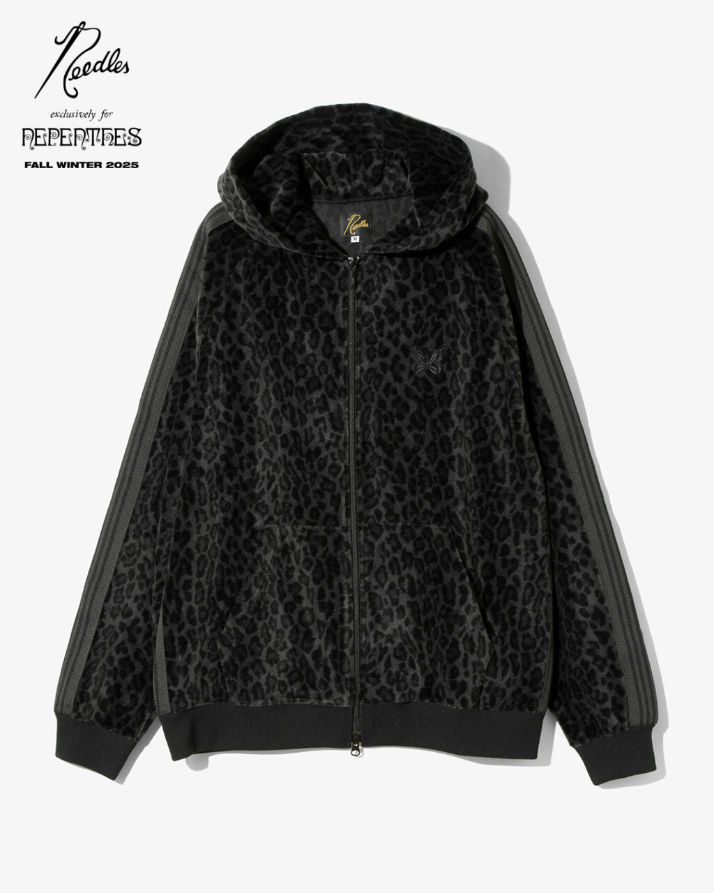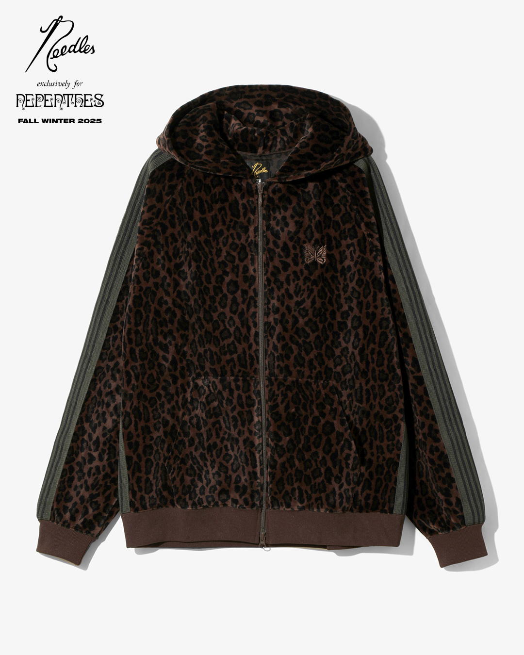 今季は、NEEDLESを象徴するトラックシリーズを、艶やかな光沢と滑らかな質感をもつレオパード柄のベロア素材で製作。