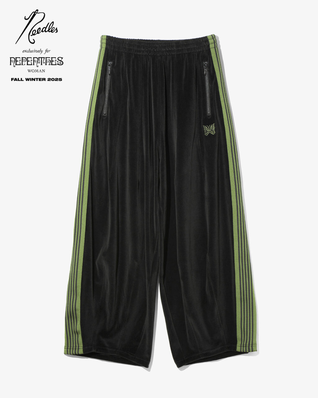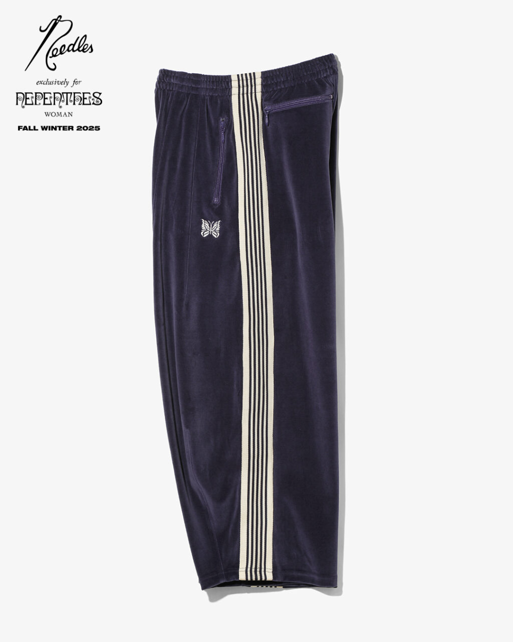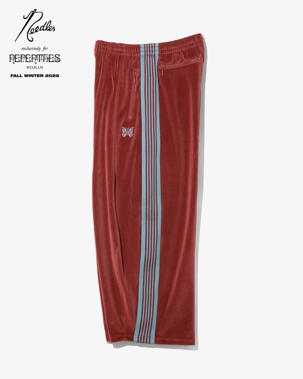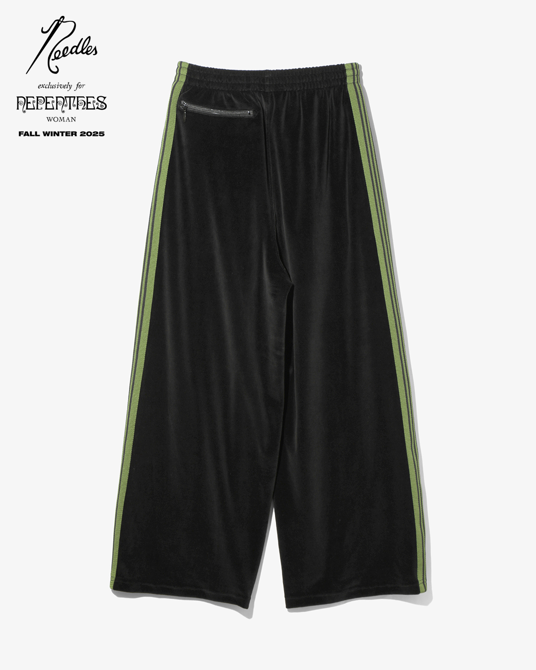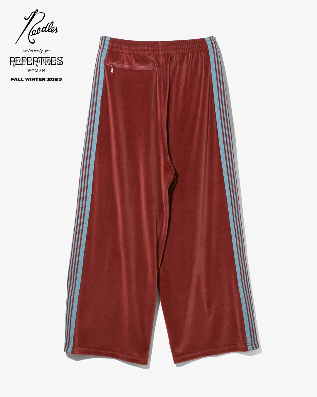 今季は、NEEDLESを象徴するトラックシリーズを、艶やかな光沢と滑らかな質感をもつレオパード柄のベロア素材で製作。