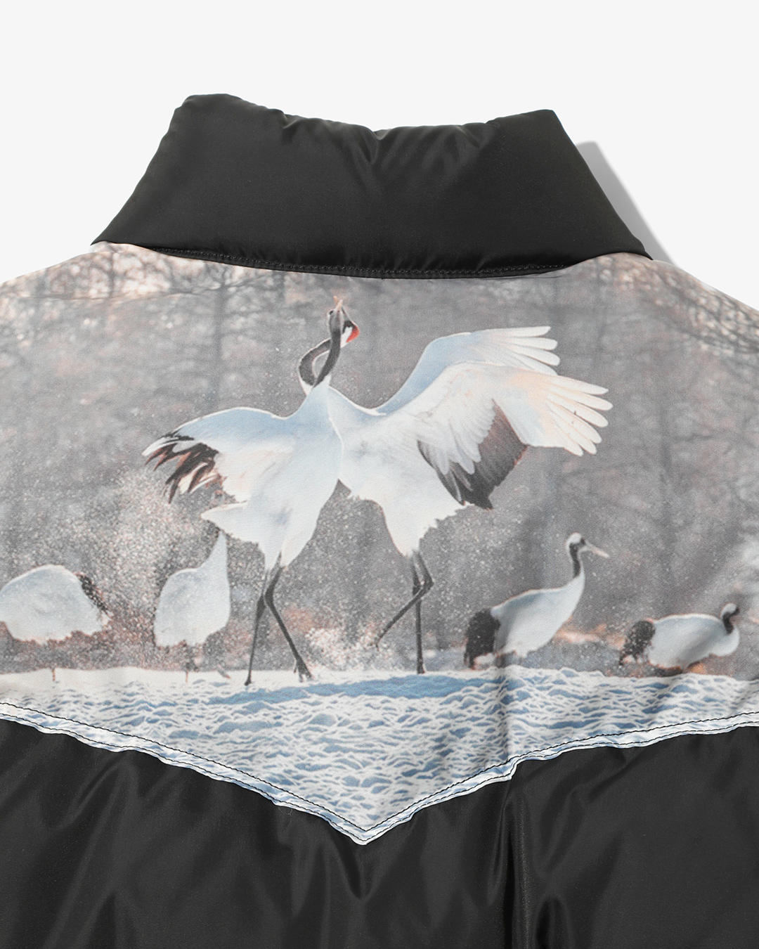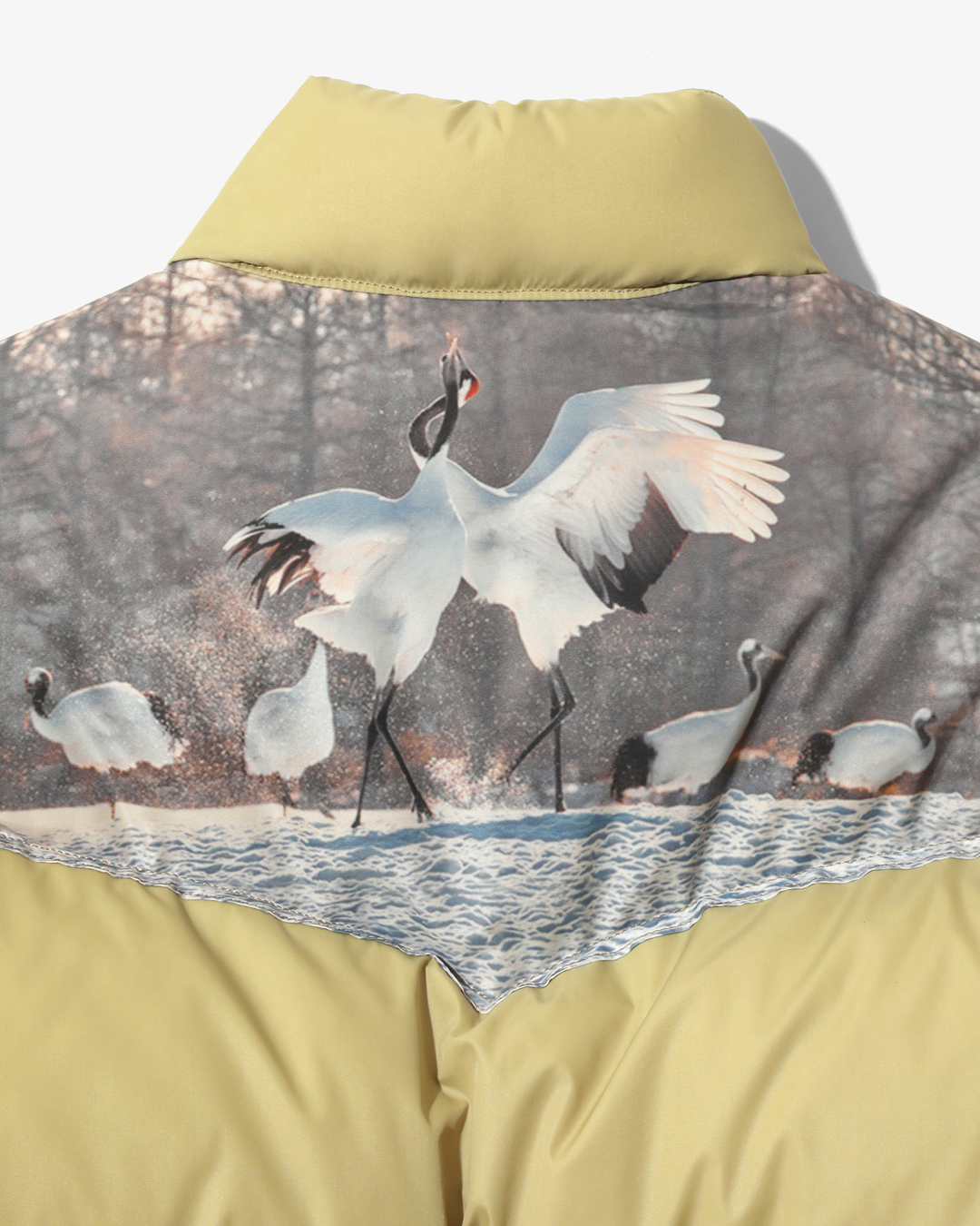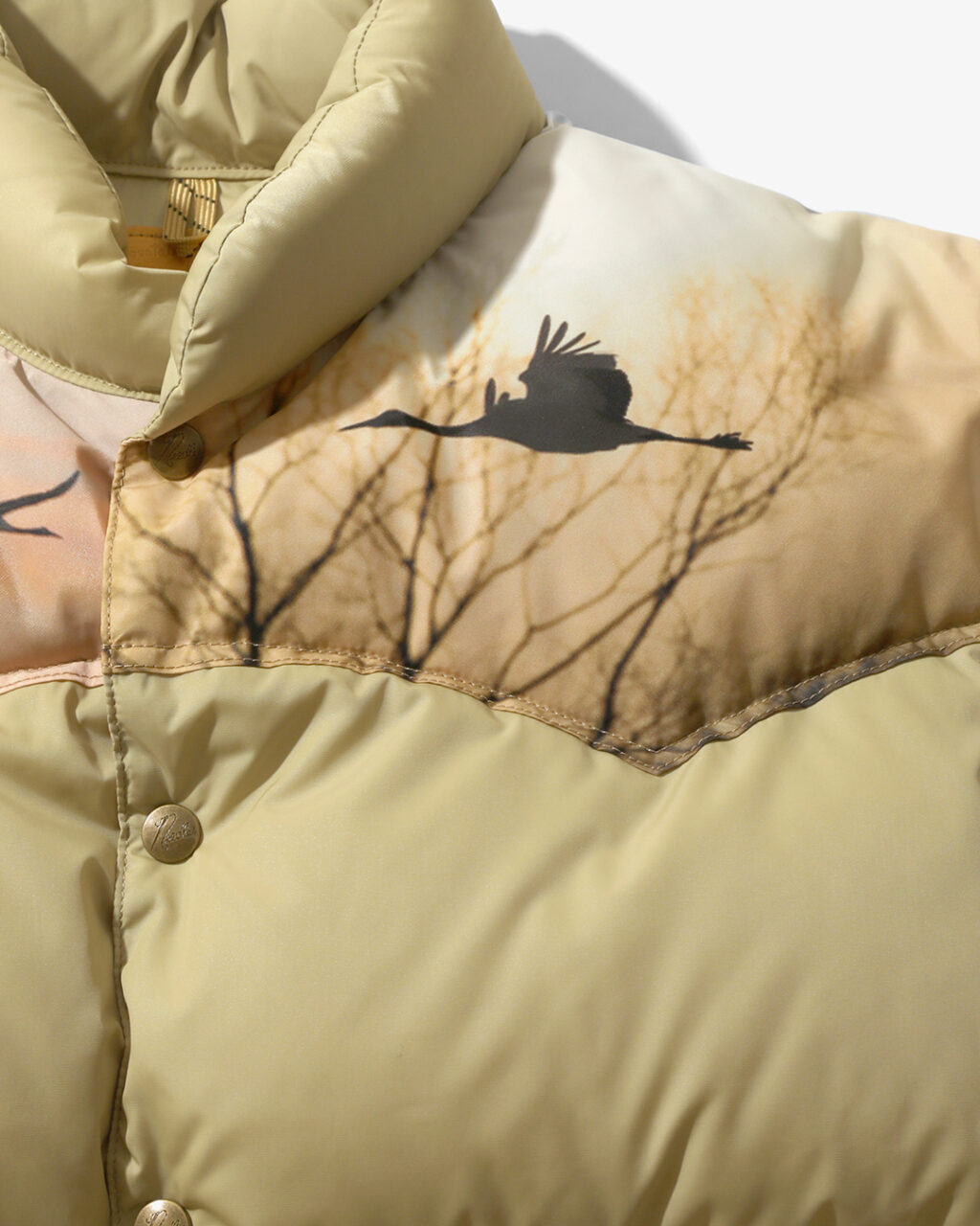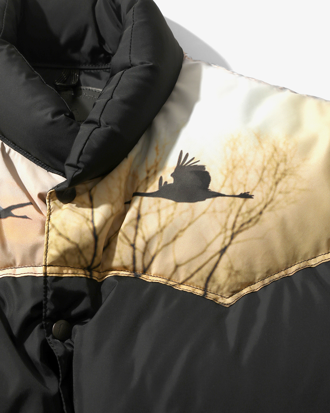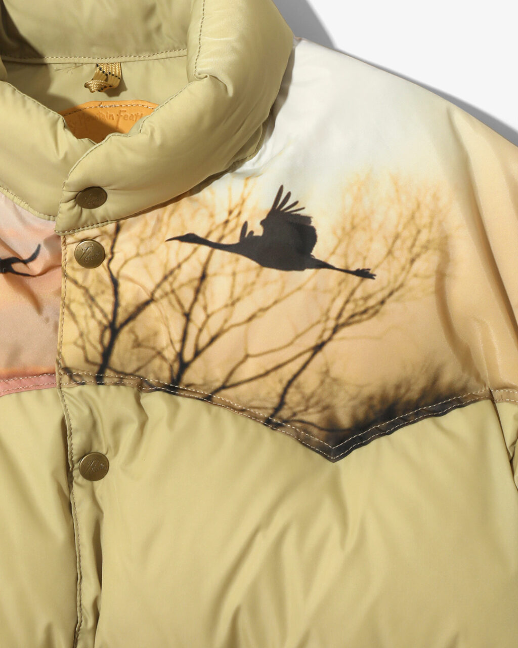 通常は一枚革で仕立てられるレザーヨークをあえて排除し、夕景や雪原を舞う丹頂鶴のフォトプリントを配したコラボレーションならではの仕様がポイントとなっている。