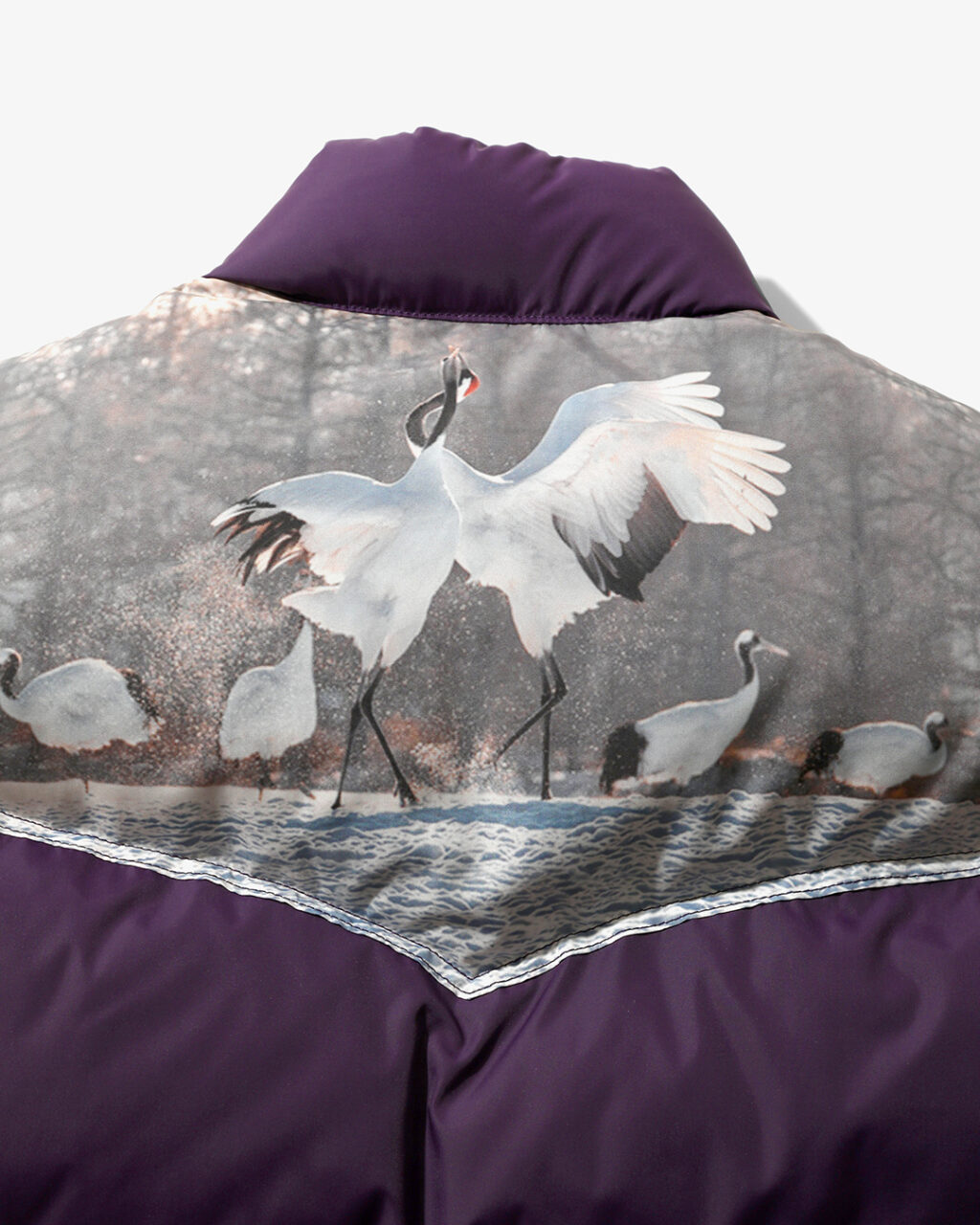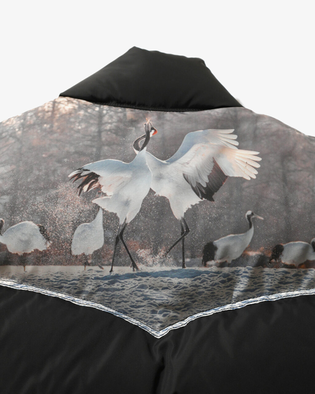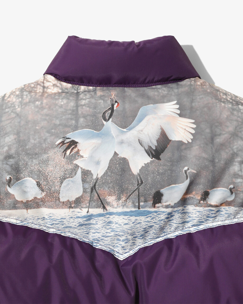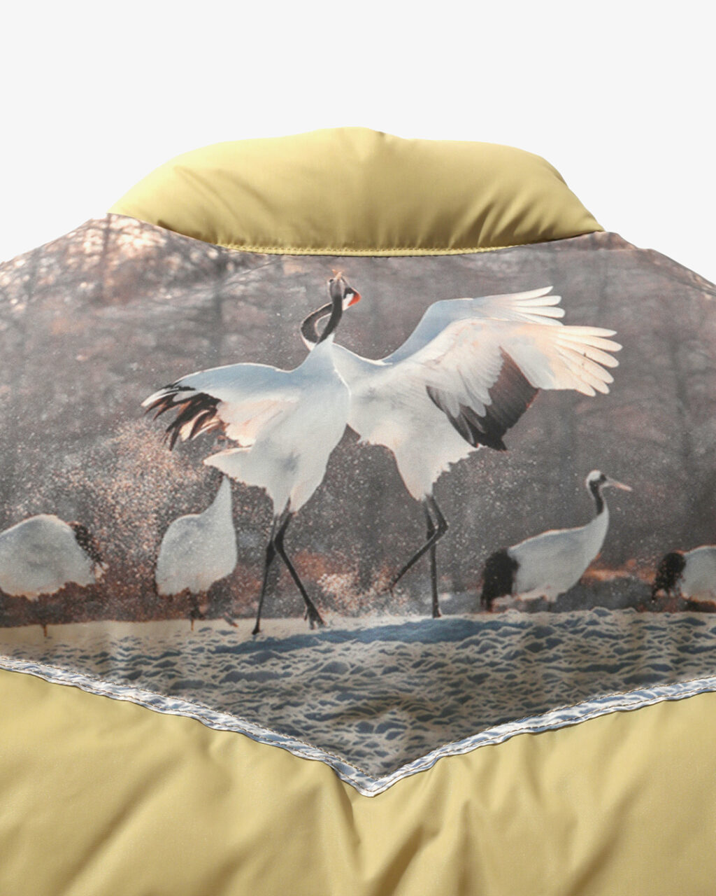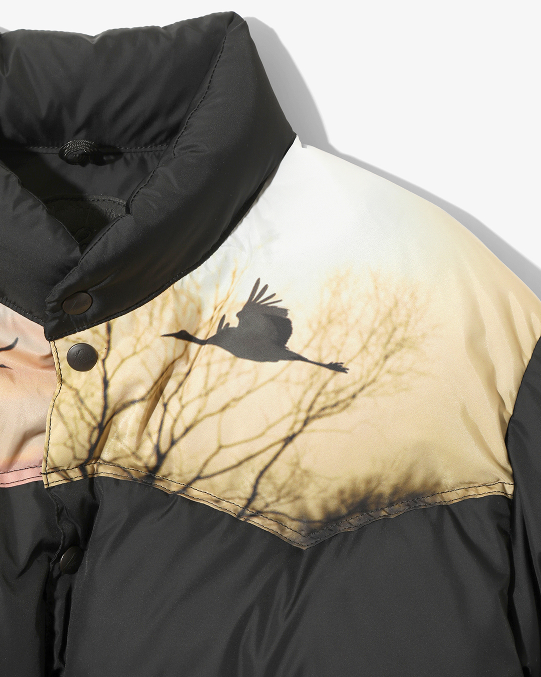 通常は一枚革で仕立てられるレザーヨークをあえて排除し、夕景や雪原を舞う丹頂鶴のフォトプリントを配したコラボレーションならではの仕様がポイントとなっている。