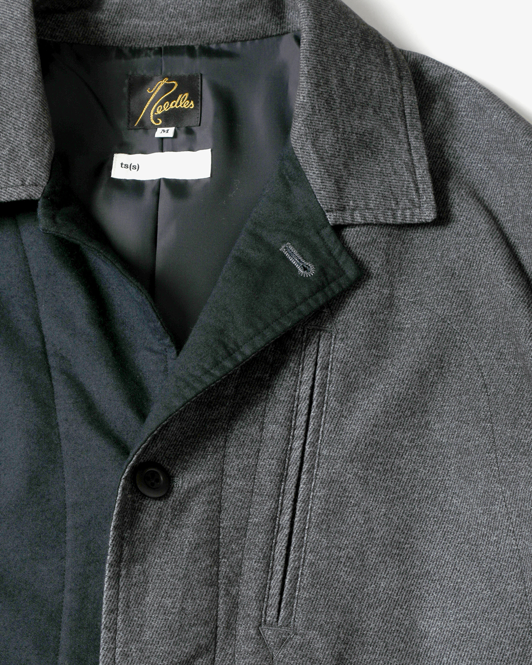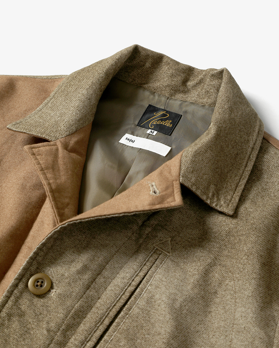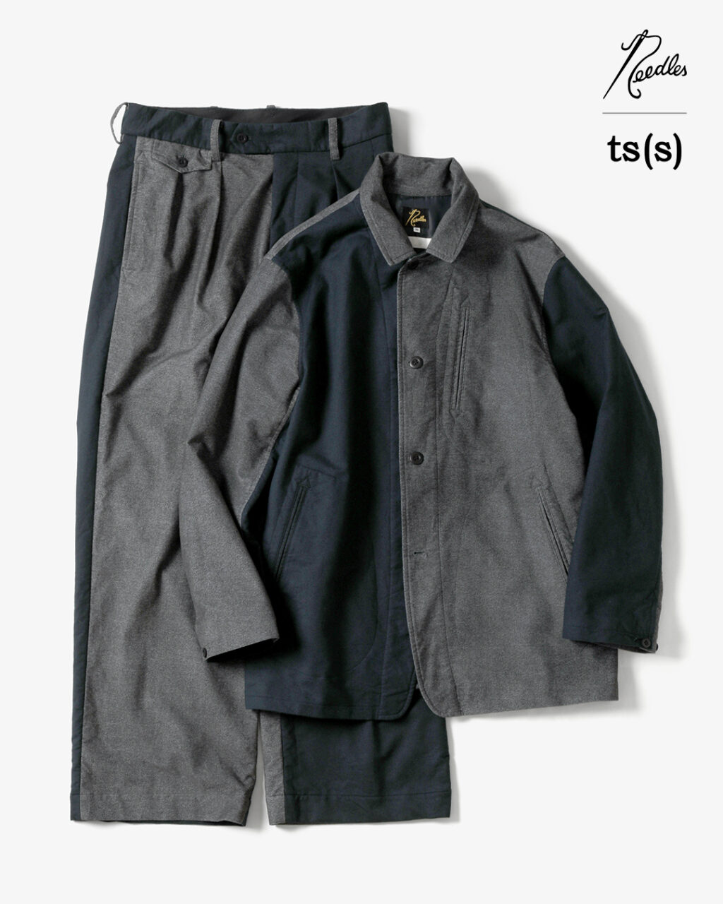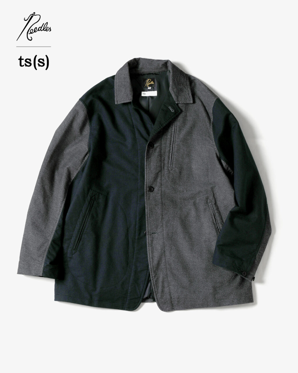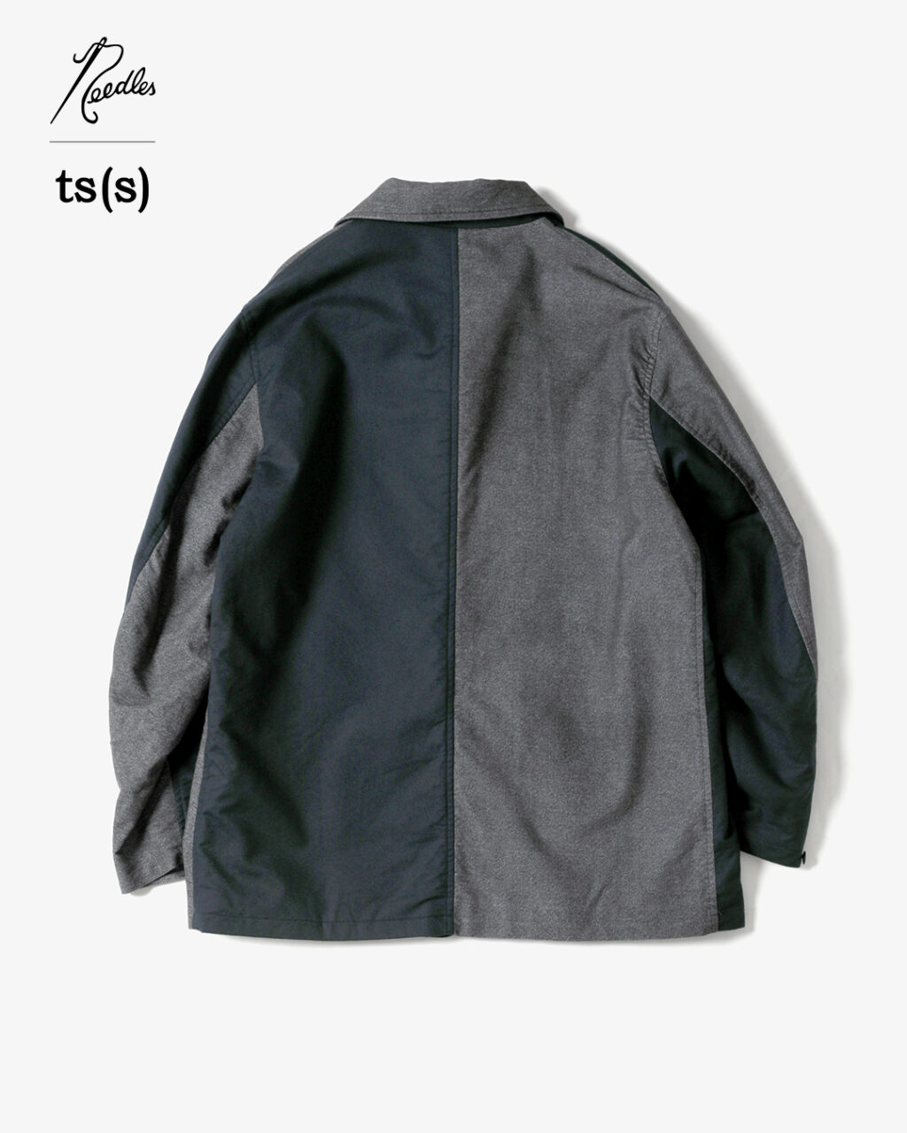 今季は、NEEDLESの定番モデルである『ARROW JACKET』を、ts(s)のインラインでも採用されている、 微起毛コットン/ポリウレタン生地の表面と裏面を組み合わせてクレイジーパターンにアレンジ。