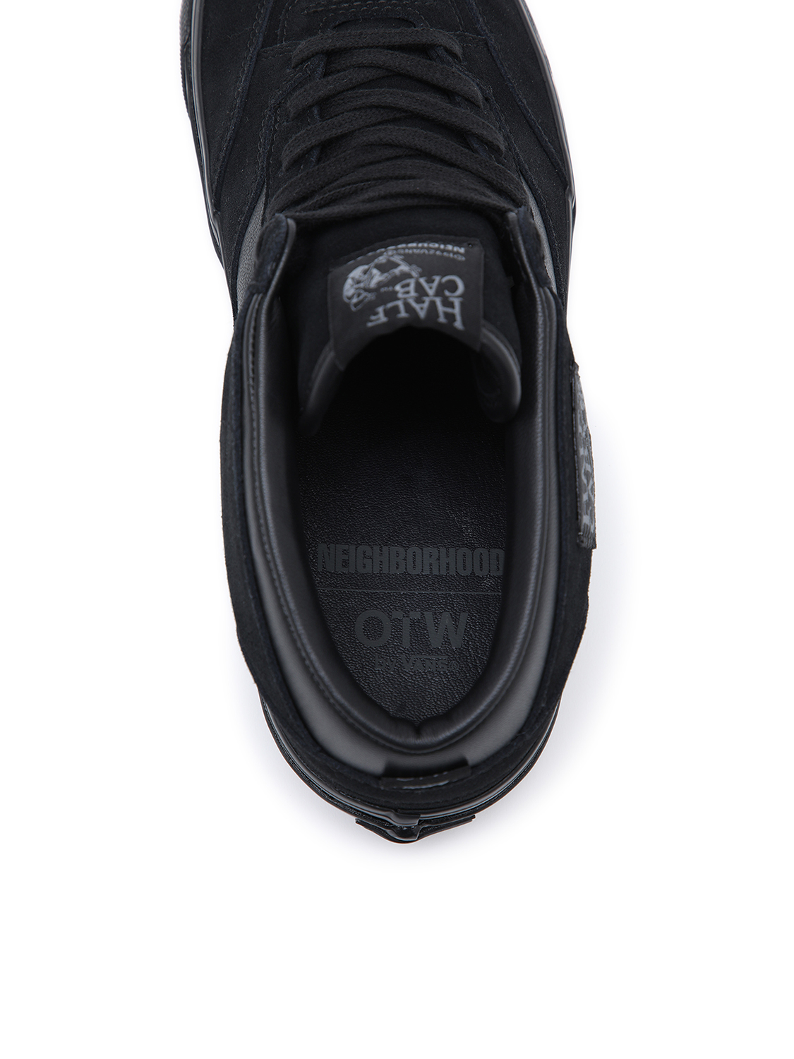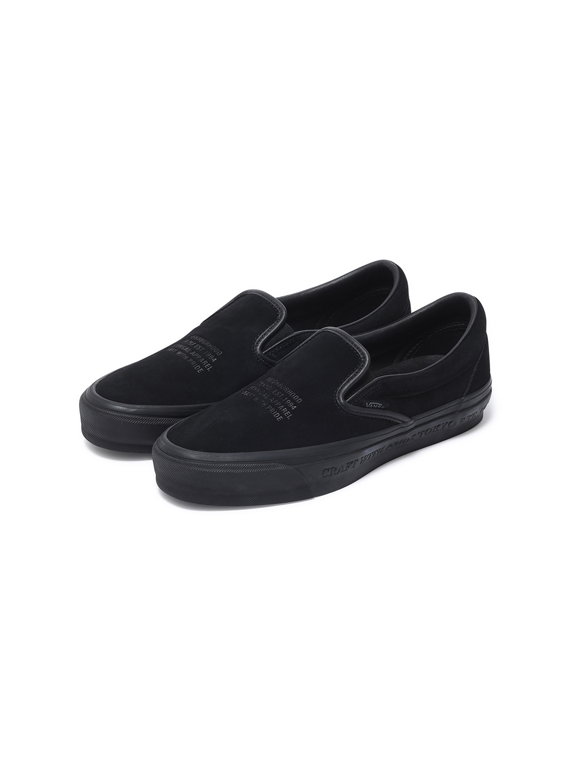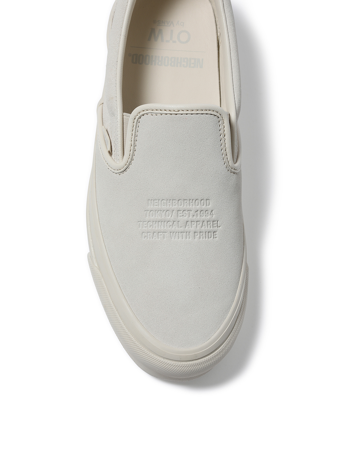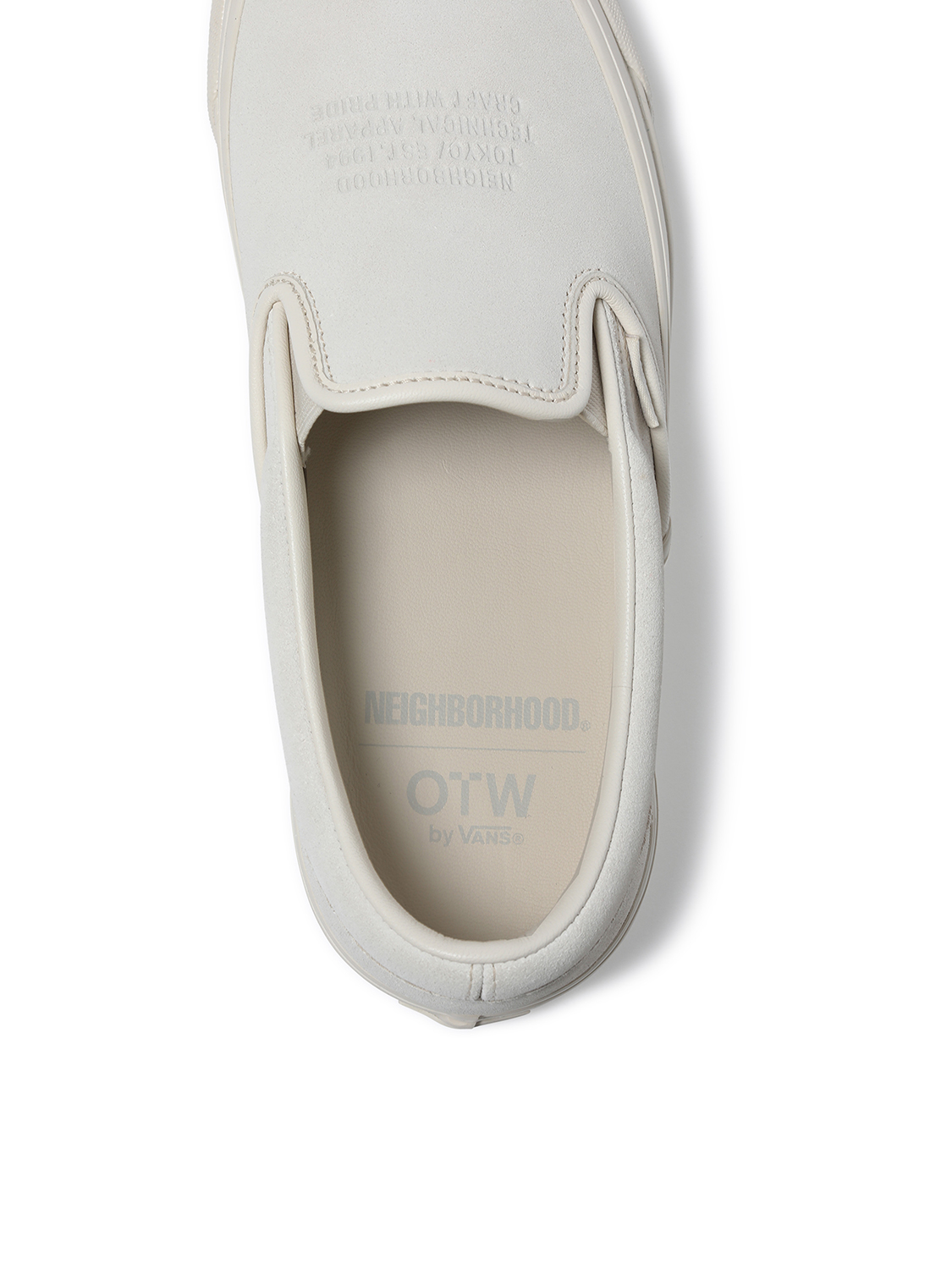 どちらも上質なスウェードとレザーで仕立て、サイドウォール、ヴァンプ、ヒール部分にNEIGHBORHOODの象徴的なロゴとスローガンをエンボスで刻印している。