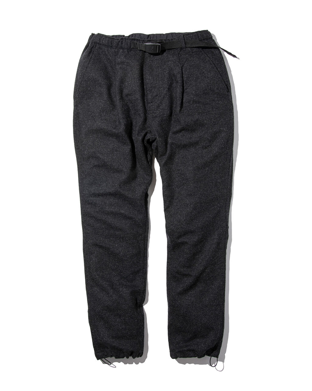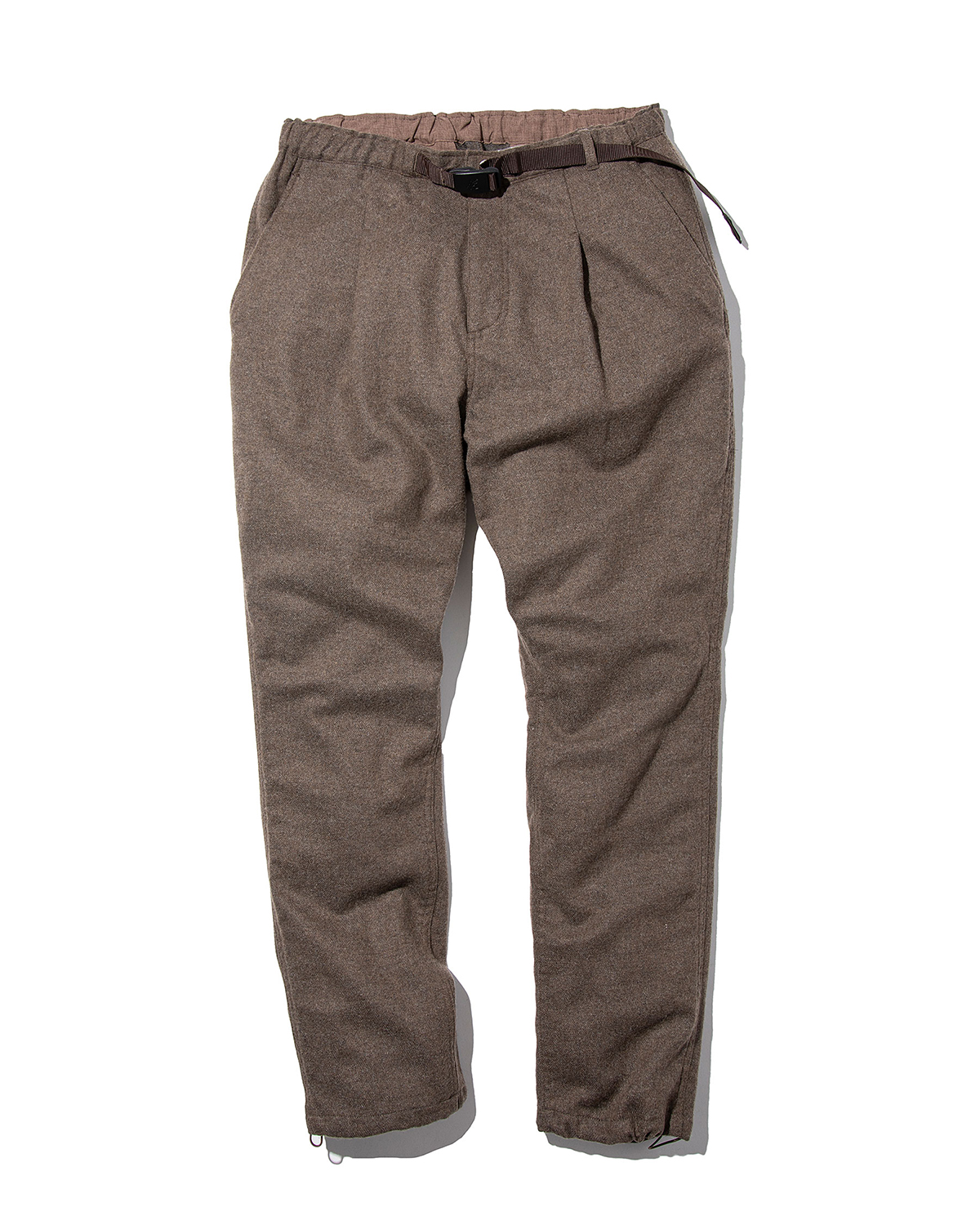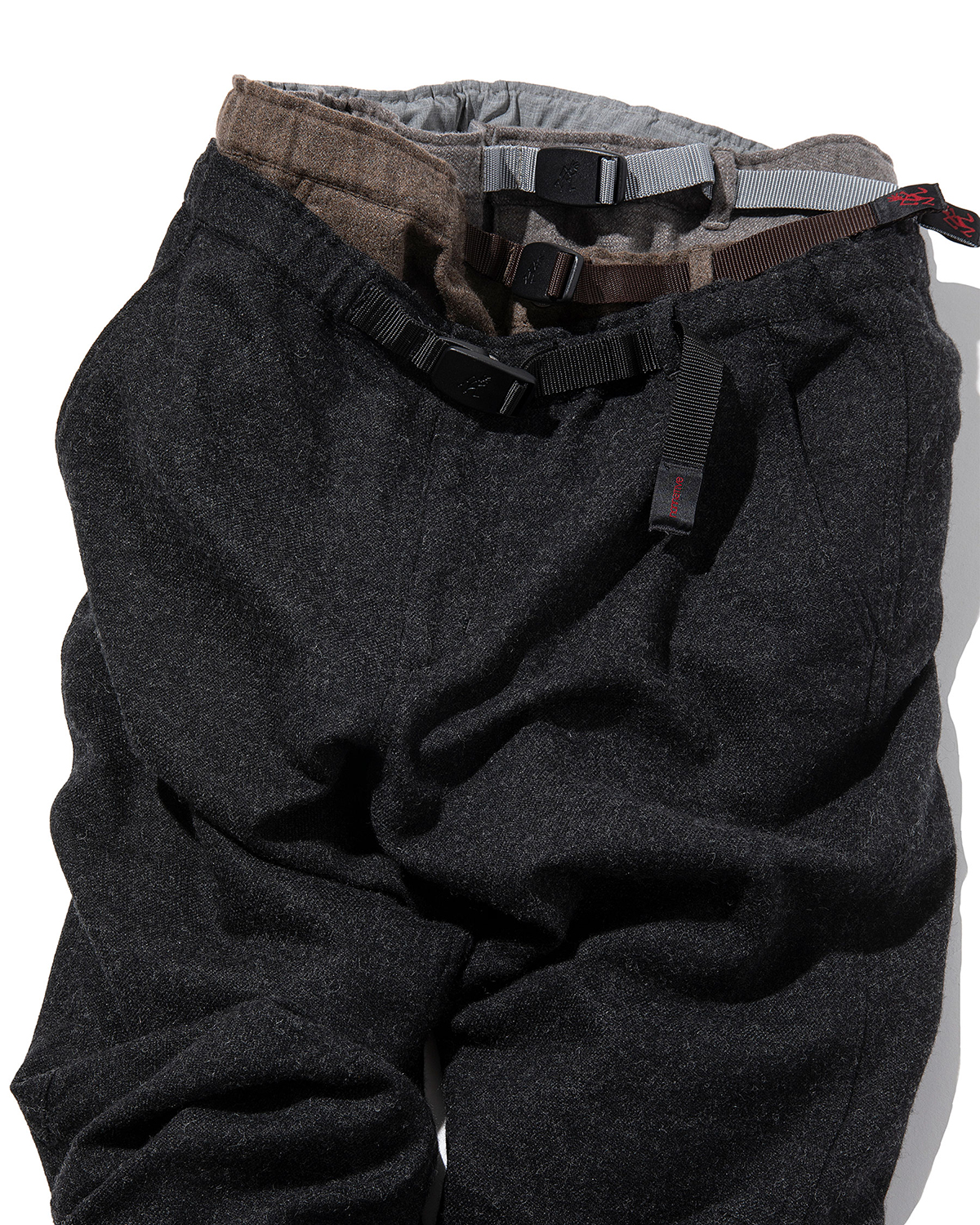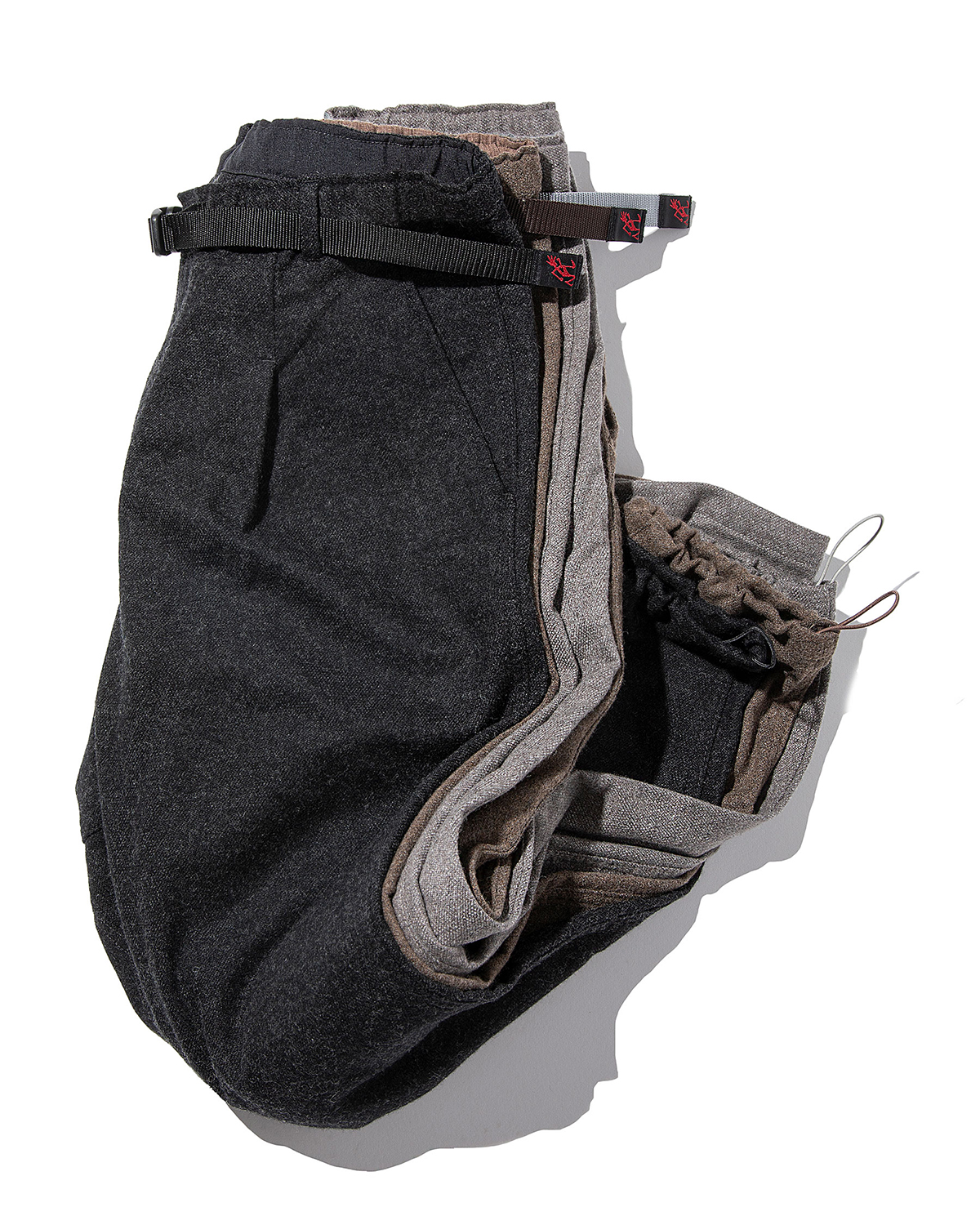 リサイクルウールを使用したサスティナブルな素材でもあり、ざっくり織られたツイードの豊かな表情や、カシミヤブレンドならではの滑らかで上質な肌触りが特長的な生地を、『WALKER TP EASY PANTS』、『CLIMBER EASY PANTS』という2つの定番シルエットに落とし込んだ。