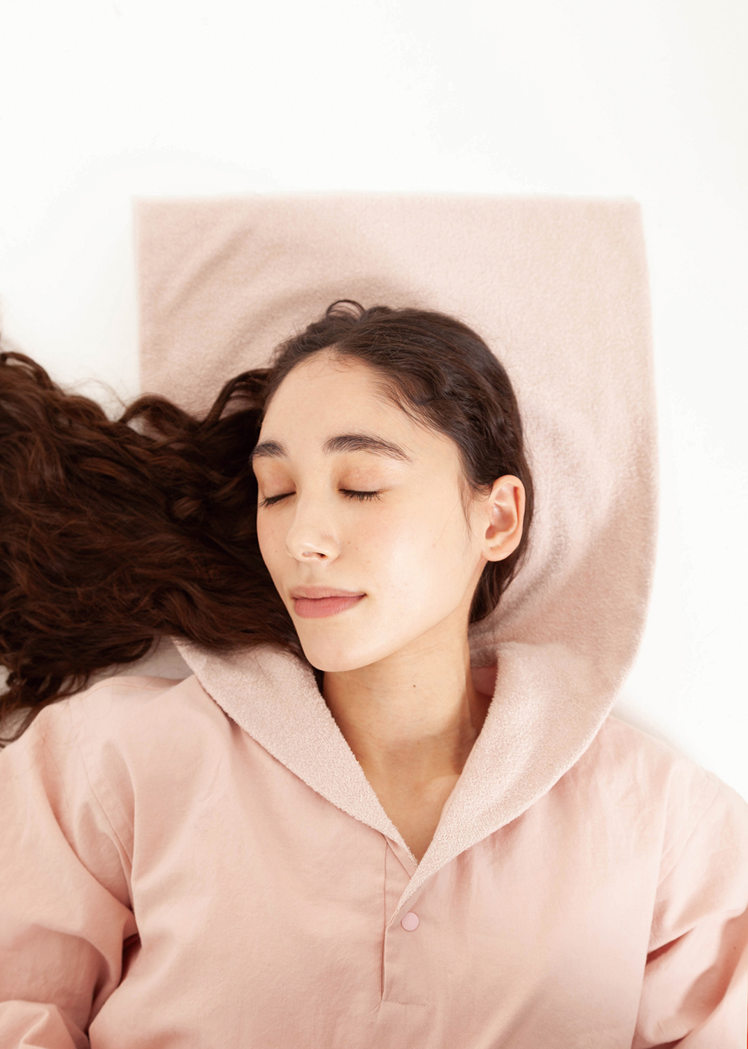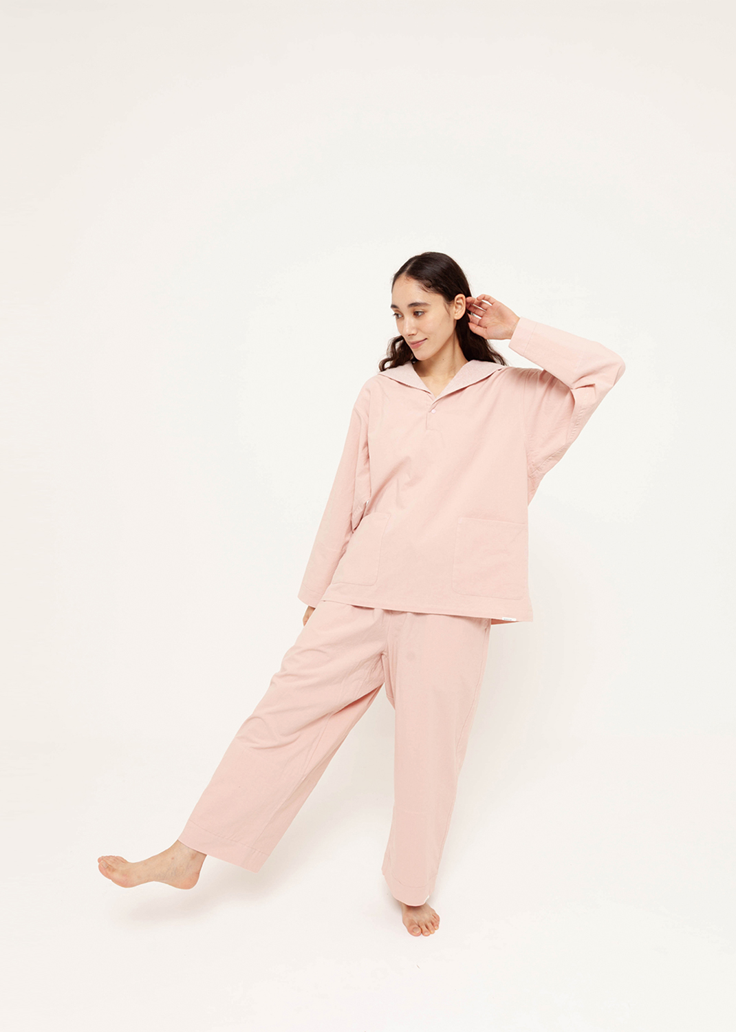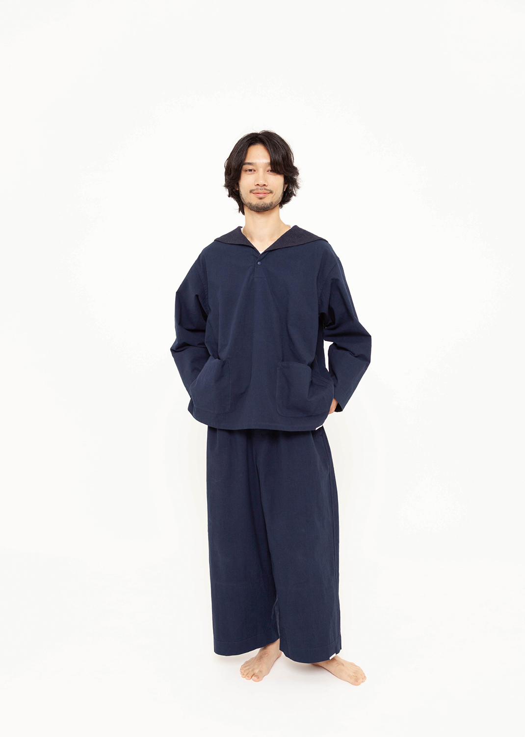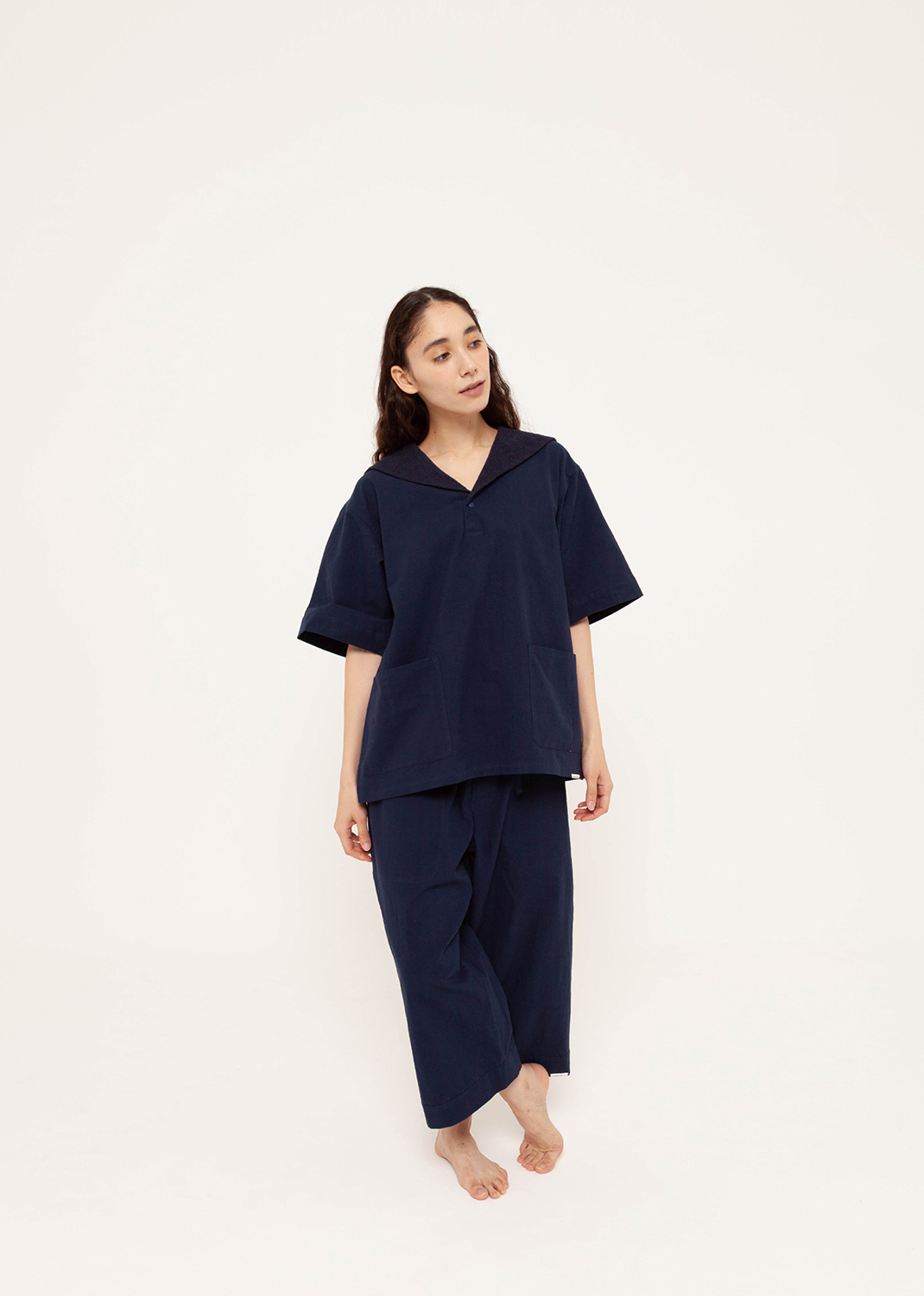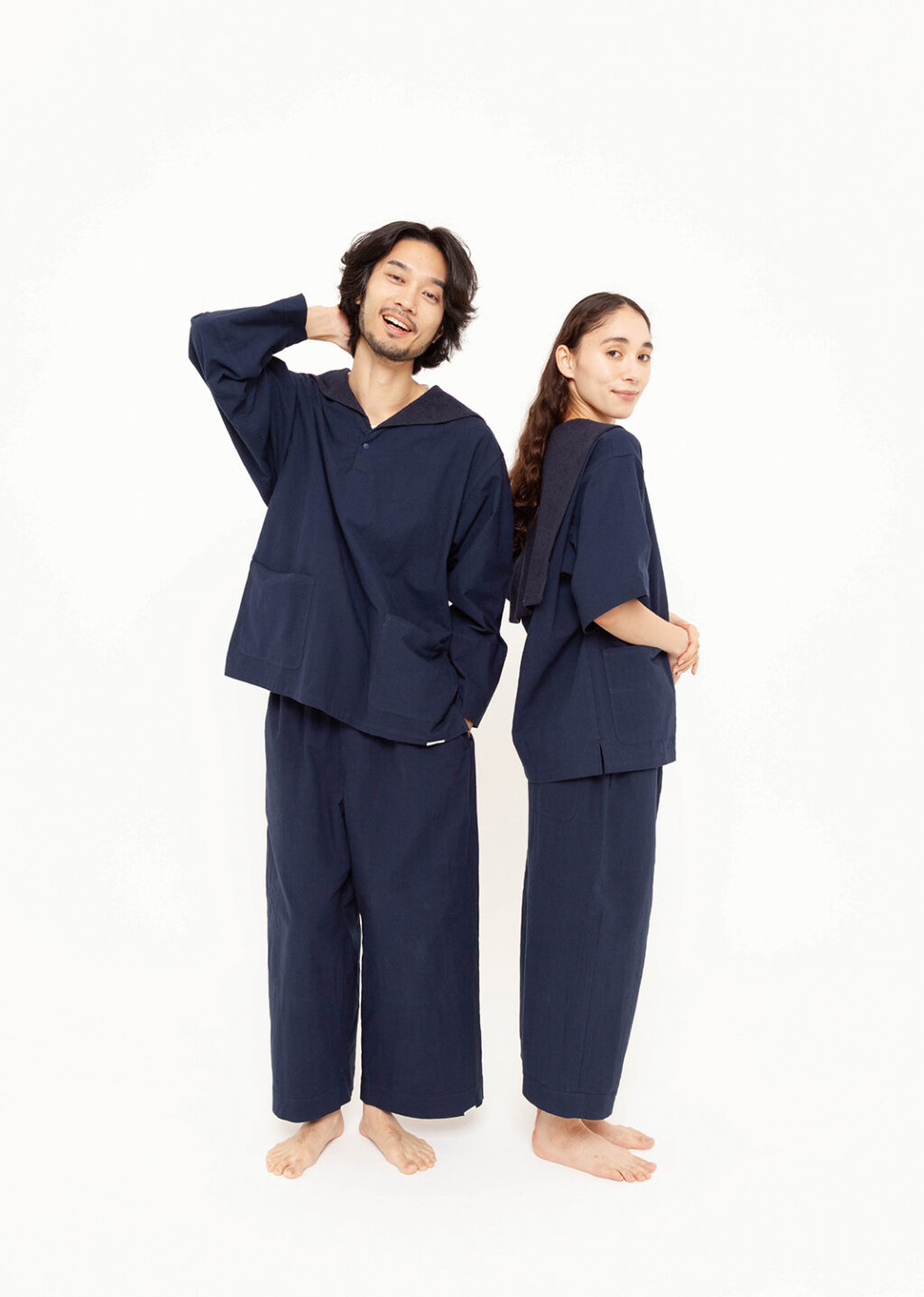 今季はセーラーカラーのパジャマ『wavy』が新登場。後ろに垂れる大きく四角い襟にタオル生地を使用し、お風呂上りの濡れた髪を受け止めてくれる設計になっている。