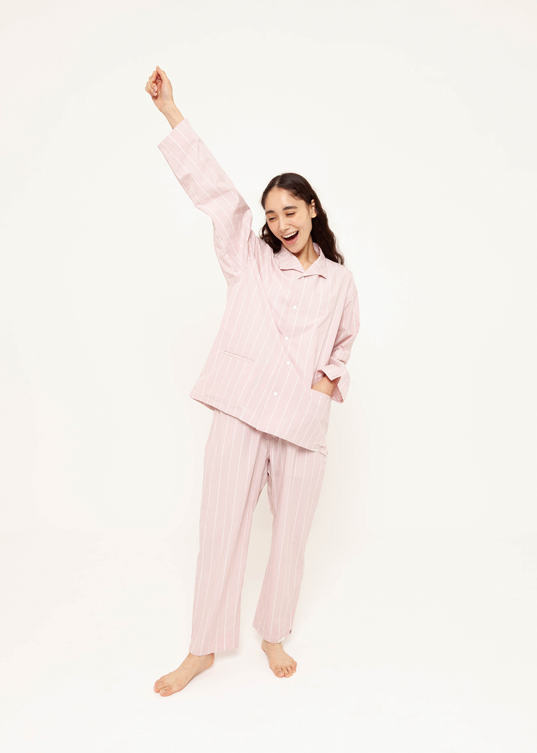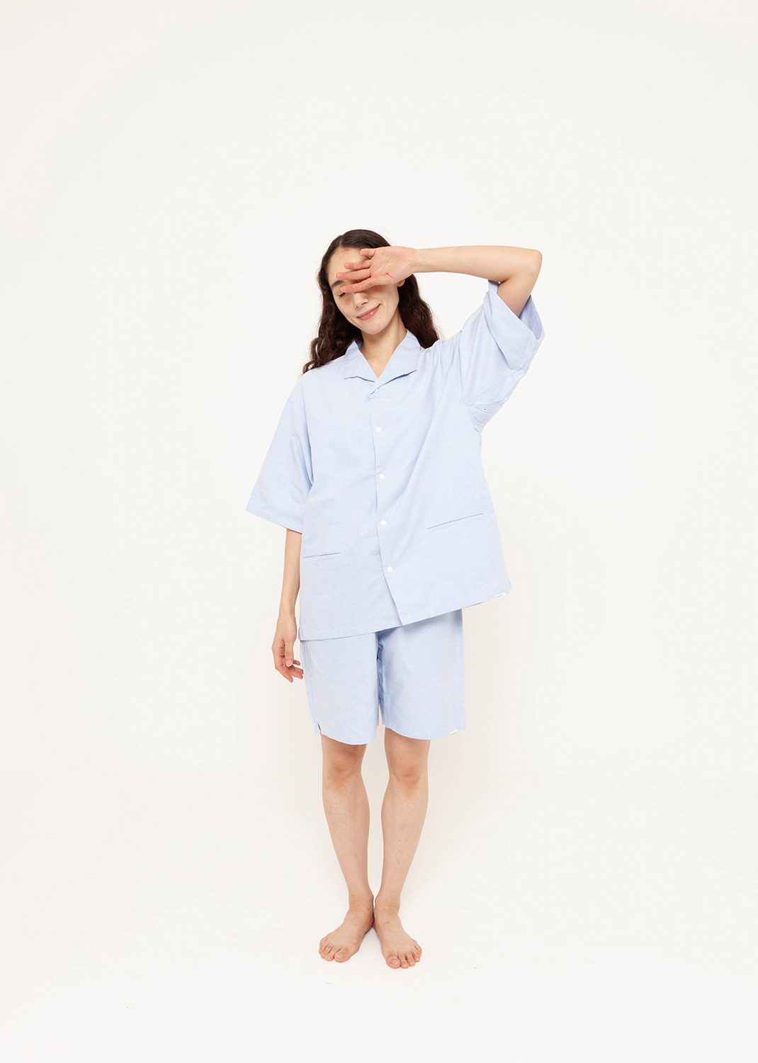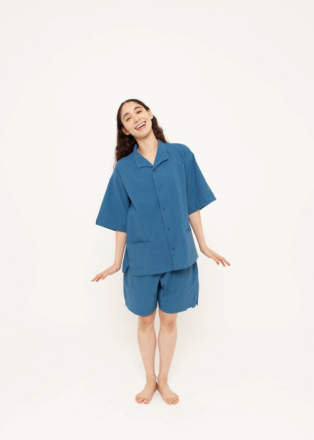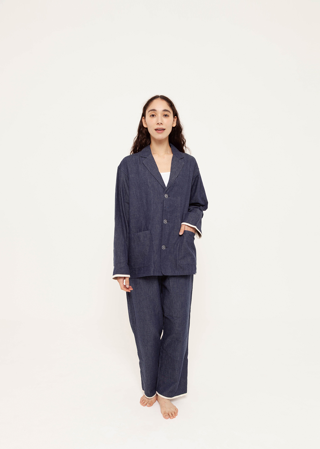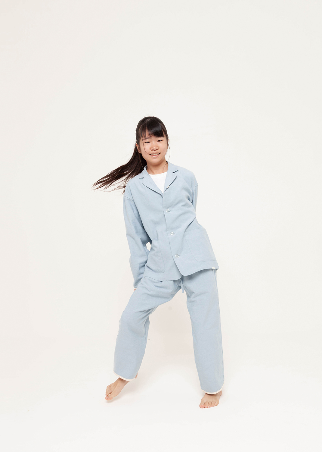 今季はセーラーカラーのパジャマ『wavy』が新登場。後ろに垂れる大きく四角い襟にタオル生地を使用し、お風呂上りの濡れた髪を受け止めてくれる設計になっている。