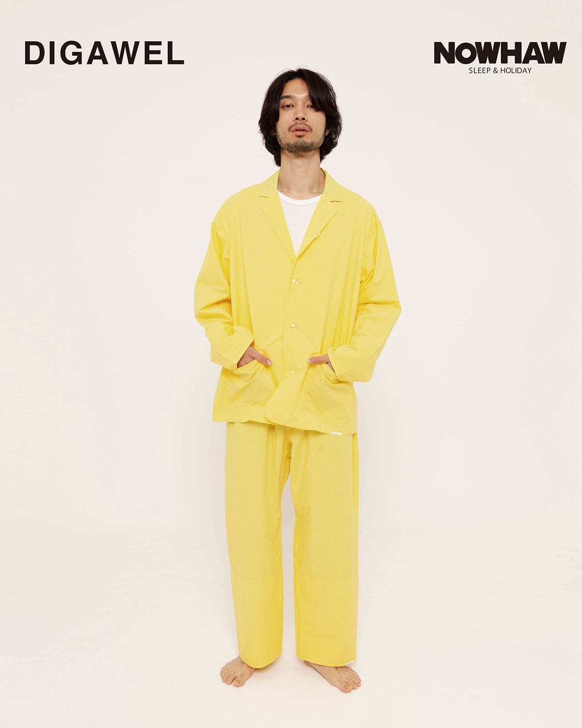 また、DIGAWEL(ディガウェル)とのコラボレーションアイテムも登場予定となっており、こちらは”幸福の黄色いパジャマ”と題した鮮やかなイエローのパジャマ、オープンカラーシャツやバギーショートパンツなどで構成。BEAMS CULTUART TAKANAWAの上階に位置するSAUNASとのトリプルネームのサウナハットも数量限定でリリースされる。