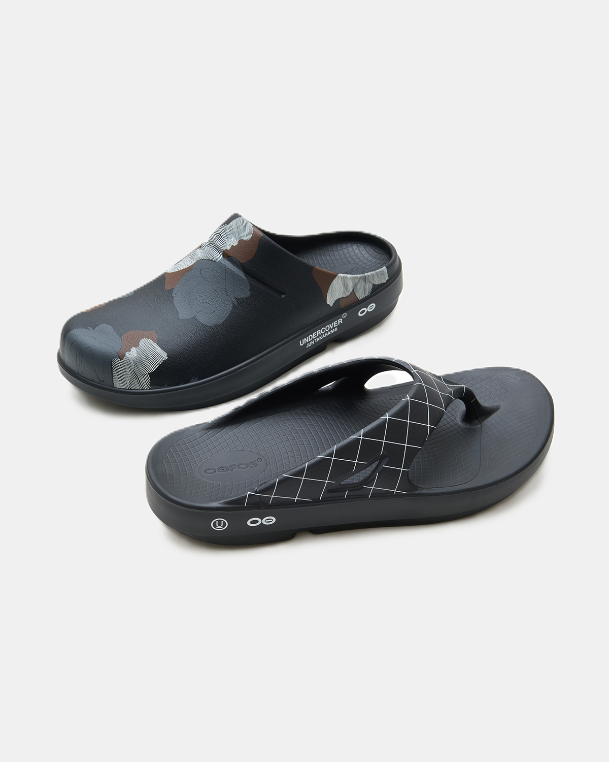 今回のコラボレーションでは、OOFOSのシグネチャーアイテムであるトングとクロッグをベースモデルに採用。
