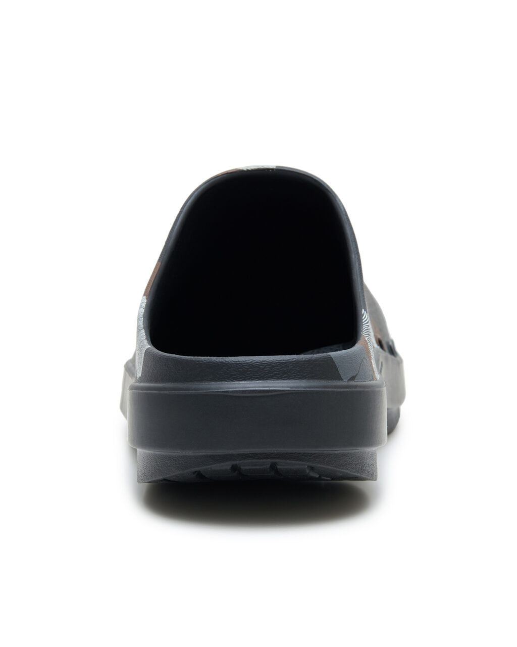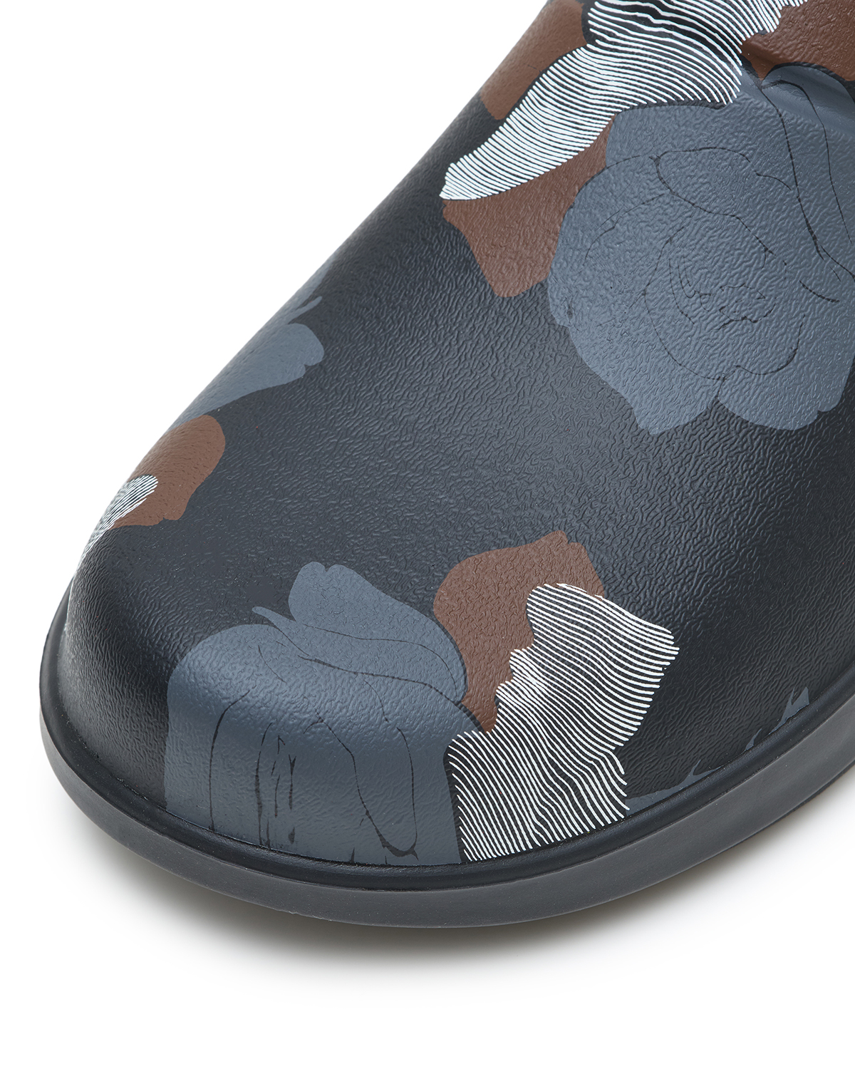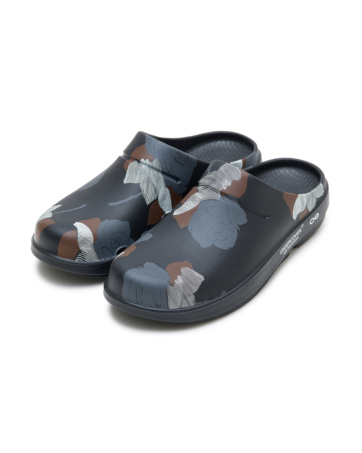 コレクションに登場するセットアップと同じ総柄をアッパーにあしらったクロッグは、コレクションピースとも自然に馴染むデザインに仕上げた。