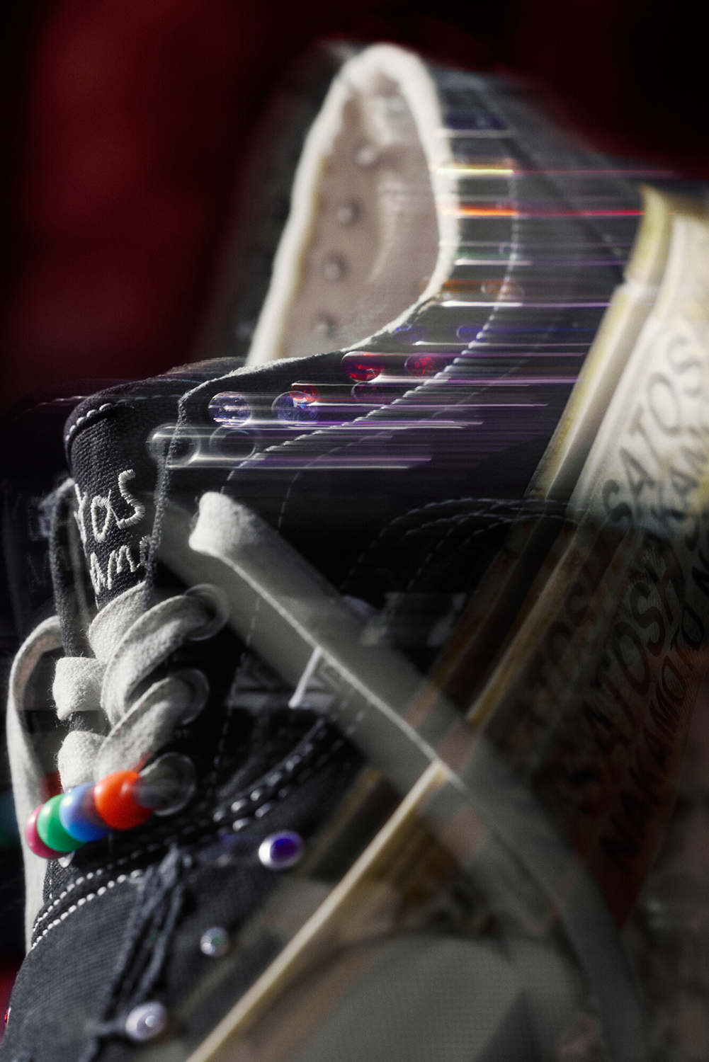 また、プリント加工を施したシューレースとサンドブラストによるビーズディテールがシューズ全体に独特のテクスチャーと立体感をプラス。足首まわりには丸いマルチカラーのジェムストーンを配し、解体的なシルエットの中に精緻なアクセントを加えている。