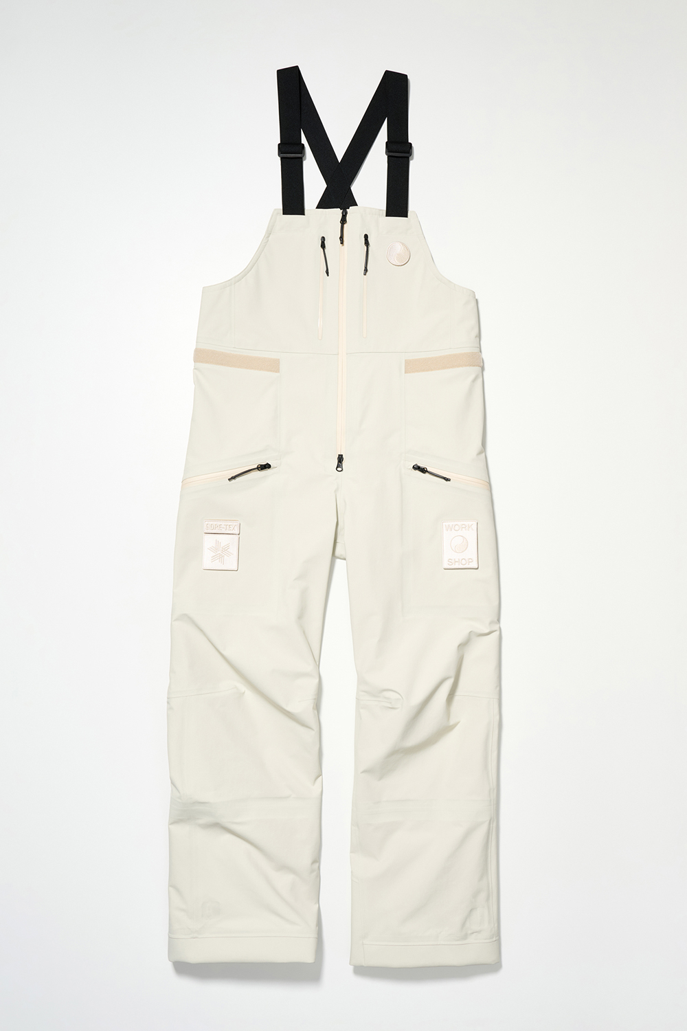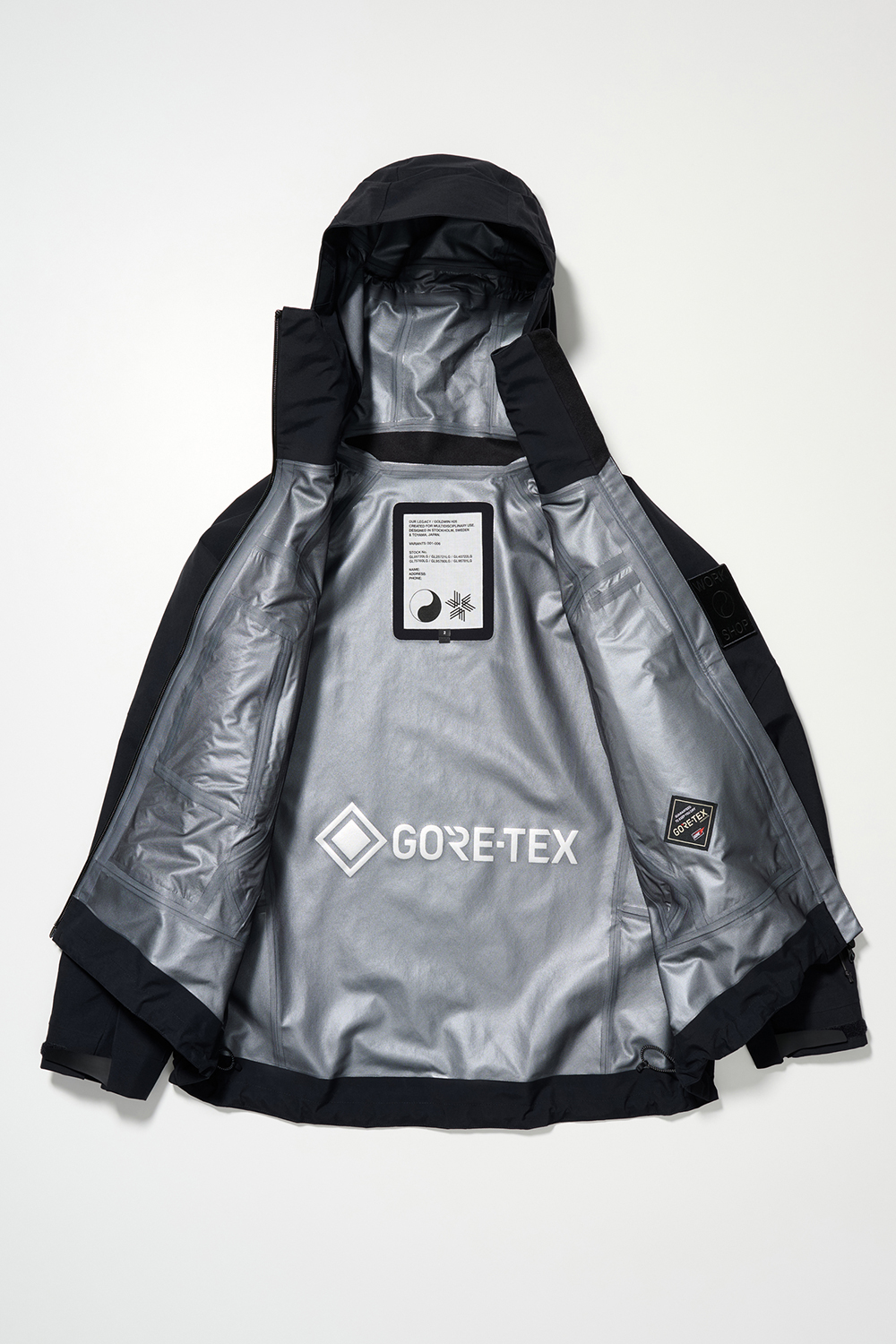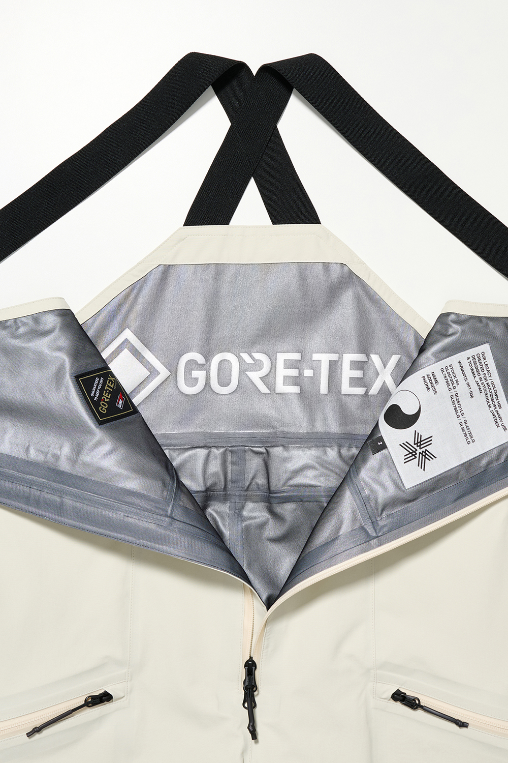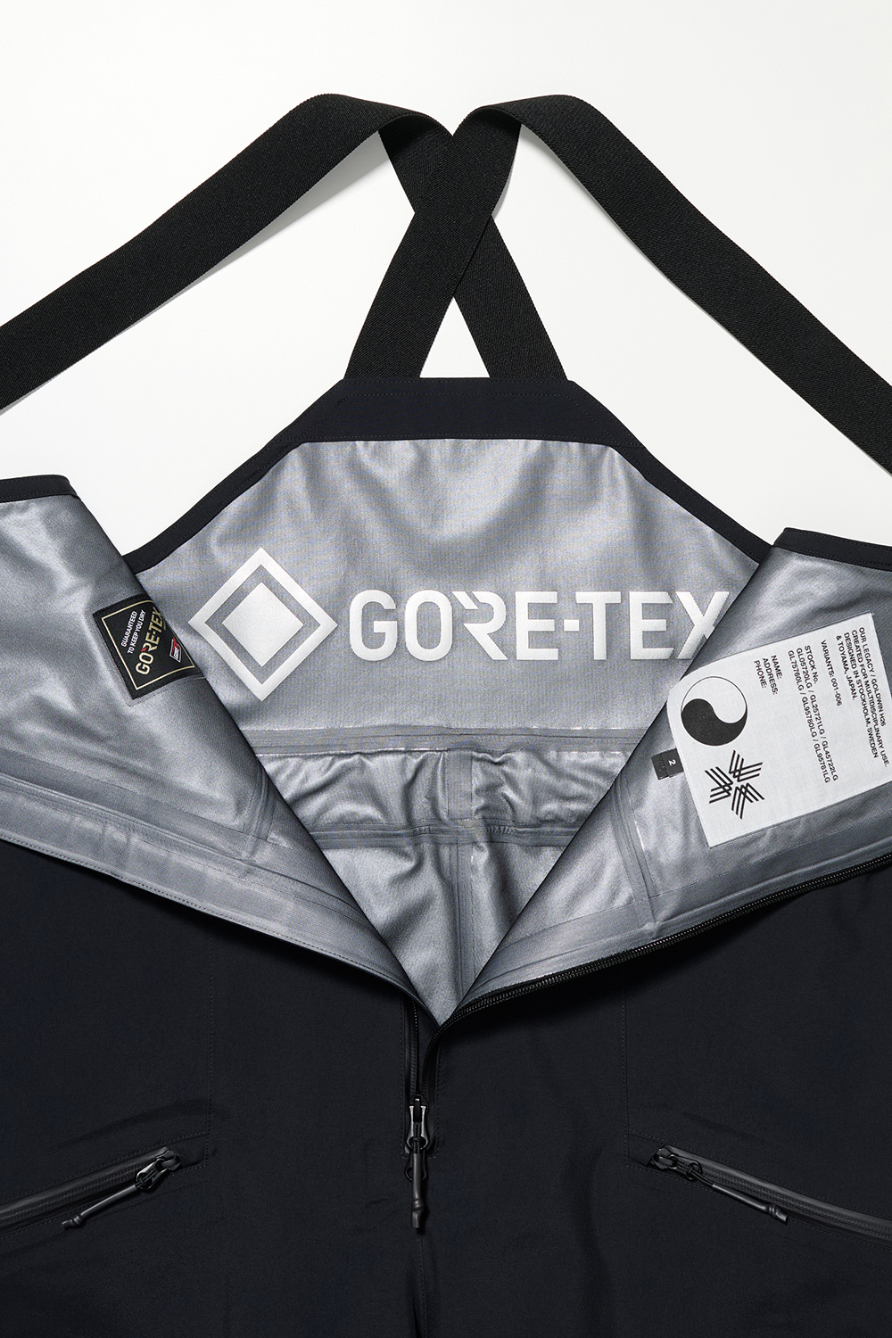 コレクションはGORE-TEX®の3レイヤー素材を用いたシェルジャケットとビブパンツ、PERTEX®を用いたインサレーション・ベスト、SOLOTEX®素材のワッフルトップ、POLARTEC®フリース素材のトラッパーハットで構成され、それらすべてを収納できるCORDURA®素材の大容量トラベルバッグもラインナップ。ブラックとボーンホワイトの2色で展開される各アイテムは、外側にミルスペックに着想を得た取り外し可能なパッチが配され、内側にはGORE-TEX®をメインサプライヤーとする各ファブリック・パートナーシップを象徴するリフレクティブ・プリントを施している。