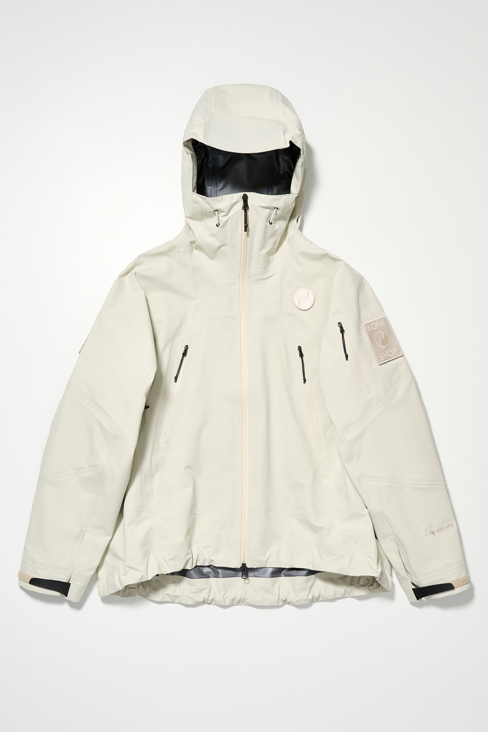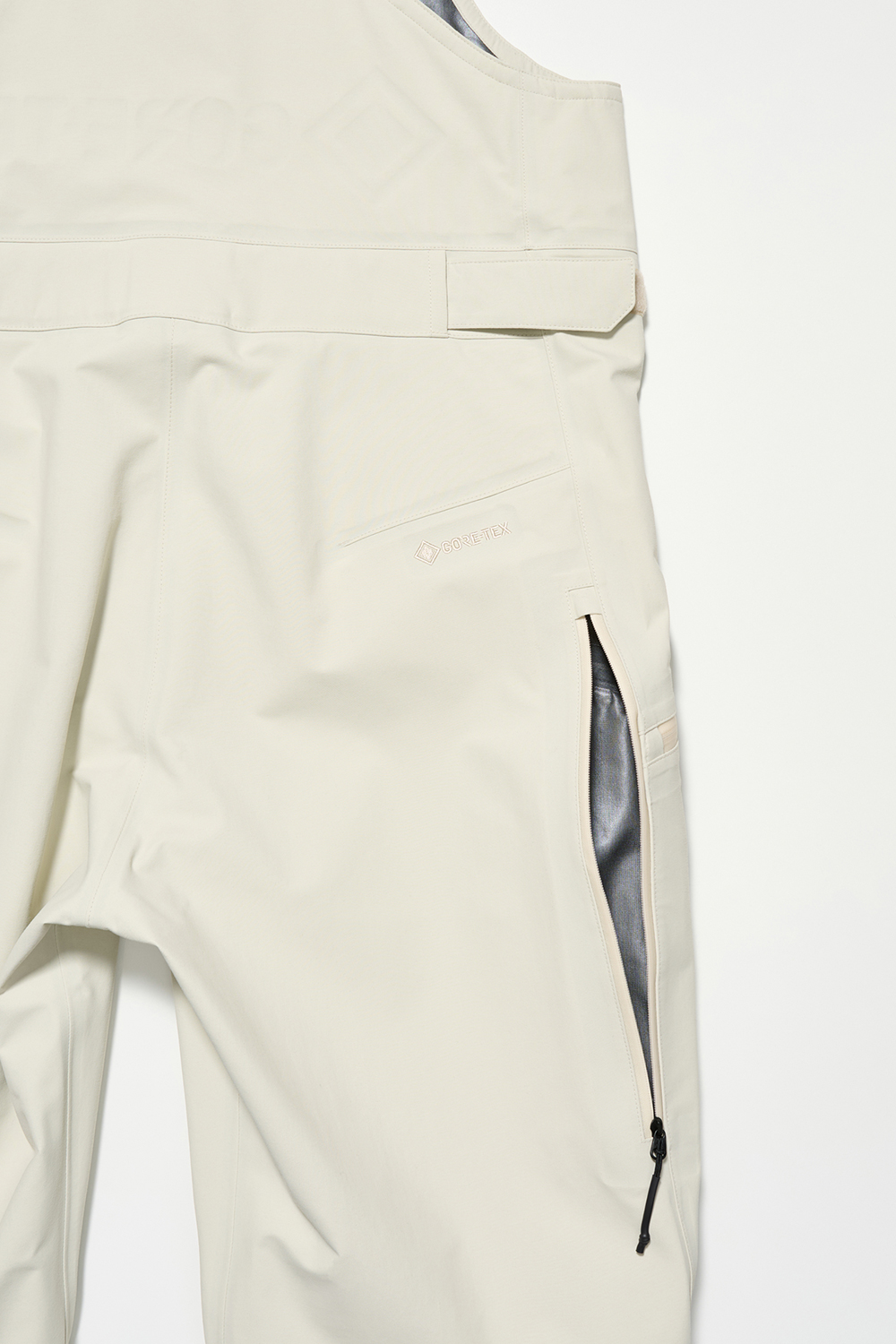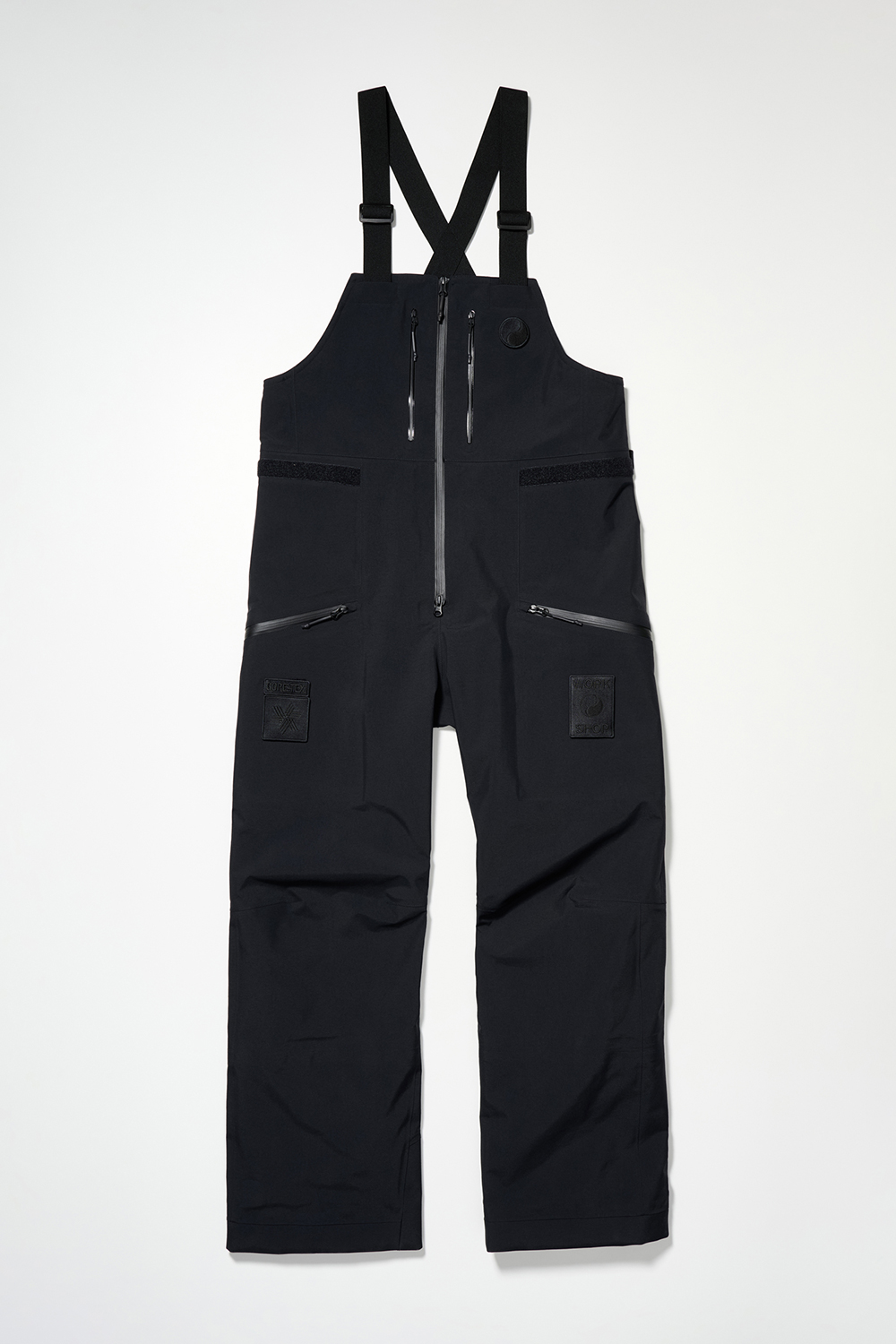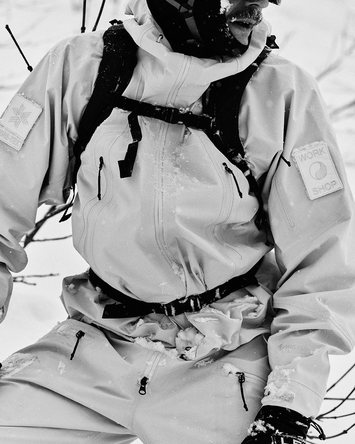 コレクションはGORE-TEX®の3レイヤー素材を用いたシェルジャケットとビブパンツ、PERTEX®を用いたインサレーション・ベスト、SOLOTEX®素材のワッフルトップ、POLARTEC®フリース素材のトラッパーハットで構成され、それらすべてを収納できるCORDURA®素材の大容量トラベルバッグもラインナップ。ブラックとボーンホワイトの2色で展開される各アイテムは、外側にミルスペックに着想を得た取り外し可能なパッチが配され、内側にはGORE-TEX®をメインサプライヤーとする各ファブリック・パートナーシップを象徴するリフレクティブ・プリントを施している。