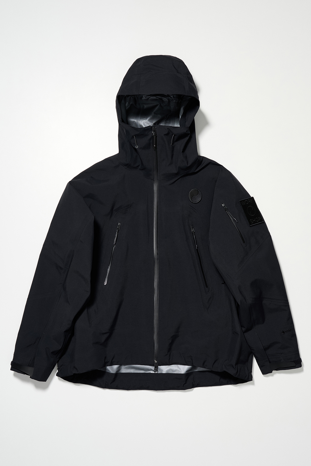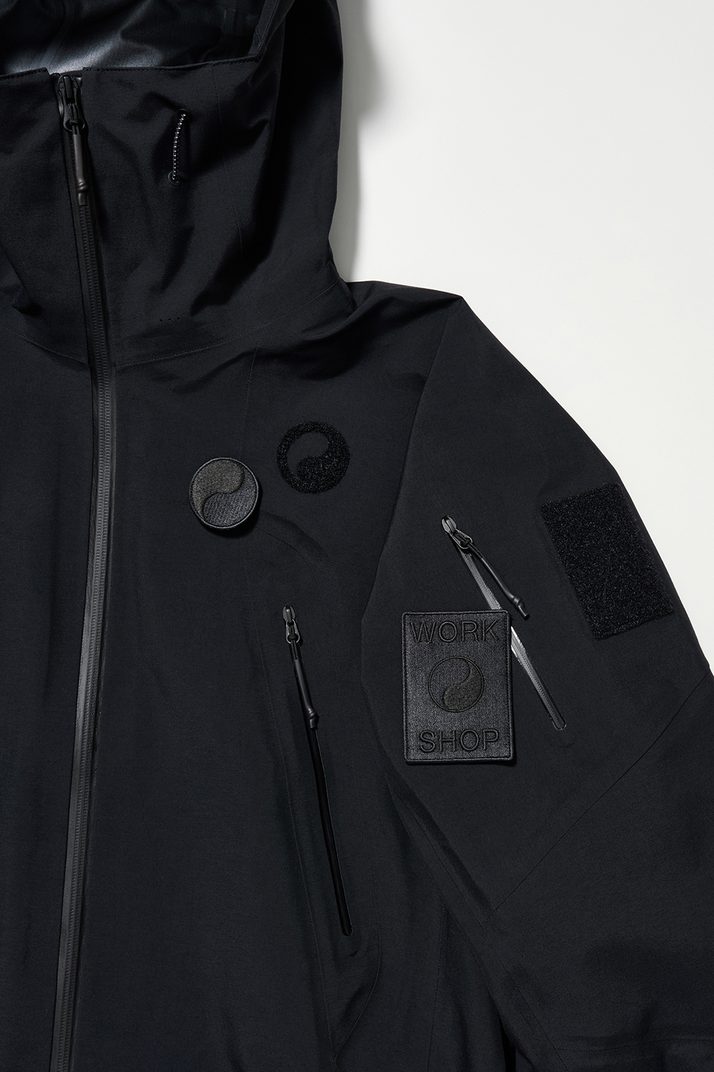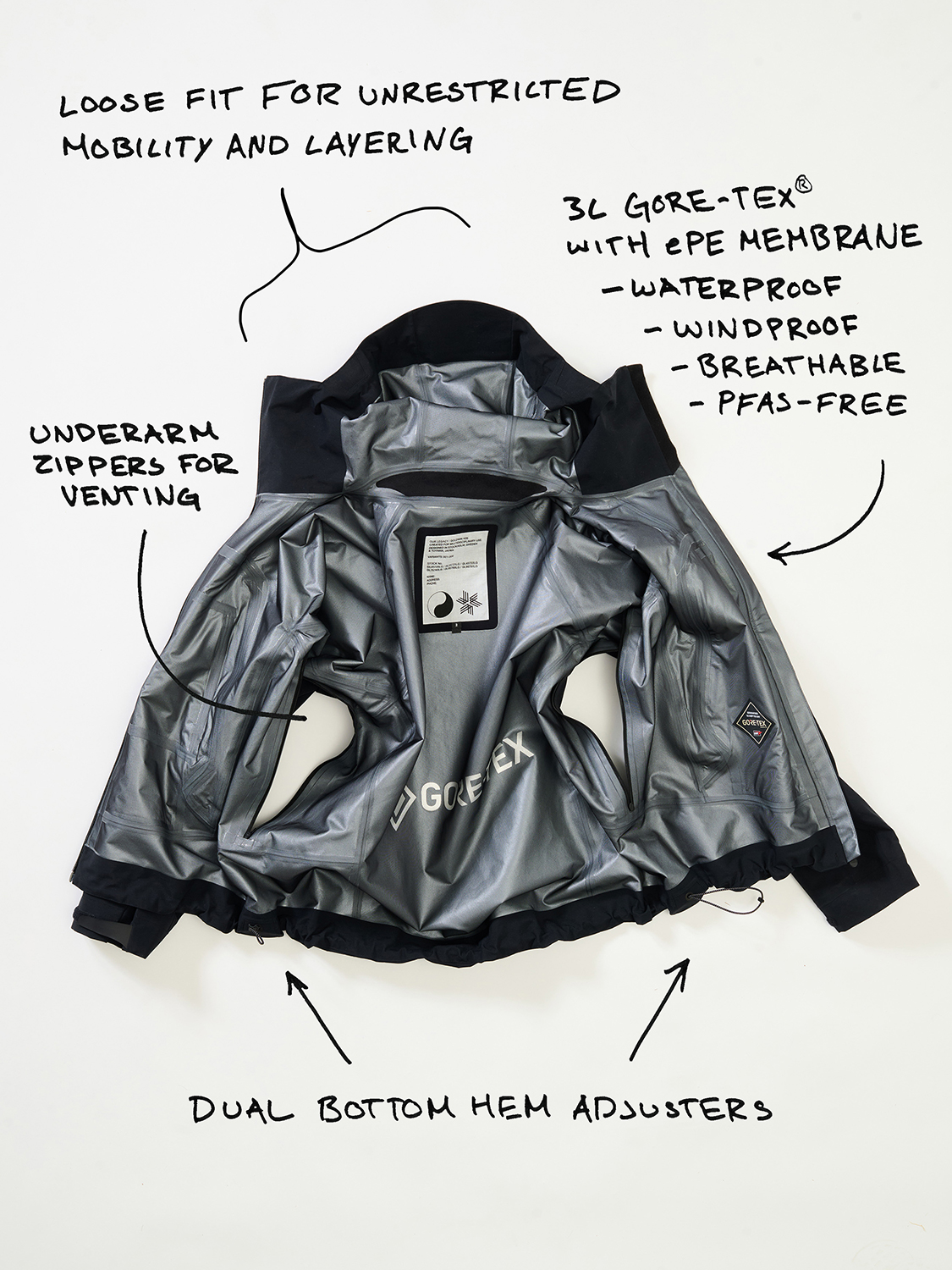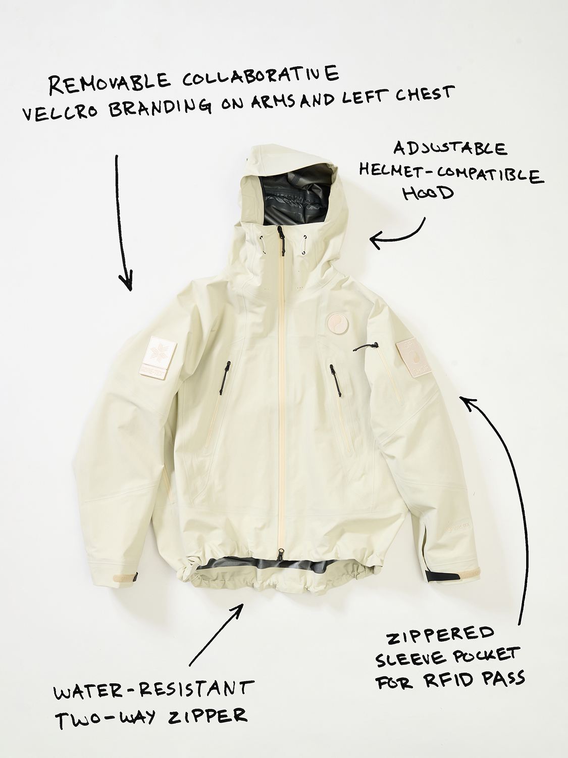 コレクションはGORE-TEX®の3レイヤー素材を用いたシェルジャケットとビブパンツ、PERTEX®を用いたインサレーション・ベスト、SOLOTEX®素材のワッフルトップ、POLARTEC®フリース素材のトラッパーハットで構成され、それらすべてを収納できるCORDURA®素材の大容量トラベルバッグもラインナップ。ブラックとボーンホワイトの2色で展開される各アイテムは、外側にミルスペックに着想を得た取り外し可能なパッチが配され、内側にはGORE-TEX®をメインサプライヤーとする各ファブリック・パートナーシップを象徴するリフレクティブ・プリントを施している。