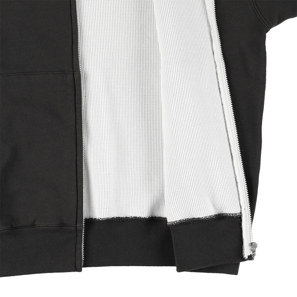 程よい厚みのスウェット生地とサーマル生地を合わせたダブルフェイス仕様で、柔らかく快適な着心地が大きな特徴となっている。