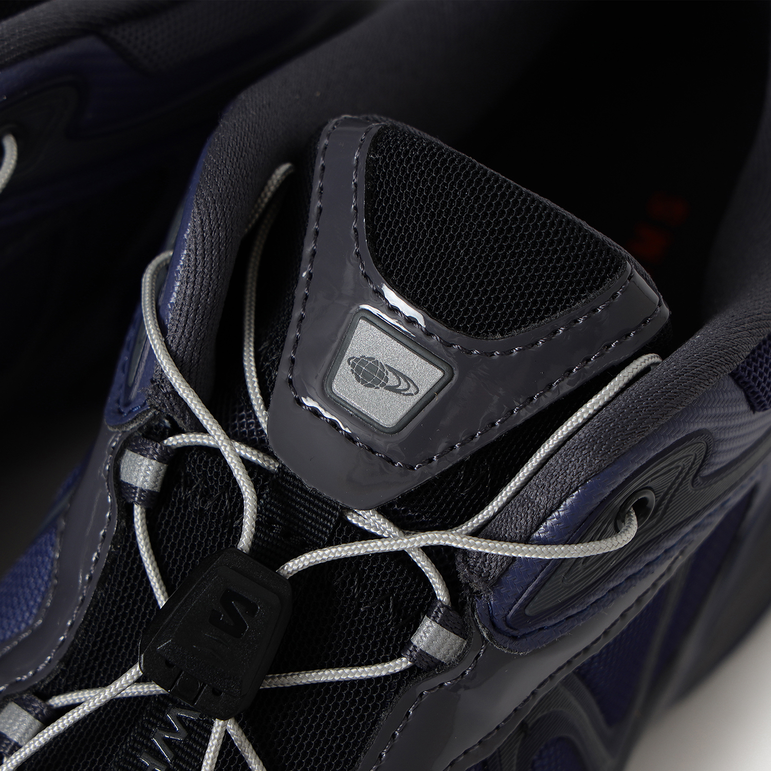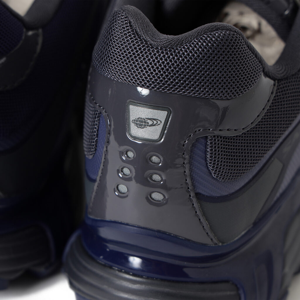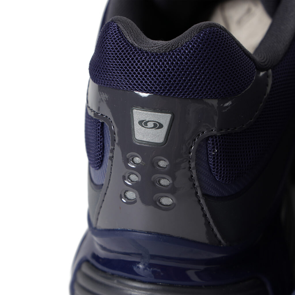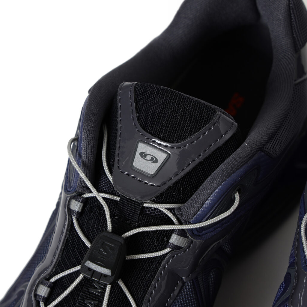 光沢感のある素材使いや左右非対称の配色により、無機質でテクニカルな雰囲気をまとった1足を作り上げた。