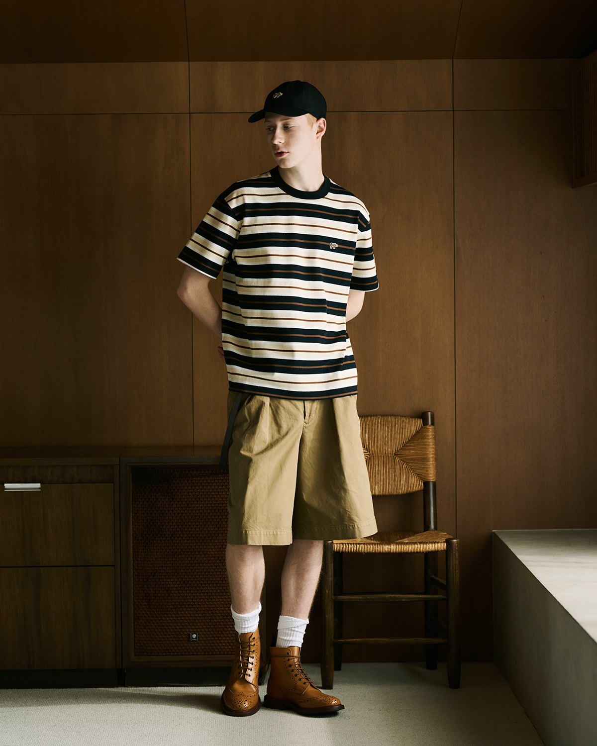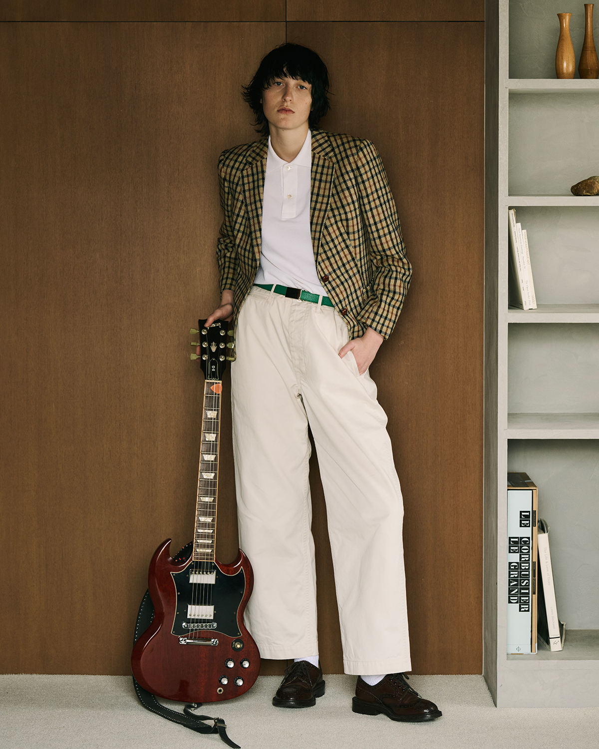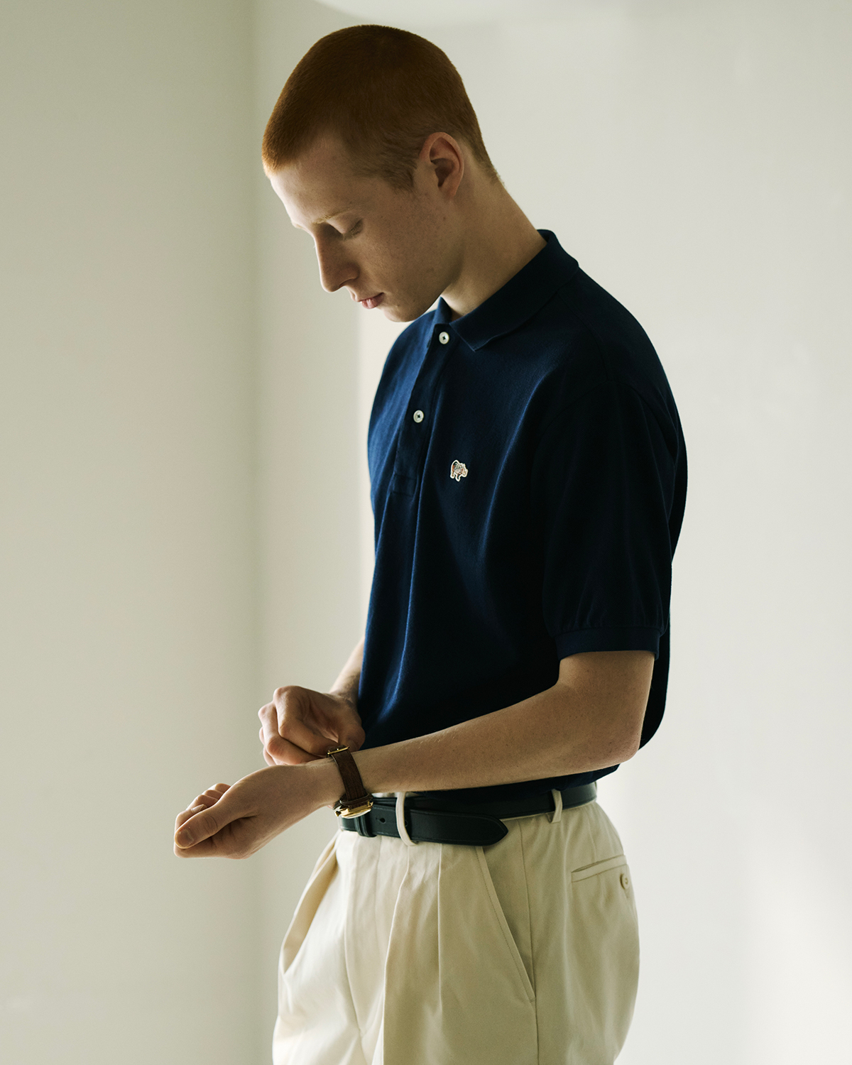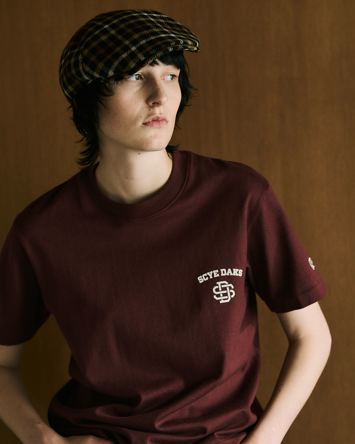 90年以上にわたりDAKSのアイコンとして親しまれてきた世界初のベルトレス・スラックス『DAKS TOP』をScyeのオリジナルパターンで再構築したアイテムのほか、ジップアップフード付きコート、クラシックなモデルをベースに現代的な機能性を加えたデニムジャケットとバギージーンズのセットアップ、左胸にDAKSカラーでサイの刺繍ワッペンをあしらった鹿の子編みのTシャツなど、全てScyeのオリジナルパターンを使用したユニセックスアイテム13型が登場する。