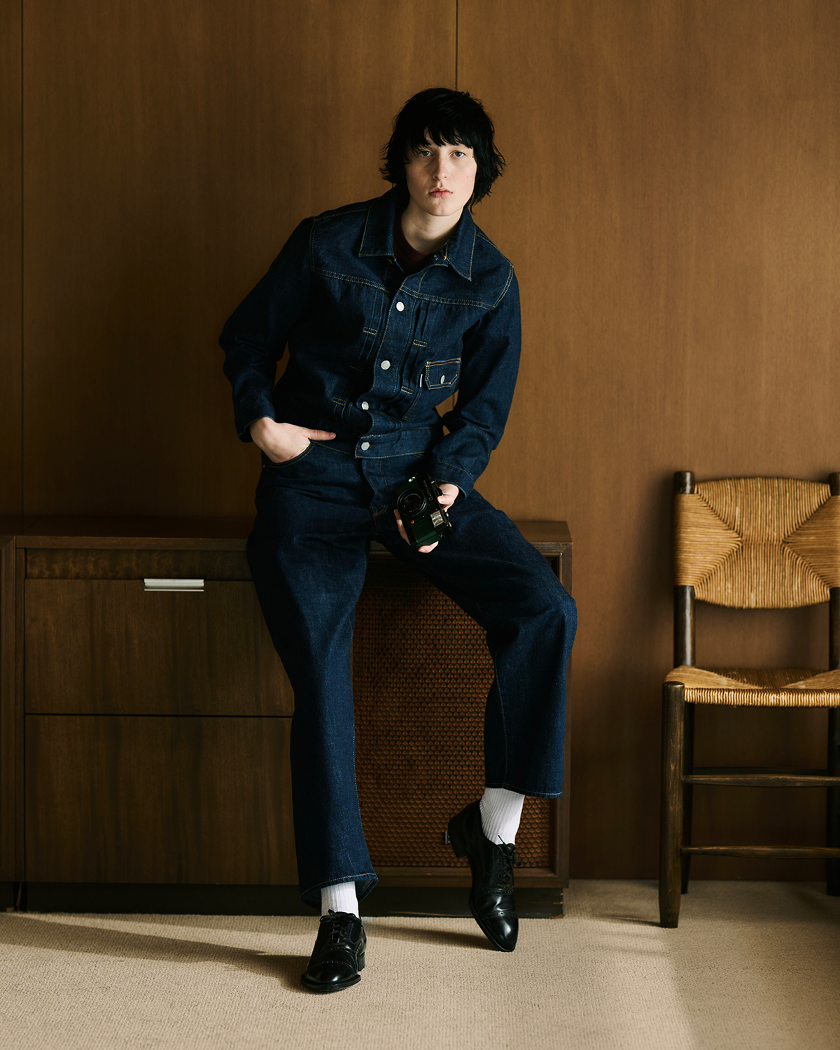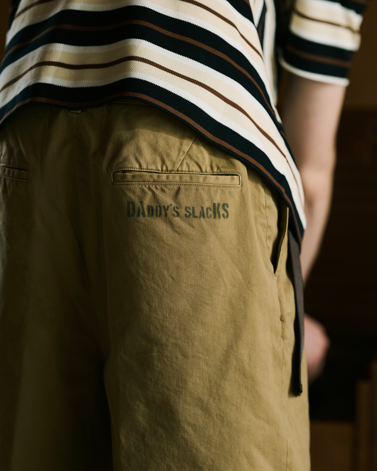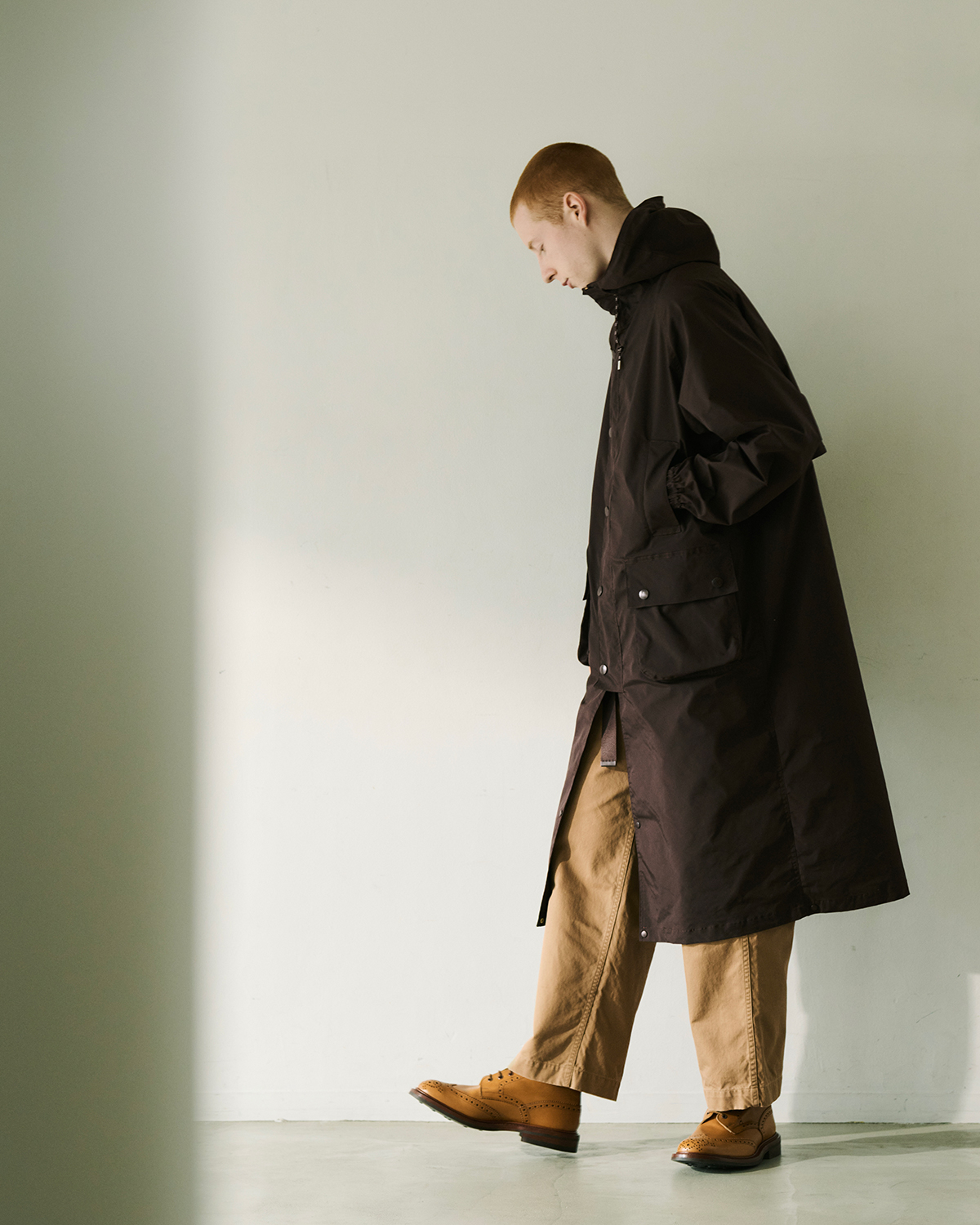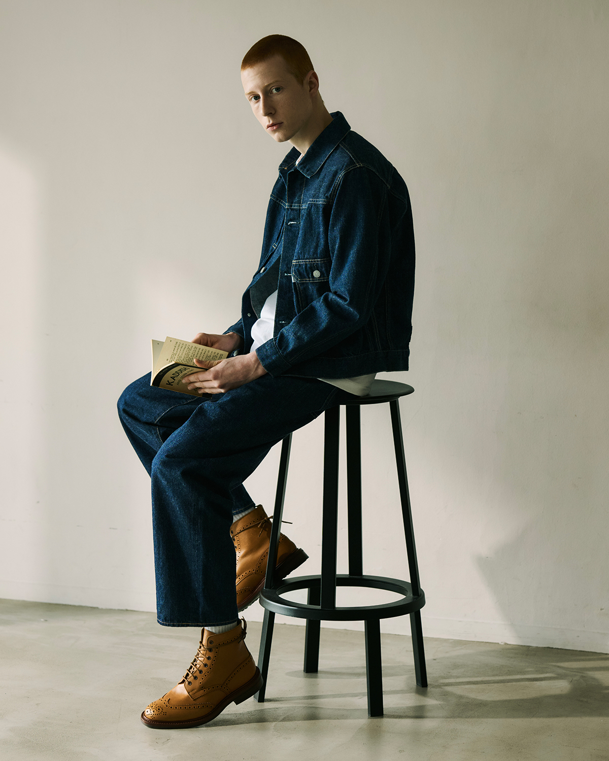 90年以上にわたりDAKSのアイコンとして親しまれてきた世界初のベルトレス・スラックス『DAKS TOP』をScyeのオリジナルパターンで再構築したアイテムのほか、ジップアップフード付きコート、クラシックなモデルをベースに現代的な機能性を加えたデニムジャケットとバギージーンズのセットアップ、左胸にDAKSカラーでサイの刺繍ワッペンをあしらった鹿の子編みのTシャツなど、全てScyeのオリジナルパターンを使用したユニセックスアイテム13型が登場する。