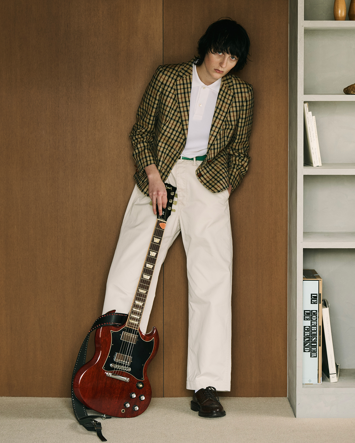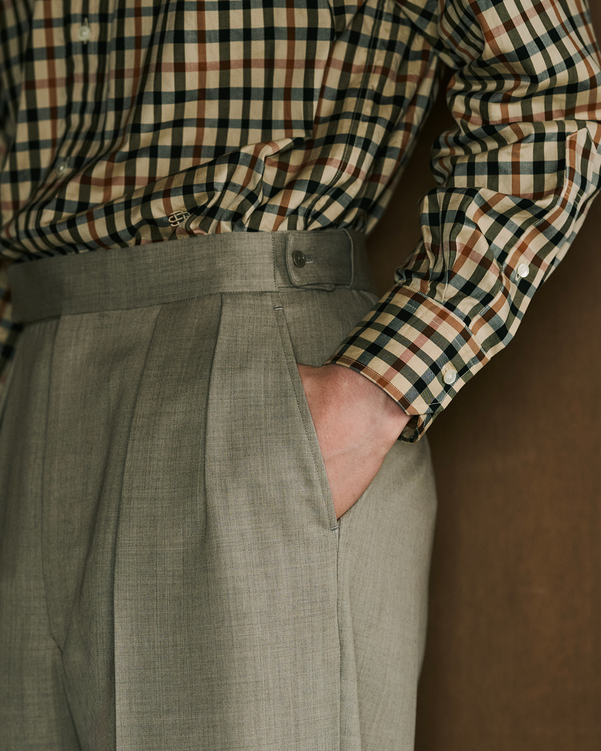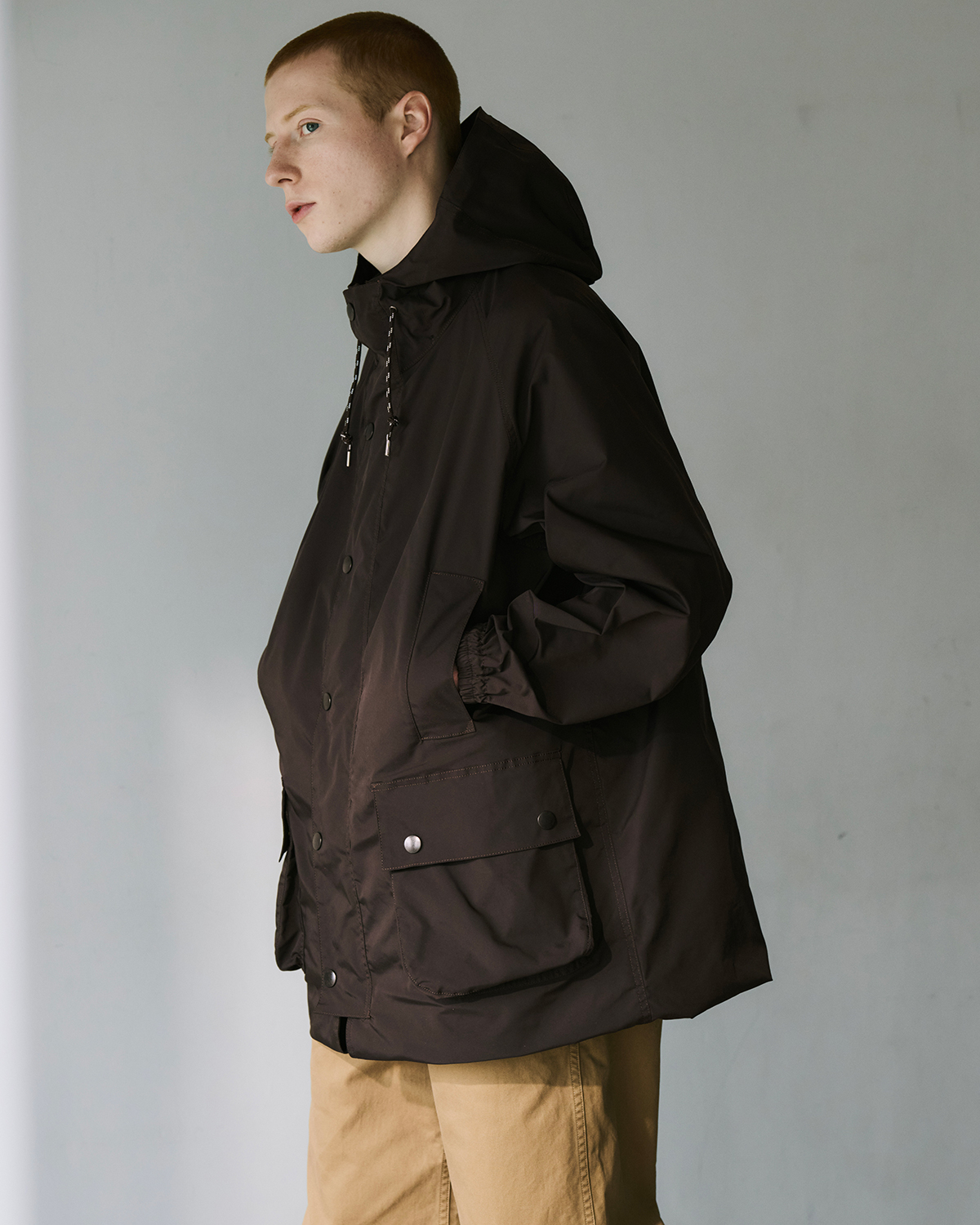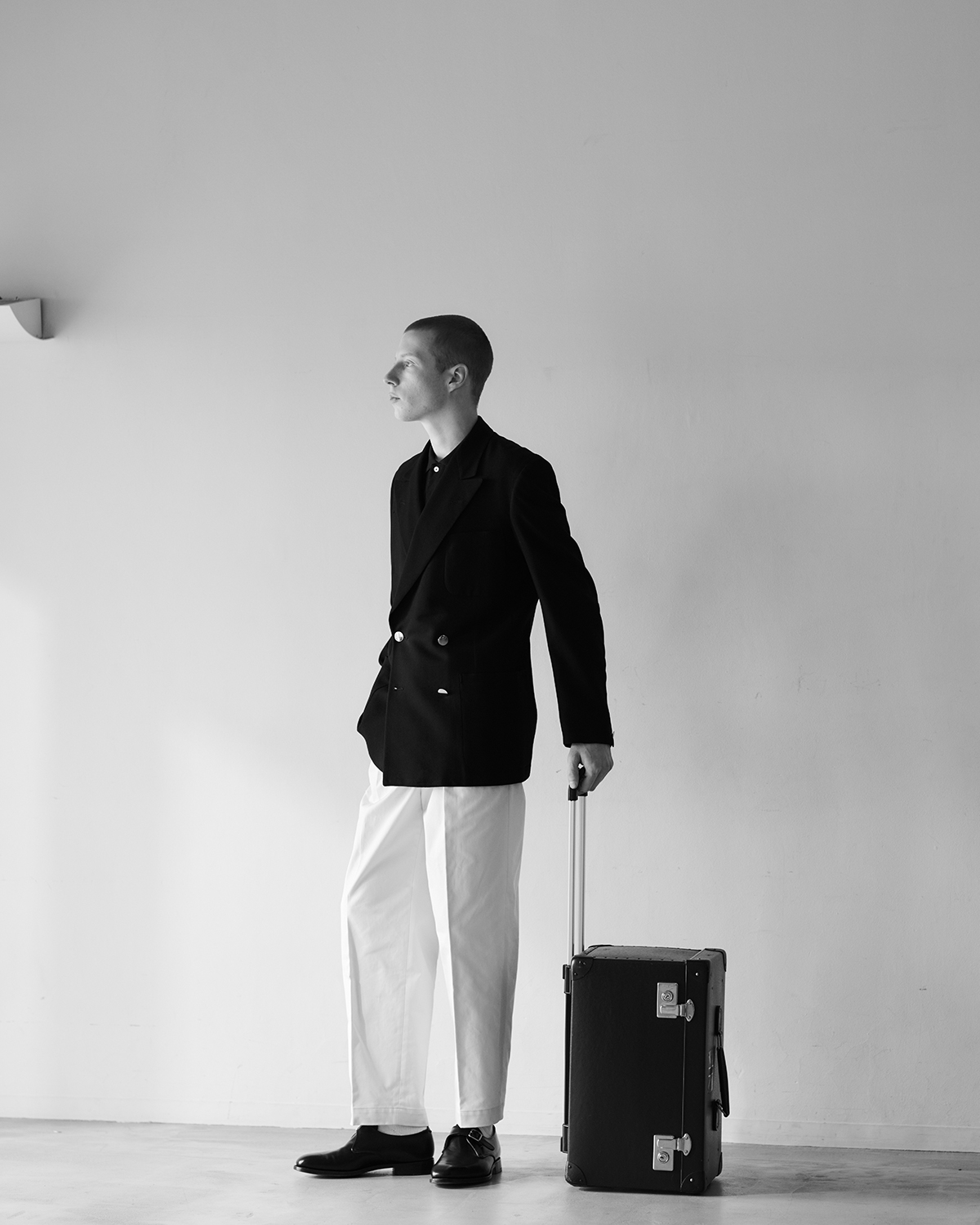 90年以上にわたりDAKSのアイコンとして親しまれてきた世界初のベルトレス・スラックス『DAKS TOP』をScyeのオリジナルパターンで再構築したアイテムのほか、ジップアップフード付きコート、クラシックなモデルをベースに現代的な機能性を加えたデニムジャケットとバギージーンズのセットアップ、左胸にDAKSカラーでサイの刺繍ワッペンをあしらった鹿の子編みのTシャツなど、全てScyeのオリジナルパターンを使用したユニセックスアイテム13型が登場する。