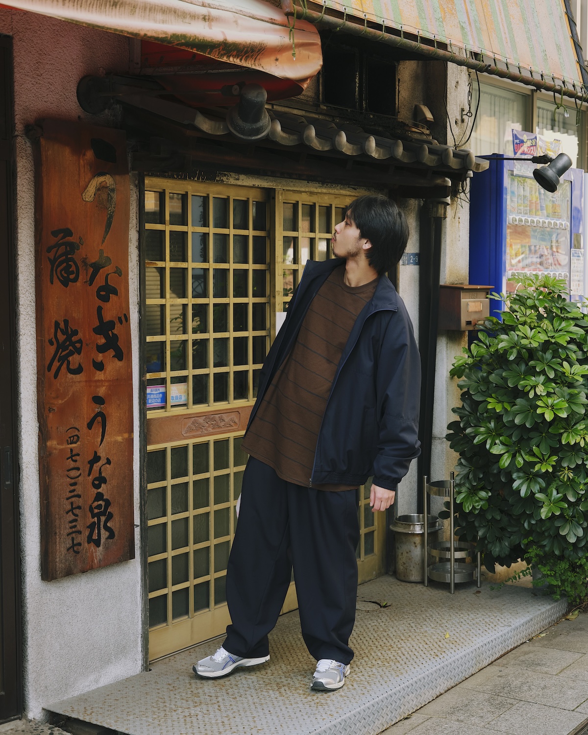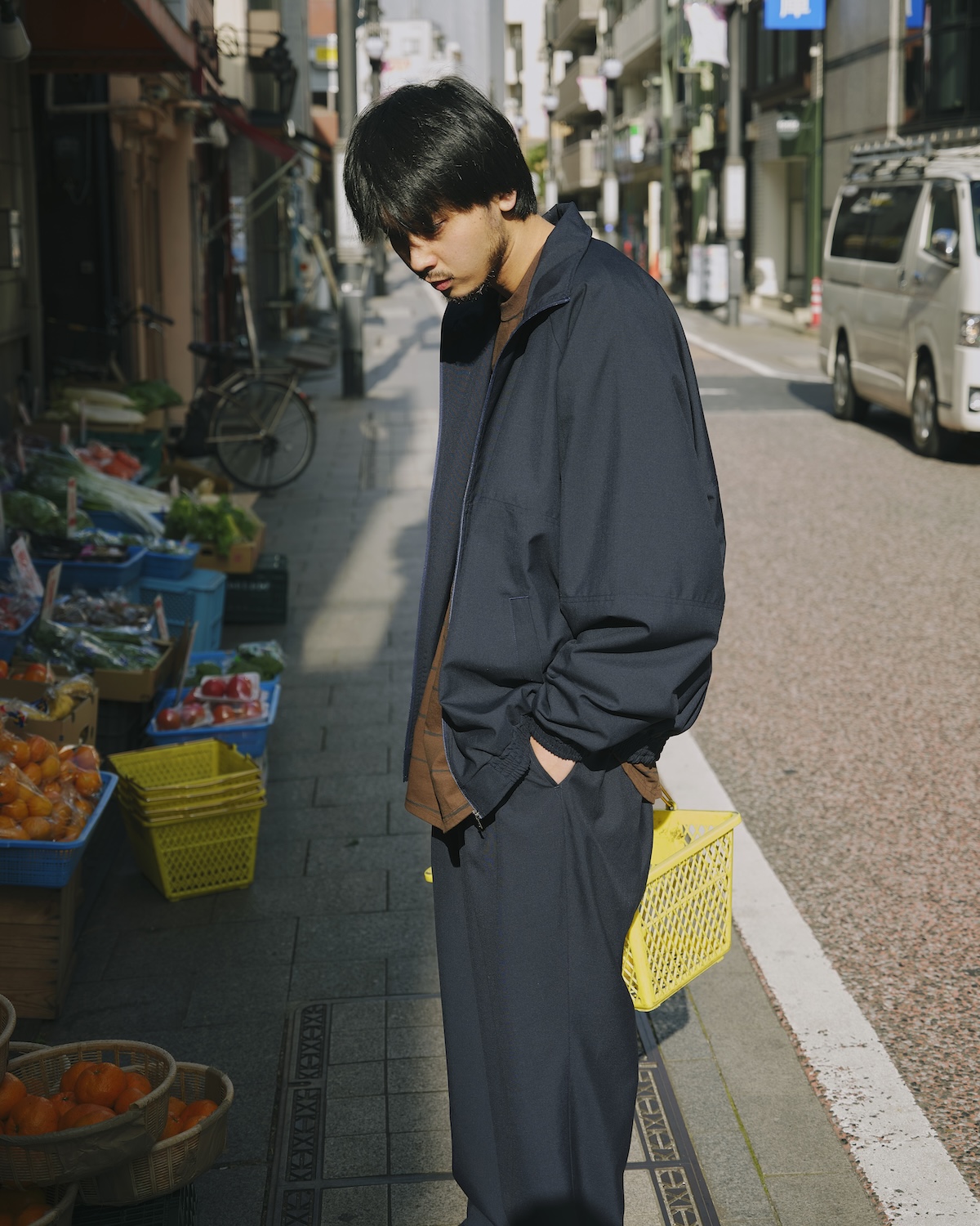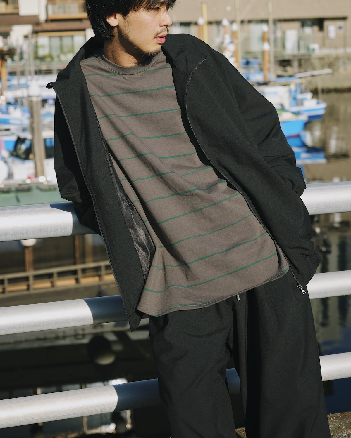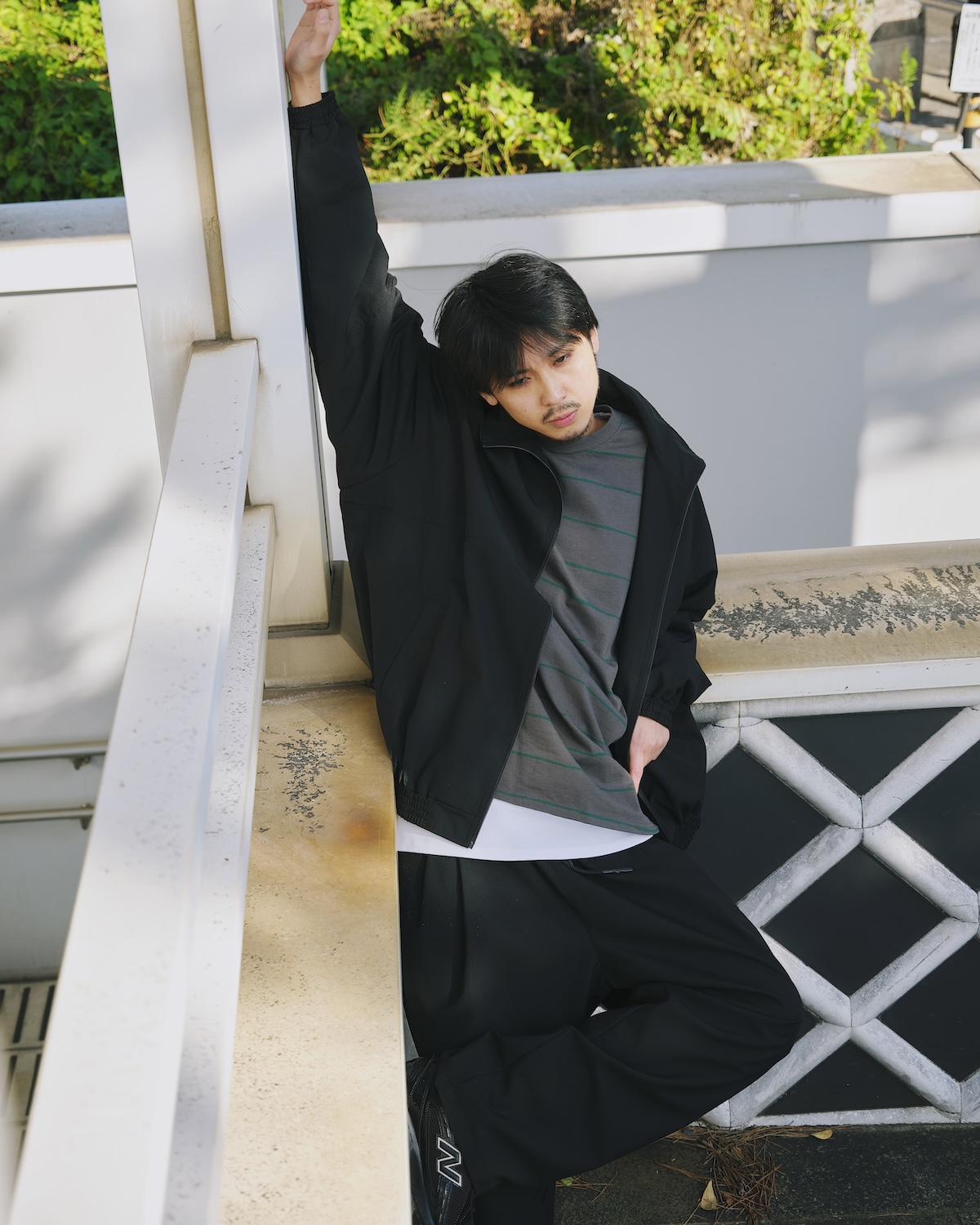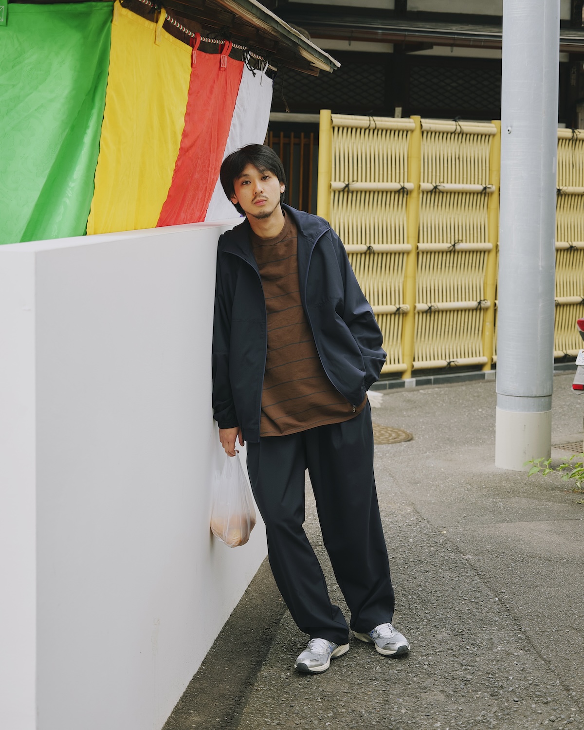 今回の別注では”24/7”のタイトル通り、年中無休で着用可能なショートブルゾン、ワイドパンツのセットアップ、オリジナルカラーのカットソーを製作。