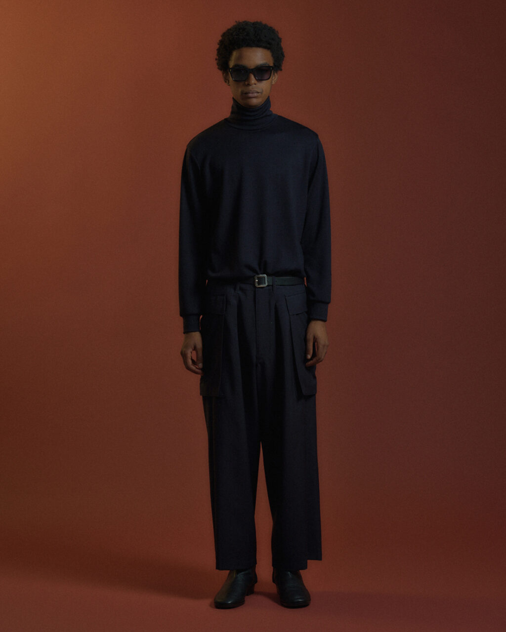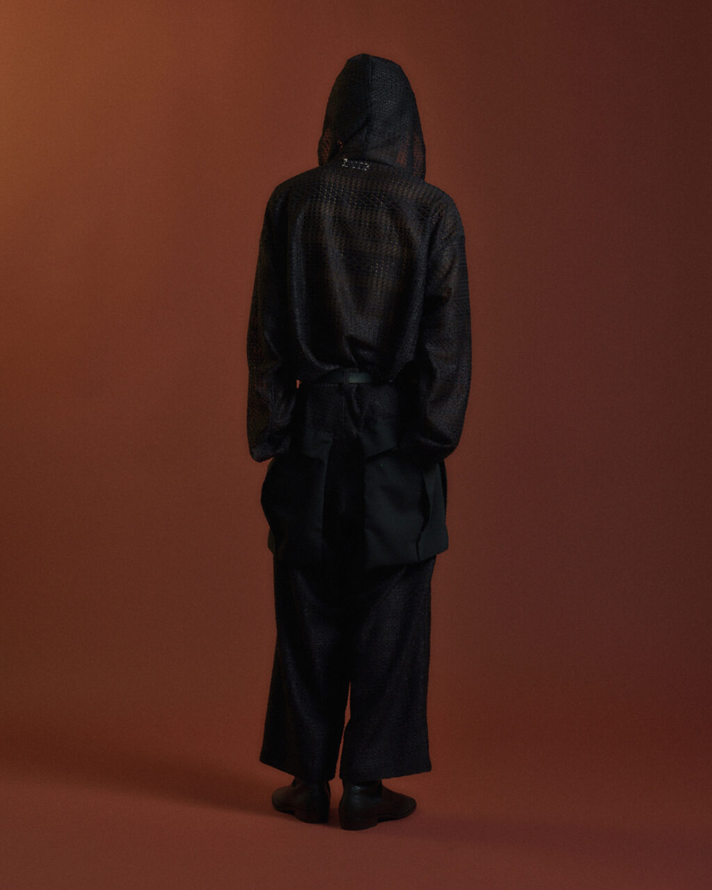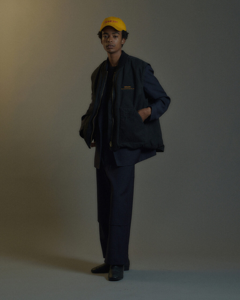 注目のファーストデリバリーでは、鎧を思わせるビッグシルエットのテーラードジャケットやフランス軍のM-47をモチーフにした共地のカーゴスラックス、ダック生地にダメージ加工を施したワークベスト、多色展開のロゴキャップなど、全9型のアイテムが登場。