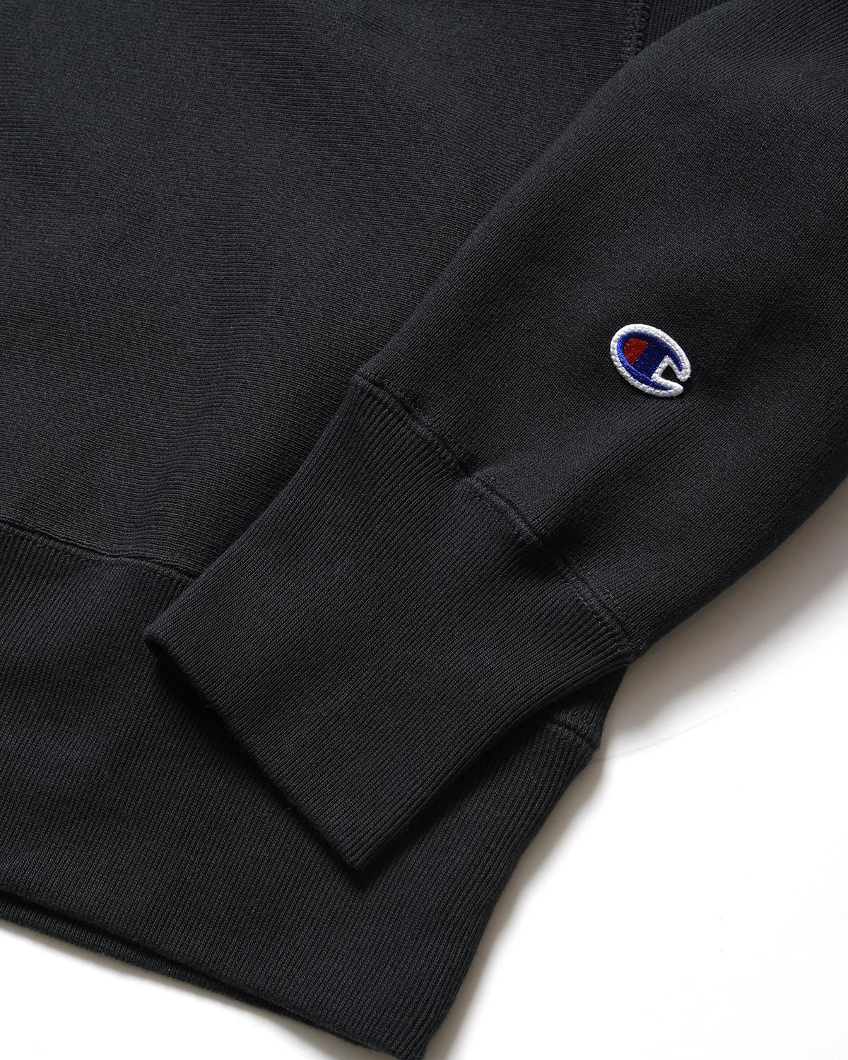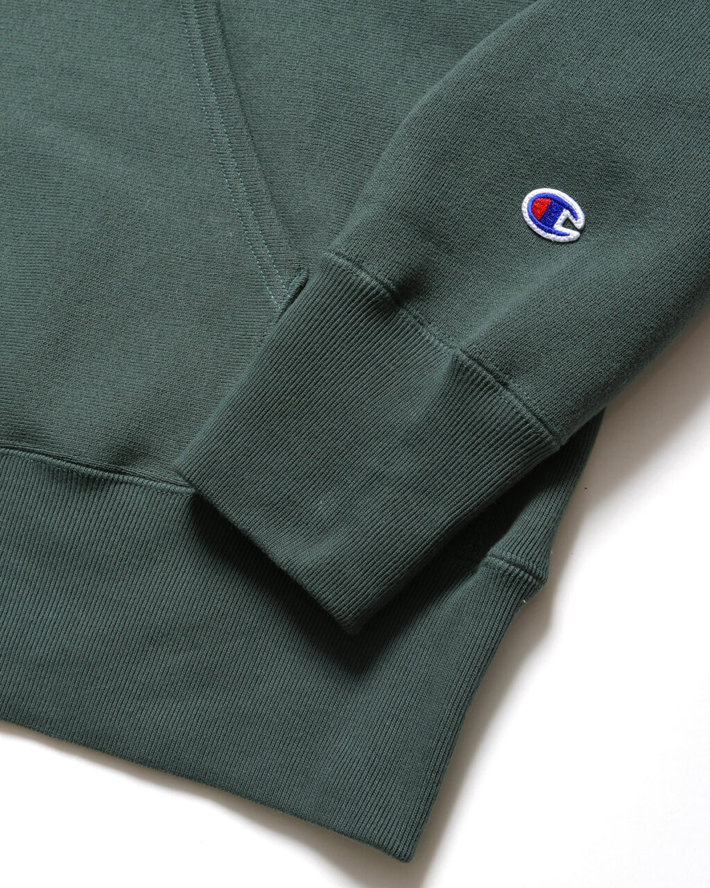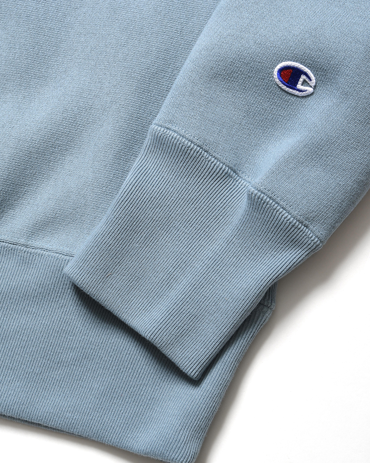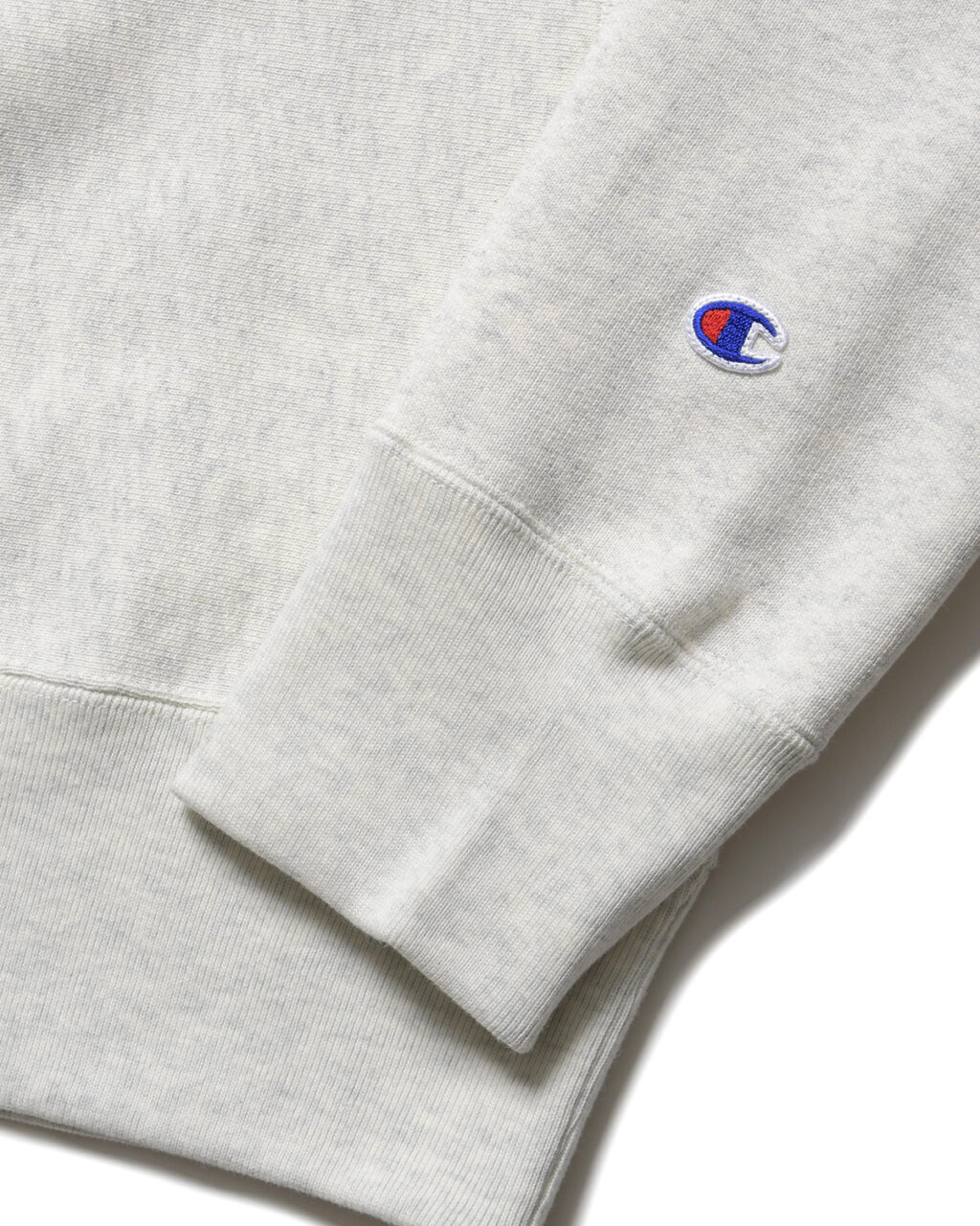 いずれも縦方向への縮みを抑えるリバースウィーブ製法を採用しており、胸元のロゴ刺繍と、 左袖のCロゴワッペンが効いた、ミニマルで洗練されたデザインに仕上がっている。
